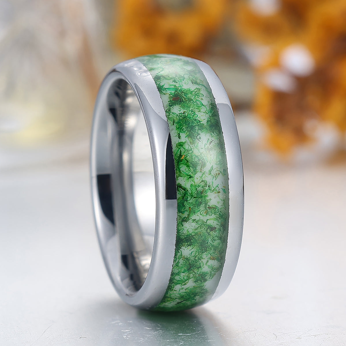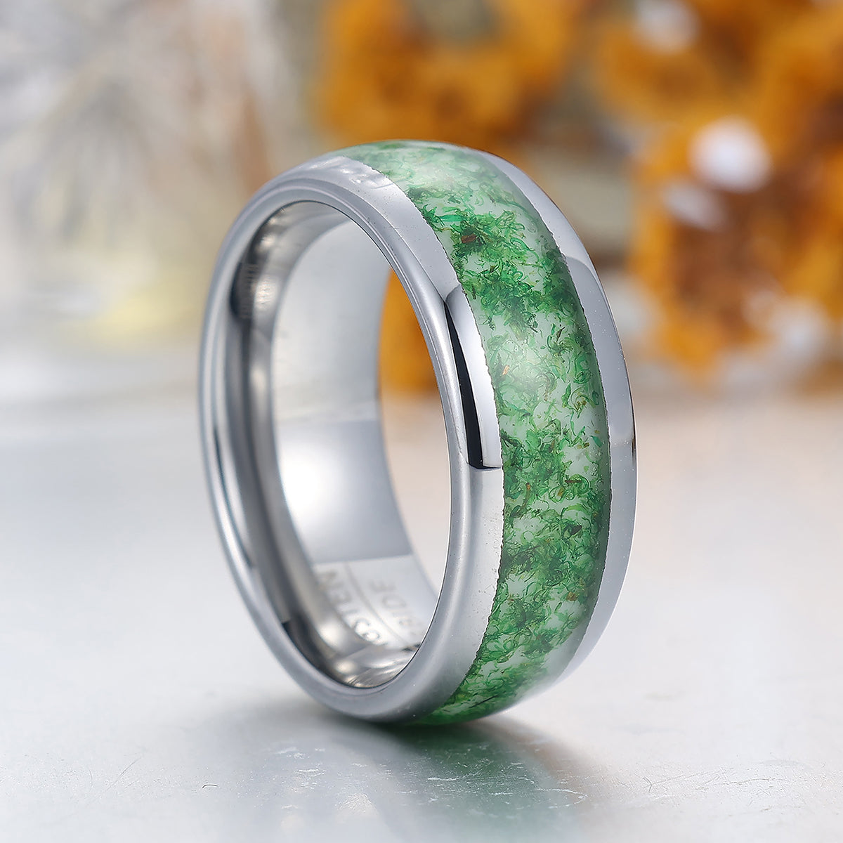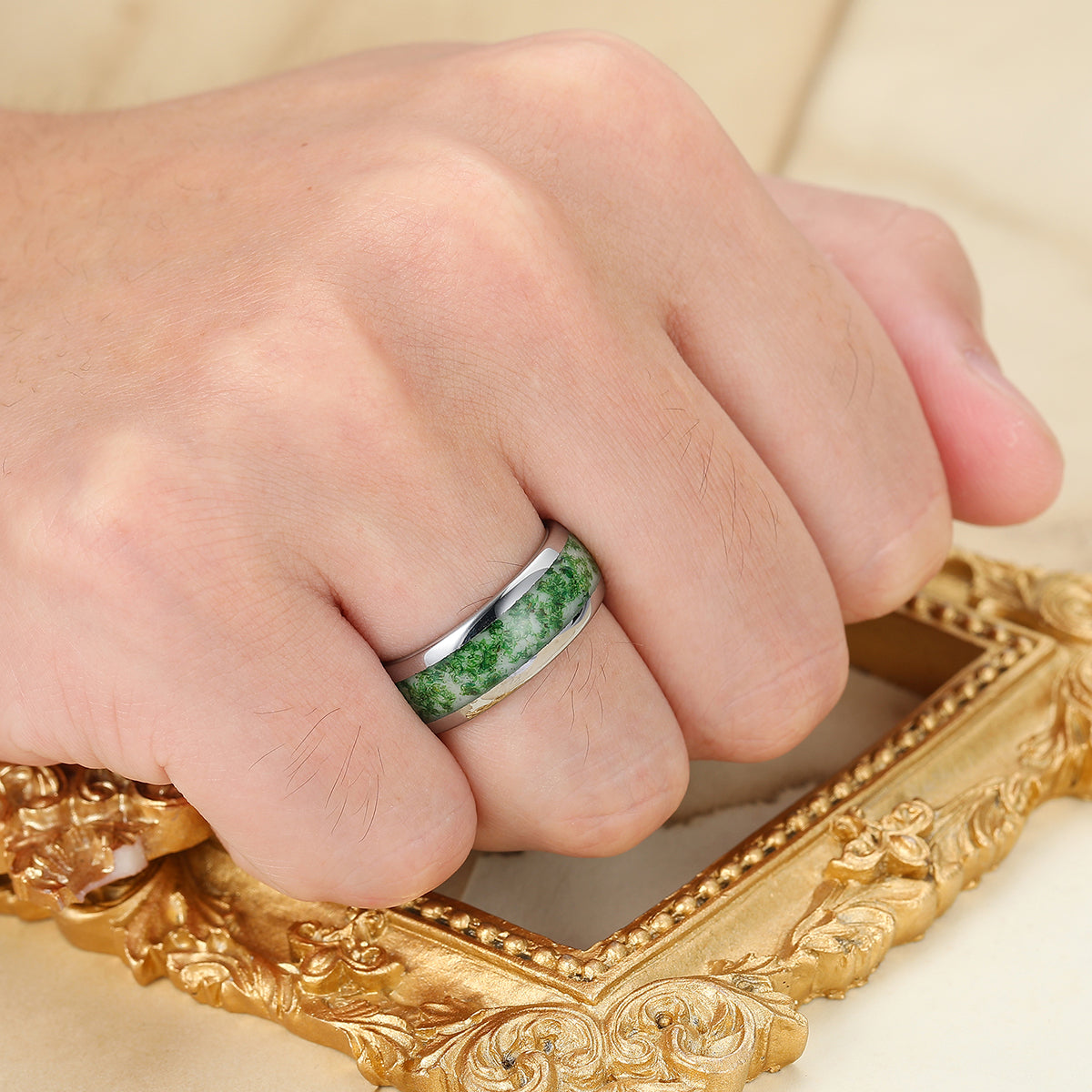 Green Moss Agate Inlaid Men's Tungsten Ring 8mm Wide Silver Plated Tungsten Band