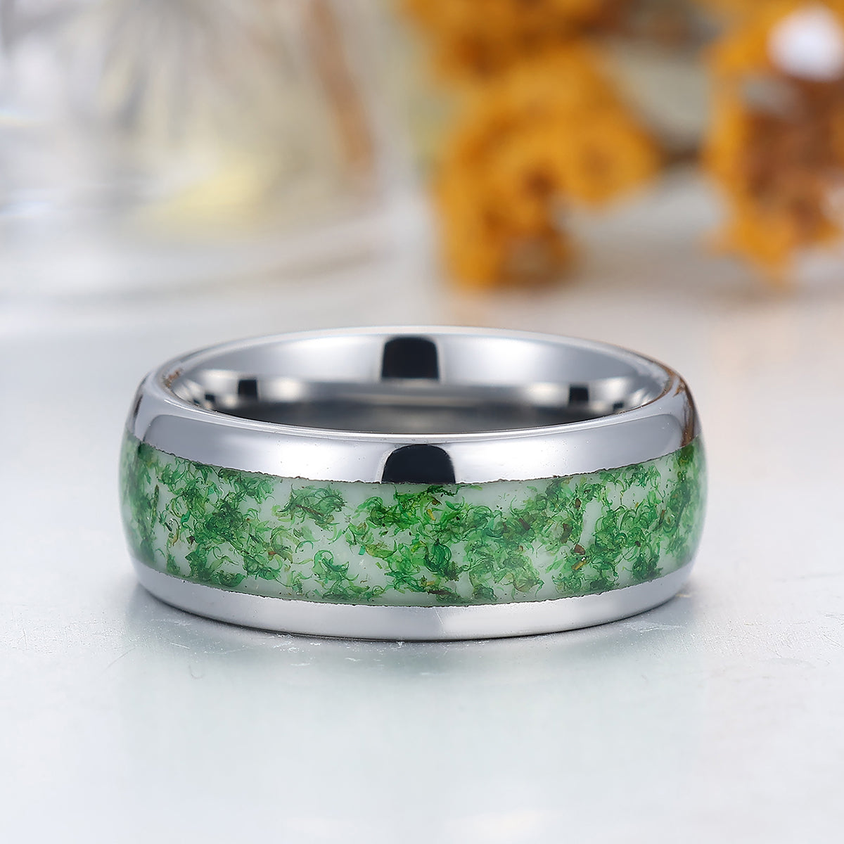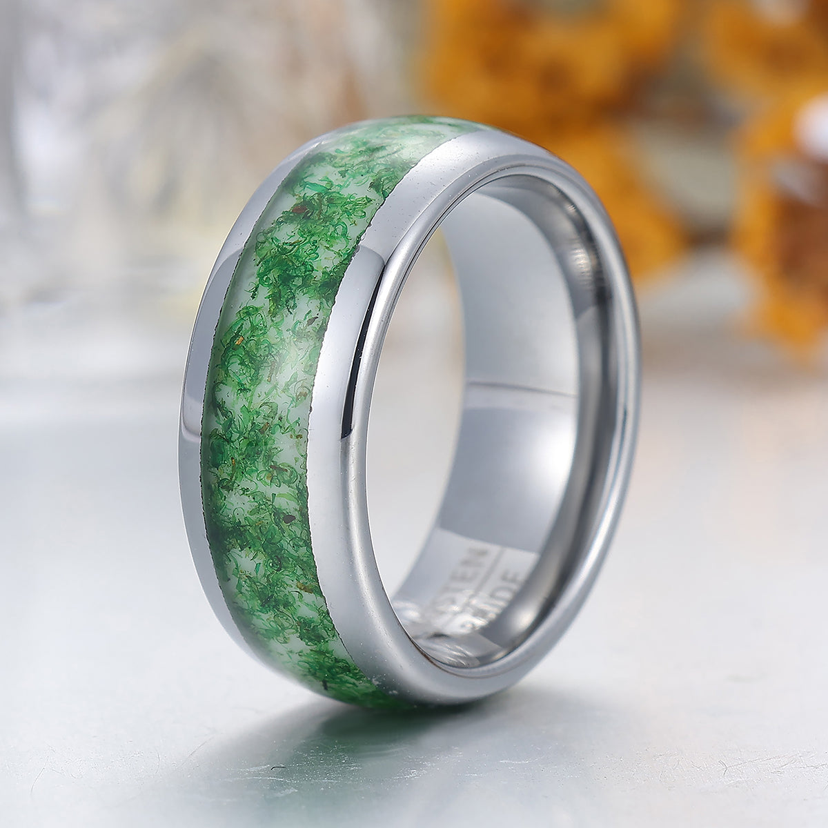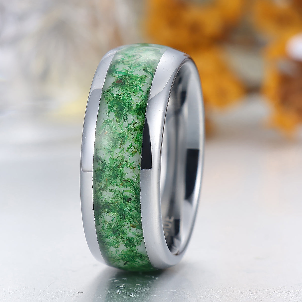 Green Moss Agate Inlaid Men's Tungsten Ring 8mm Wide Silver Plated Tungsten Band