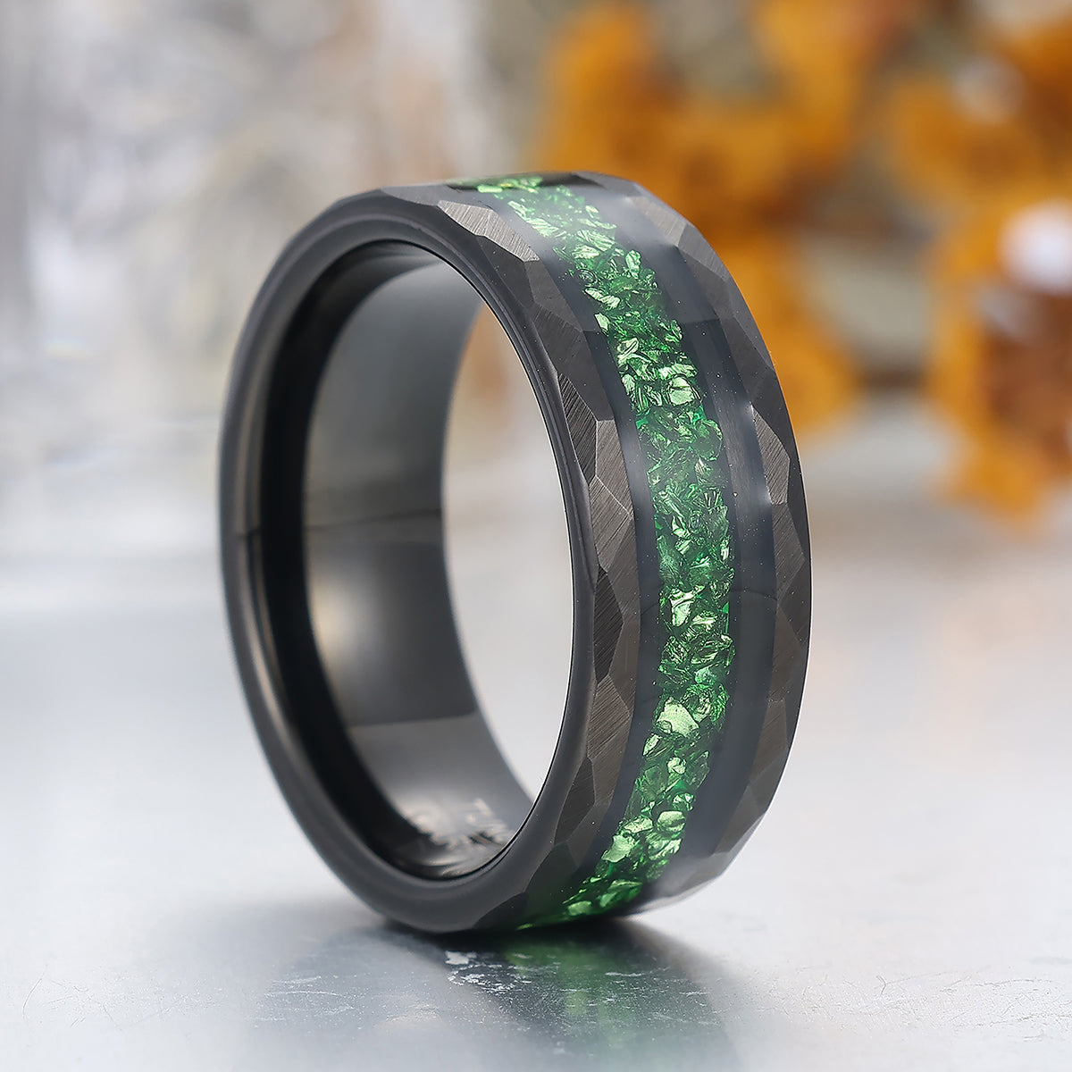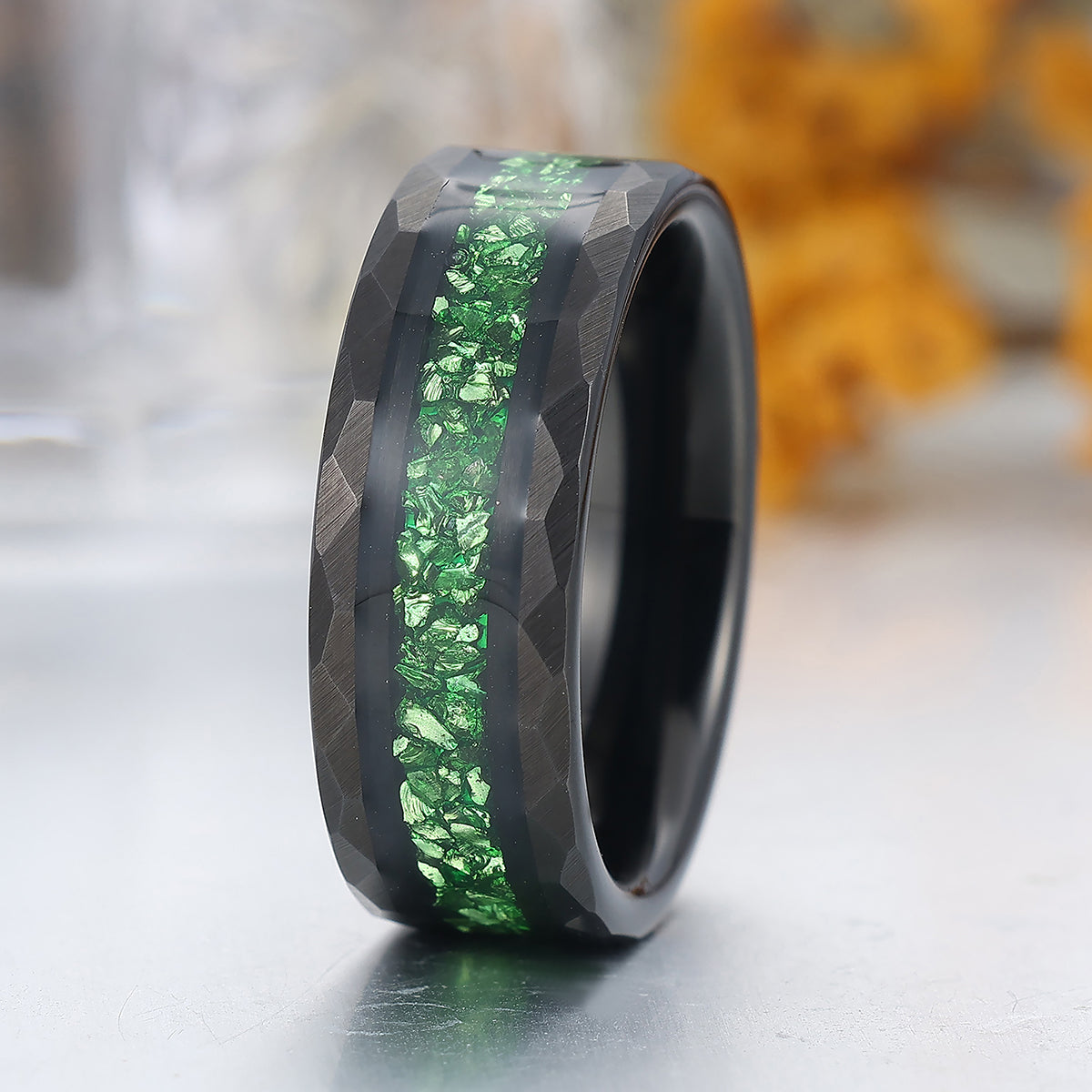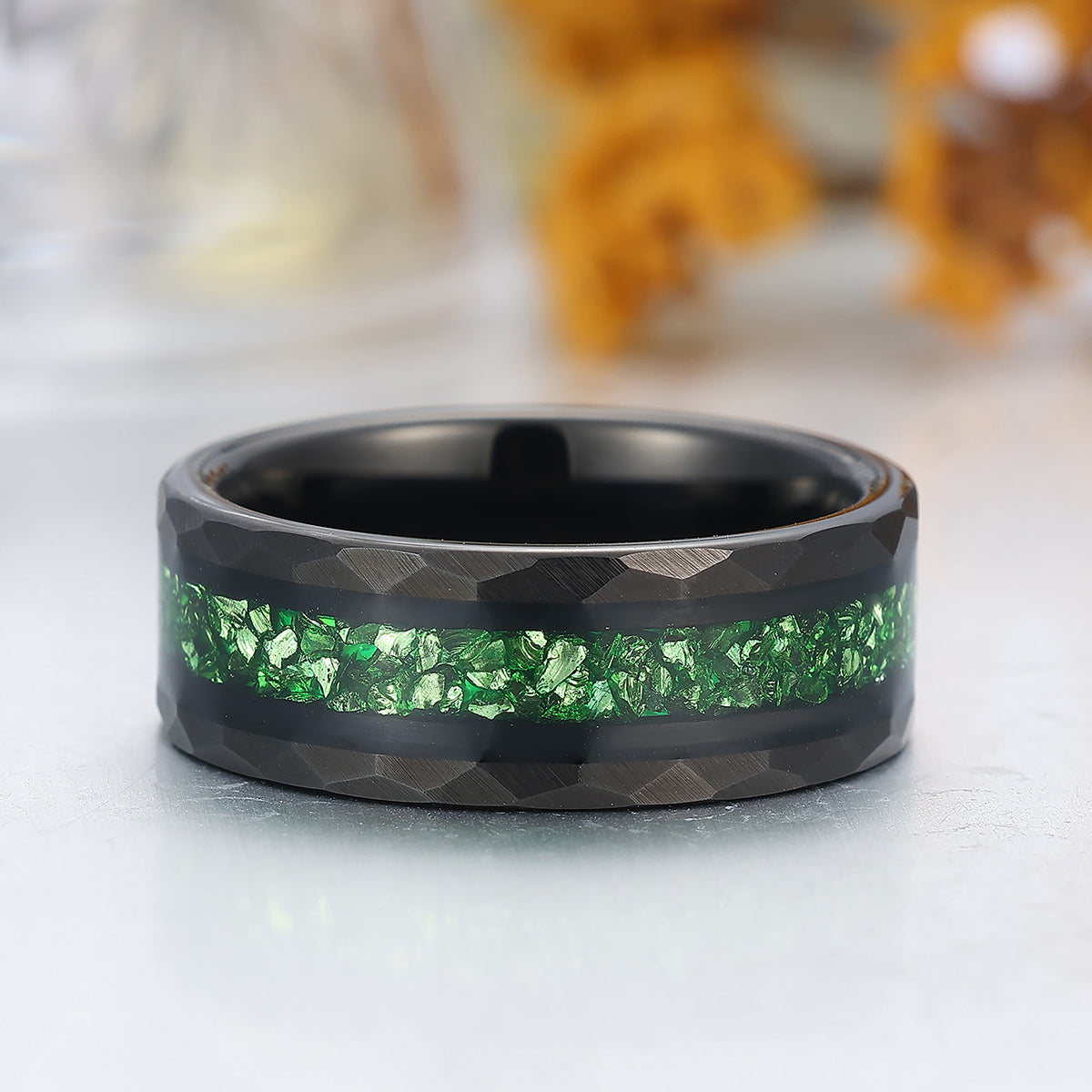 Hammered Emerald Mens Tungsten Band Green Gemstone And Black Tungsten Ring Anniversary Ring