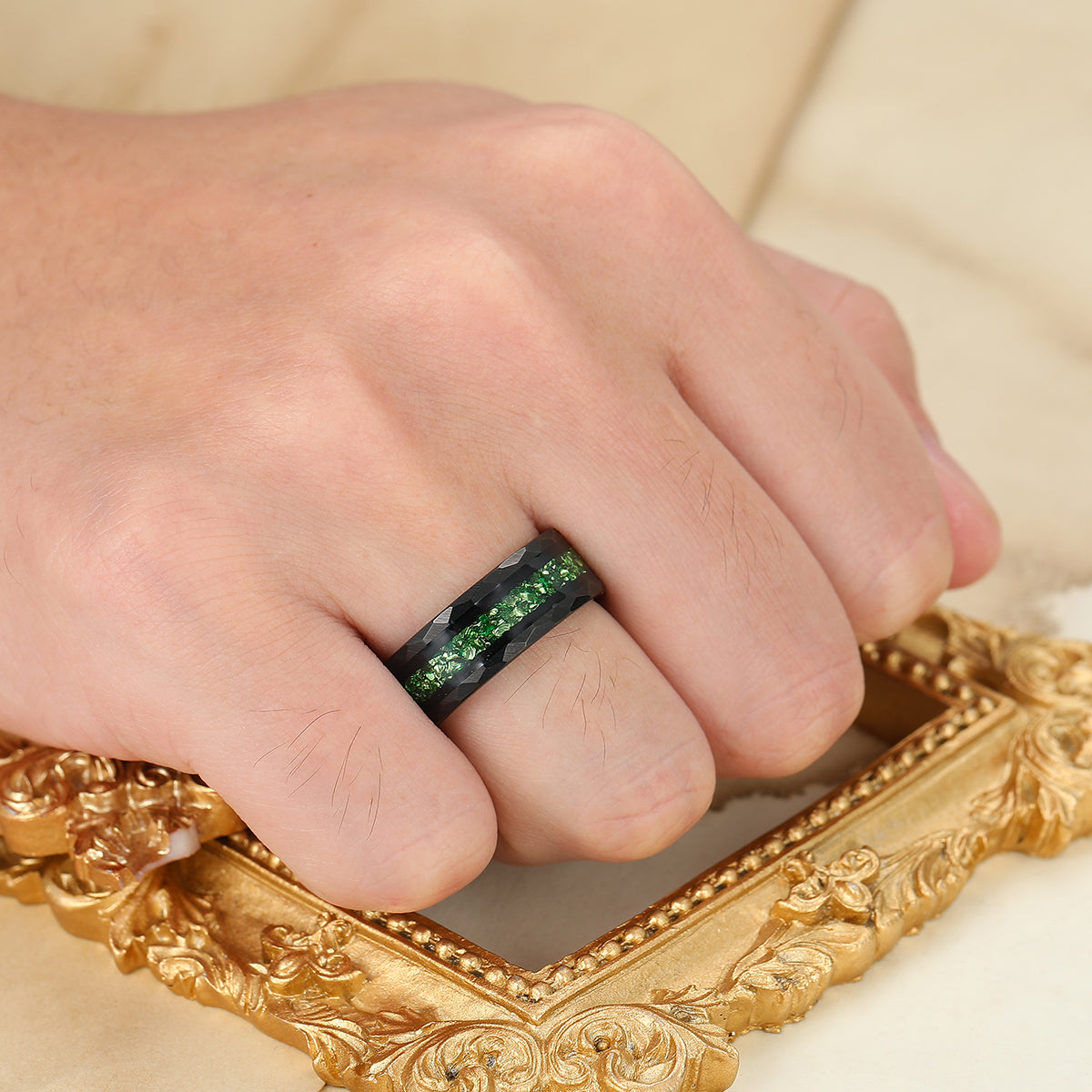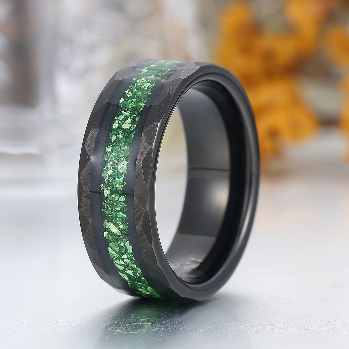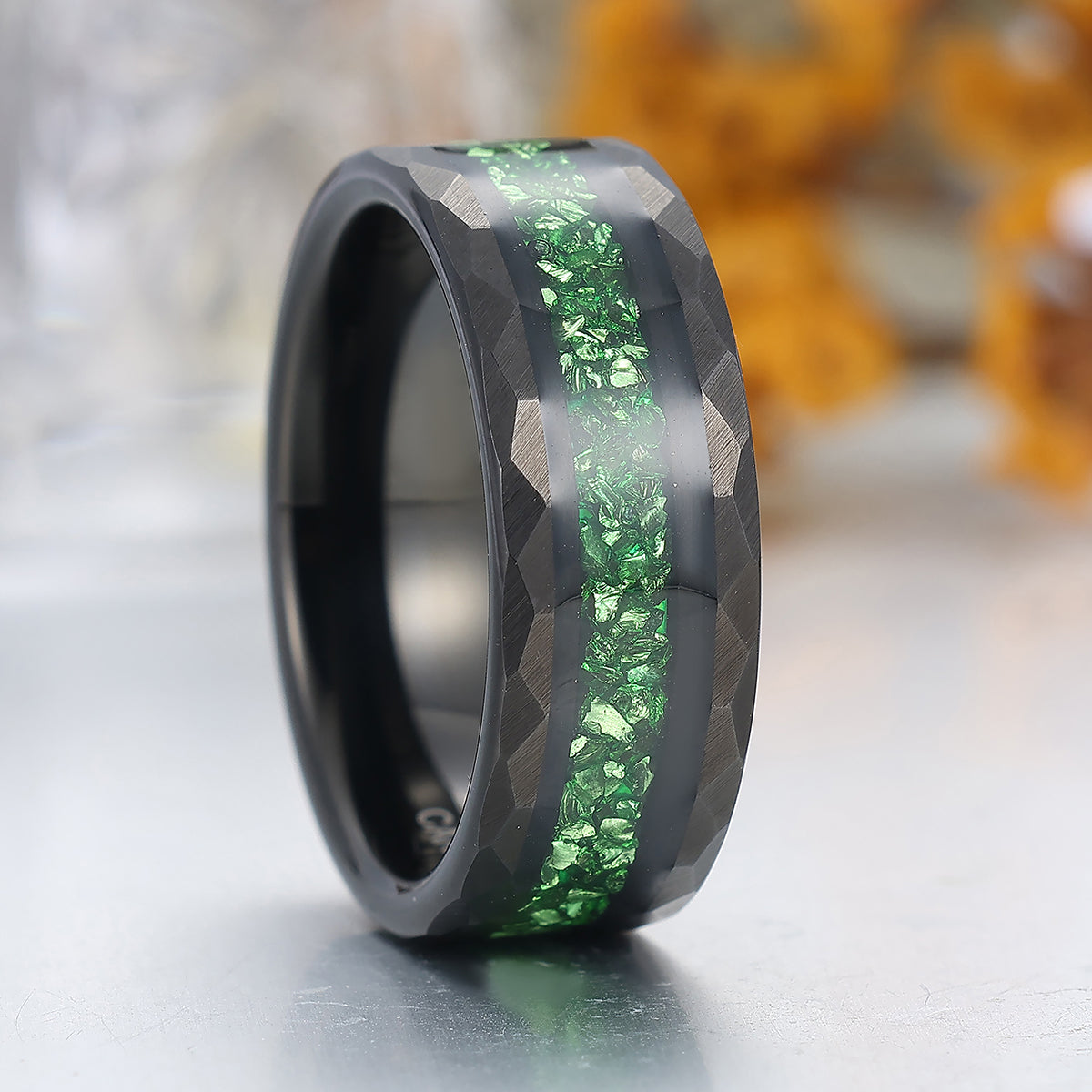 Hammered Emerald Mens Tungsten Band Green Gemstone And Black Tungsten Ring Anniversary Ring