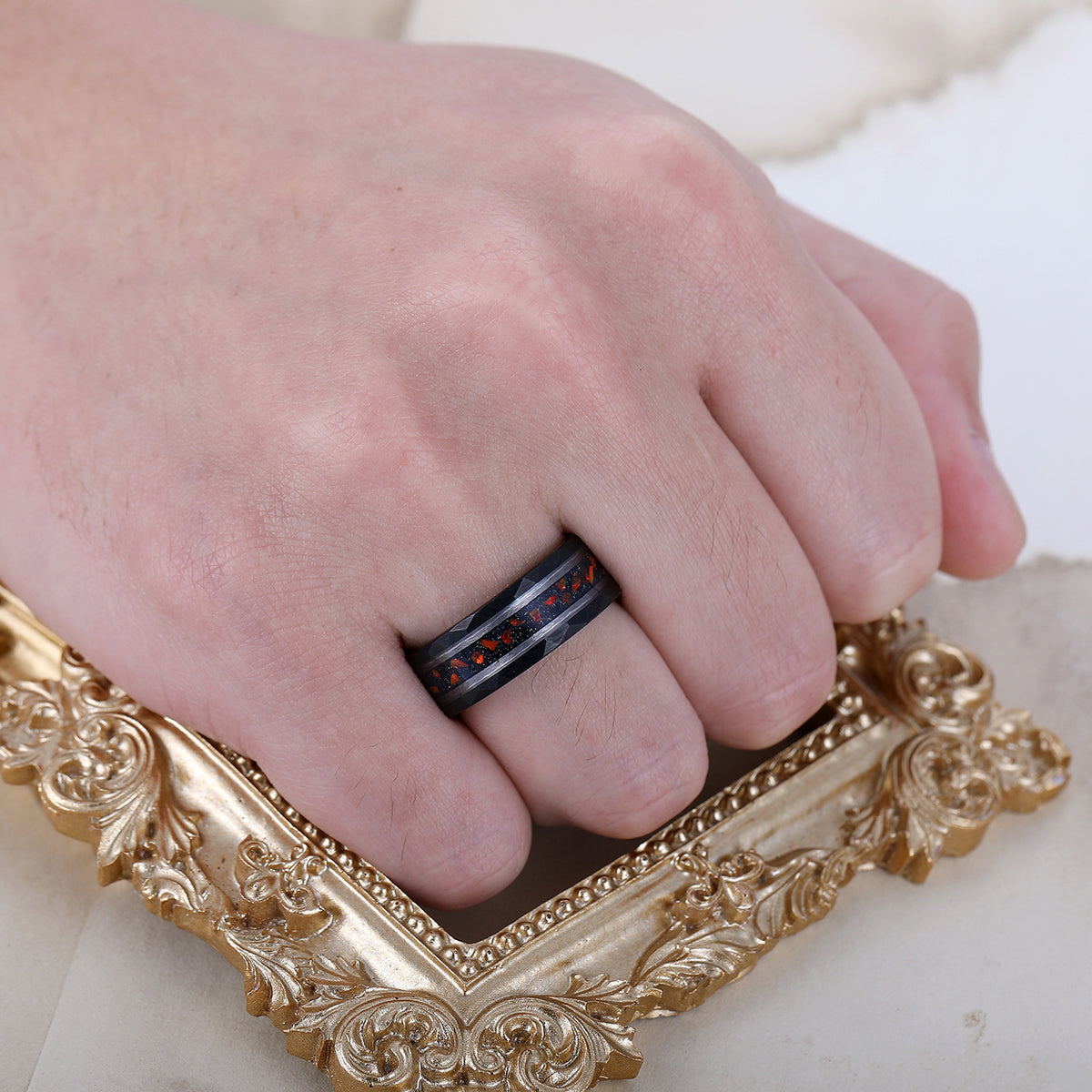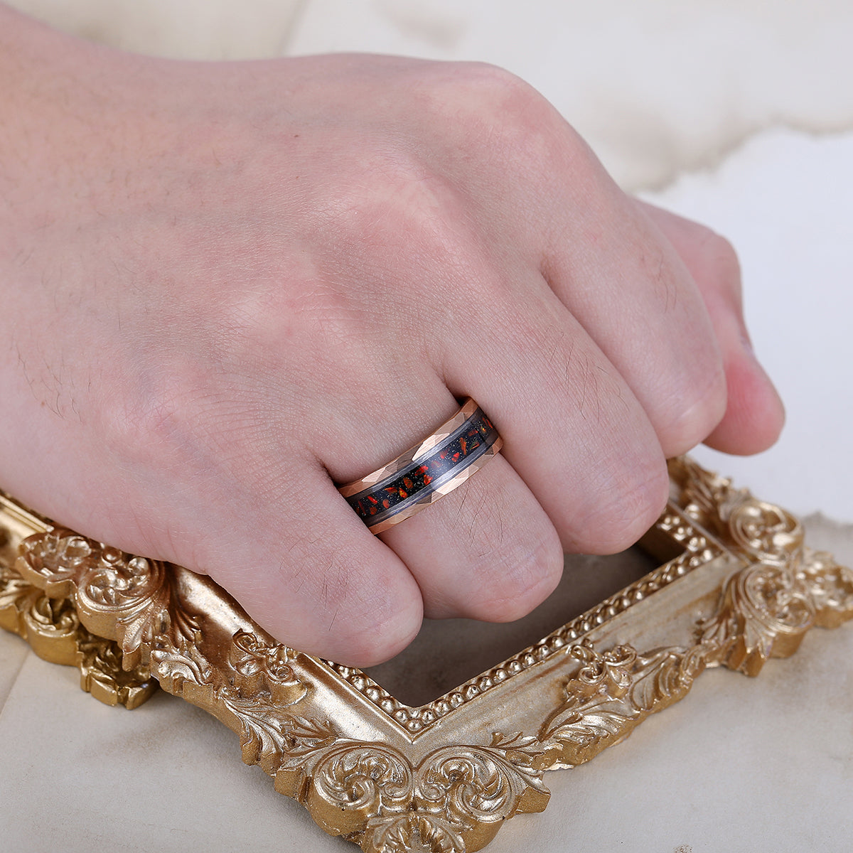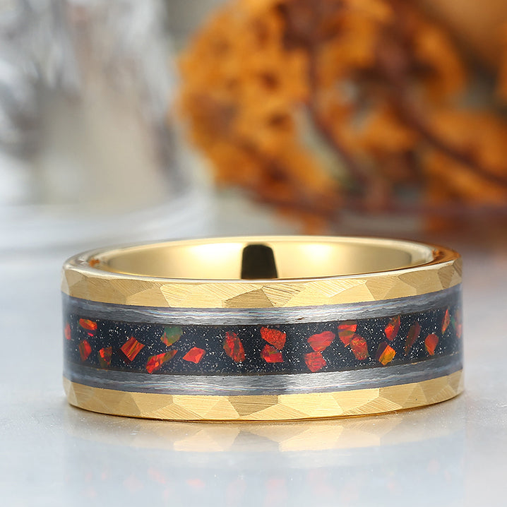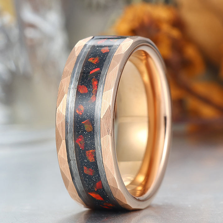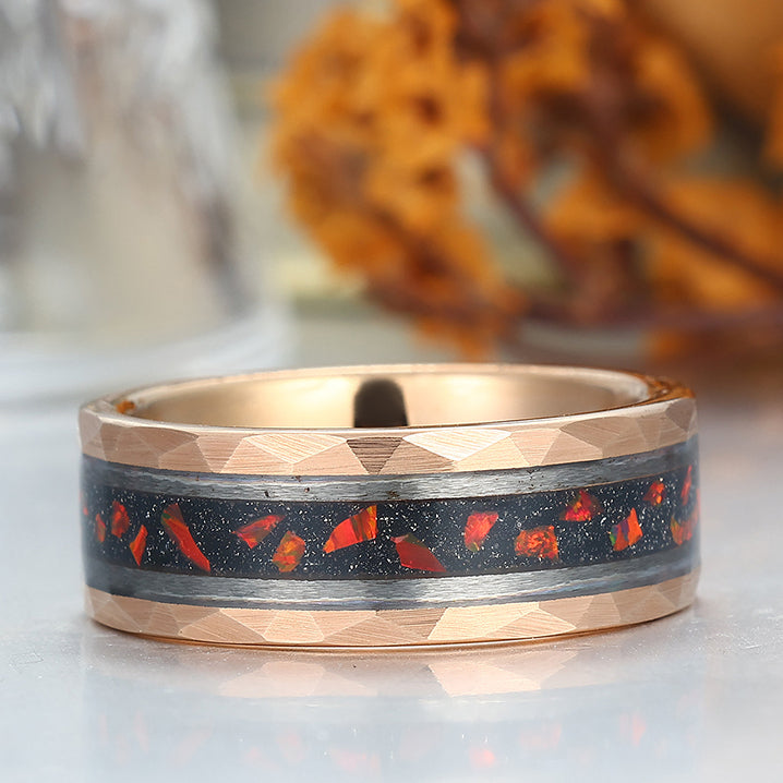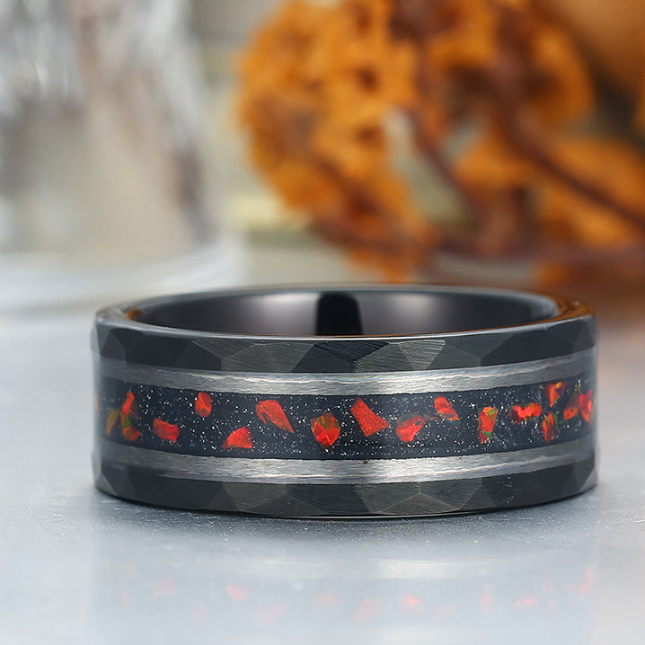 Hammered Red Opal 8mm Wide Men' s Tungsten Wedding Band Stylish Unisex Ring