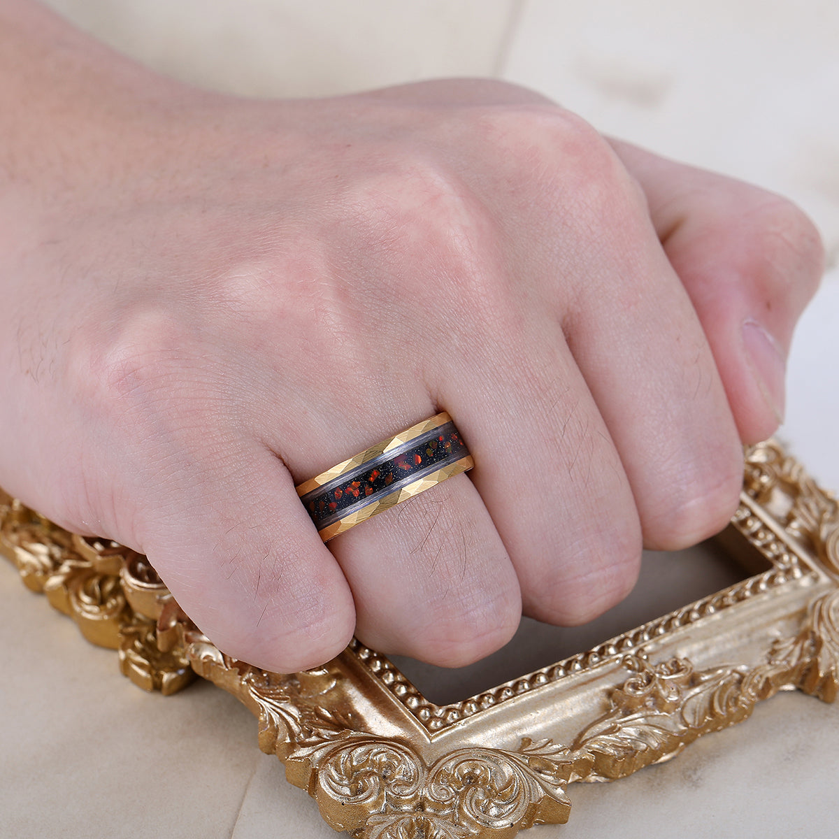 Metal Type: Tungsten Carbide - Crushed Red Opal and Two Silver Lines Inlay - Hypoallergenic