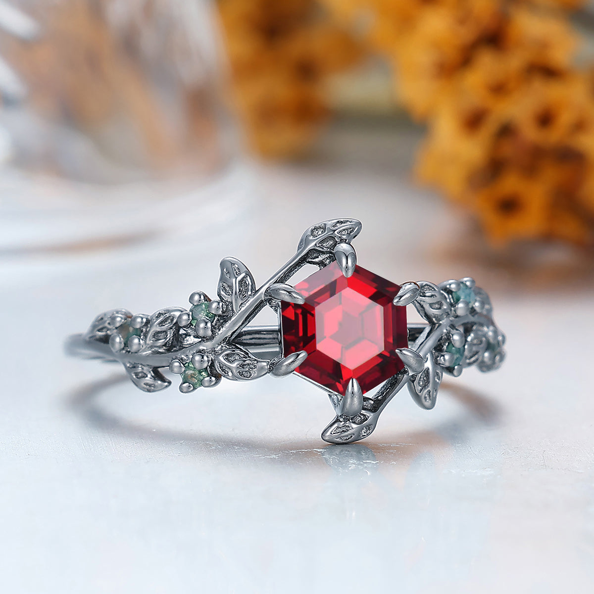 Leaf Design 14k Black Gold Inspiration Hexagon Cut Natural Moss Agate Engagement Leaf Shape Ring For Anniversary Gift