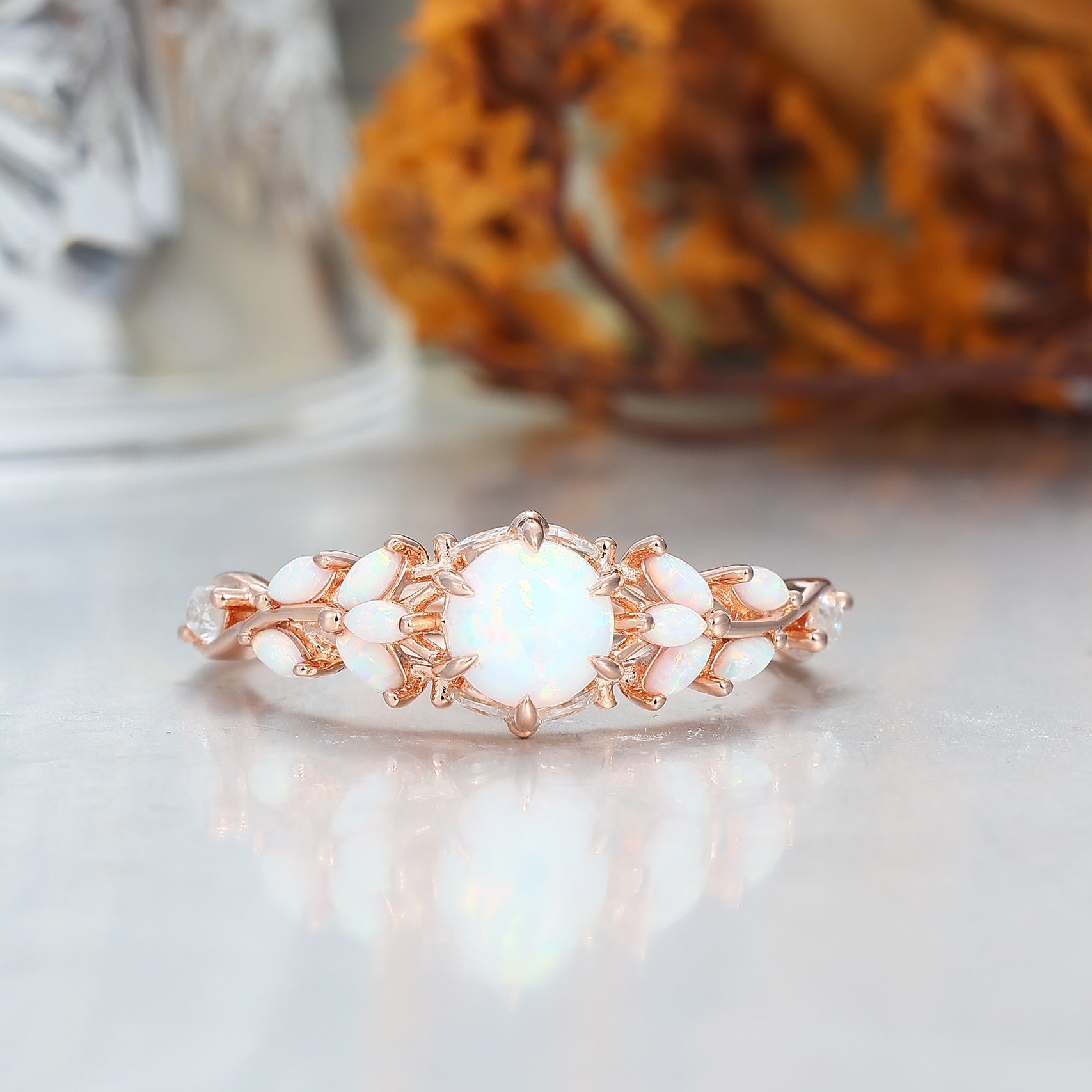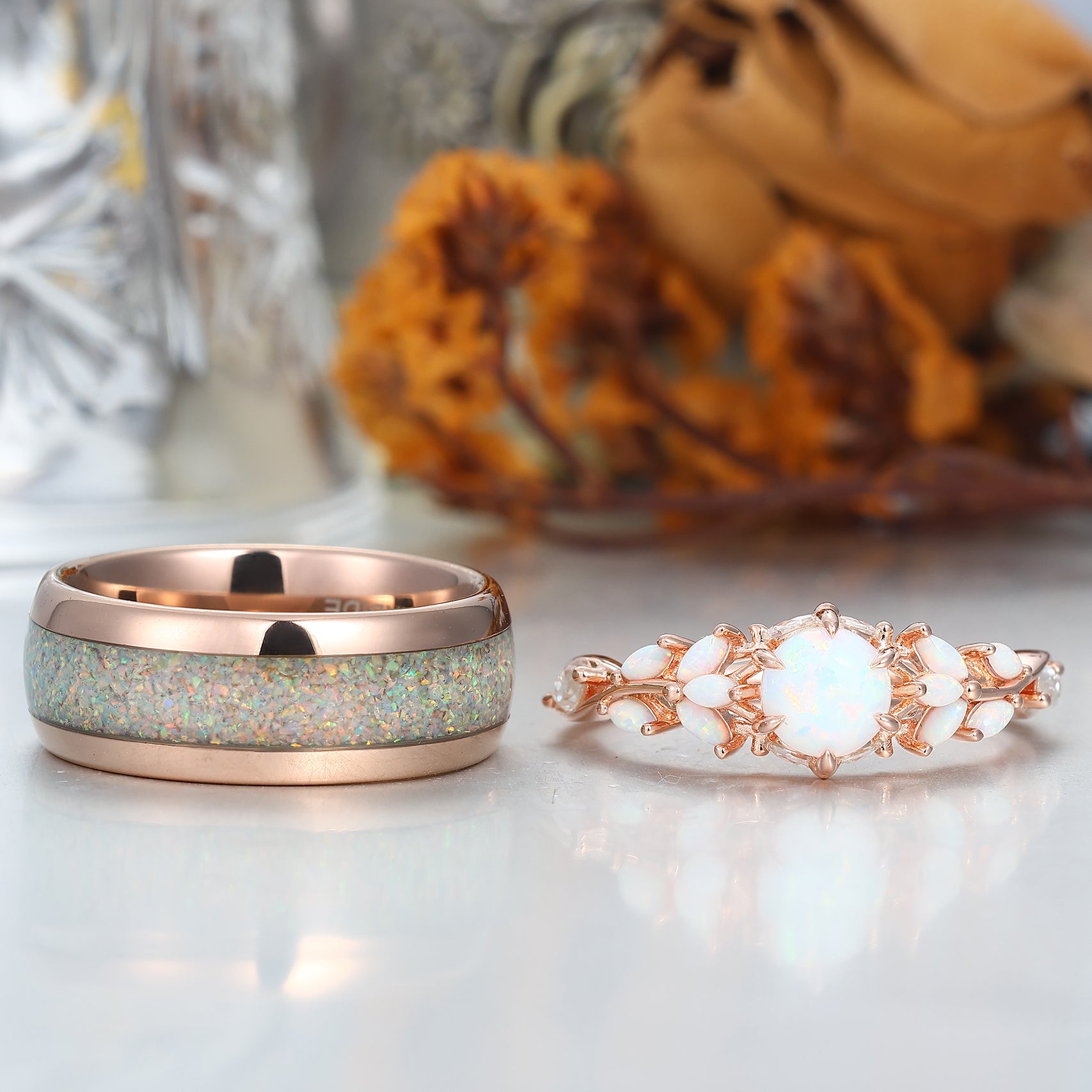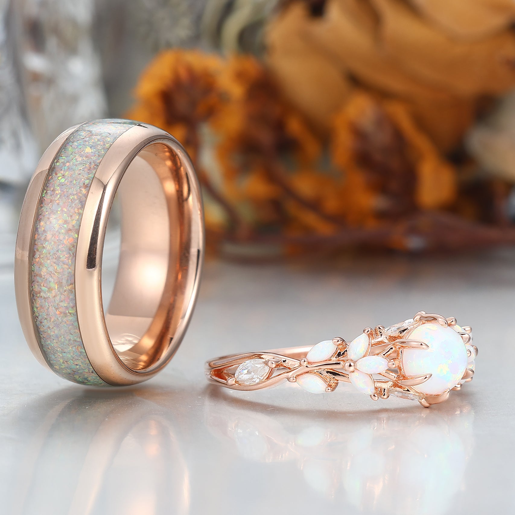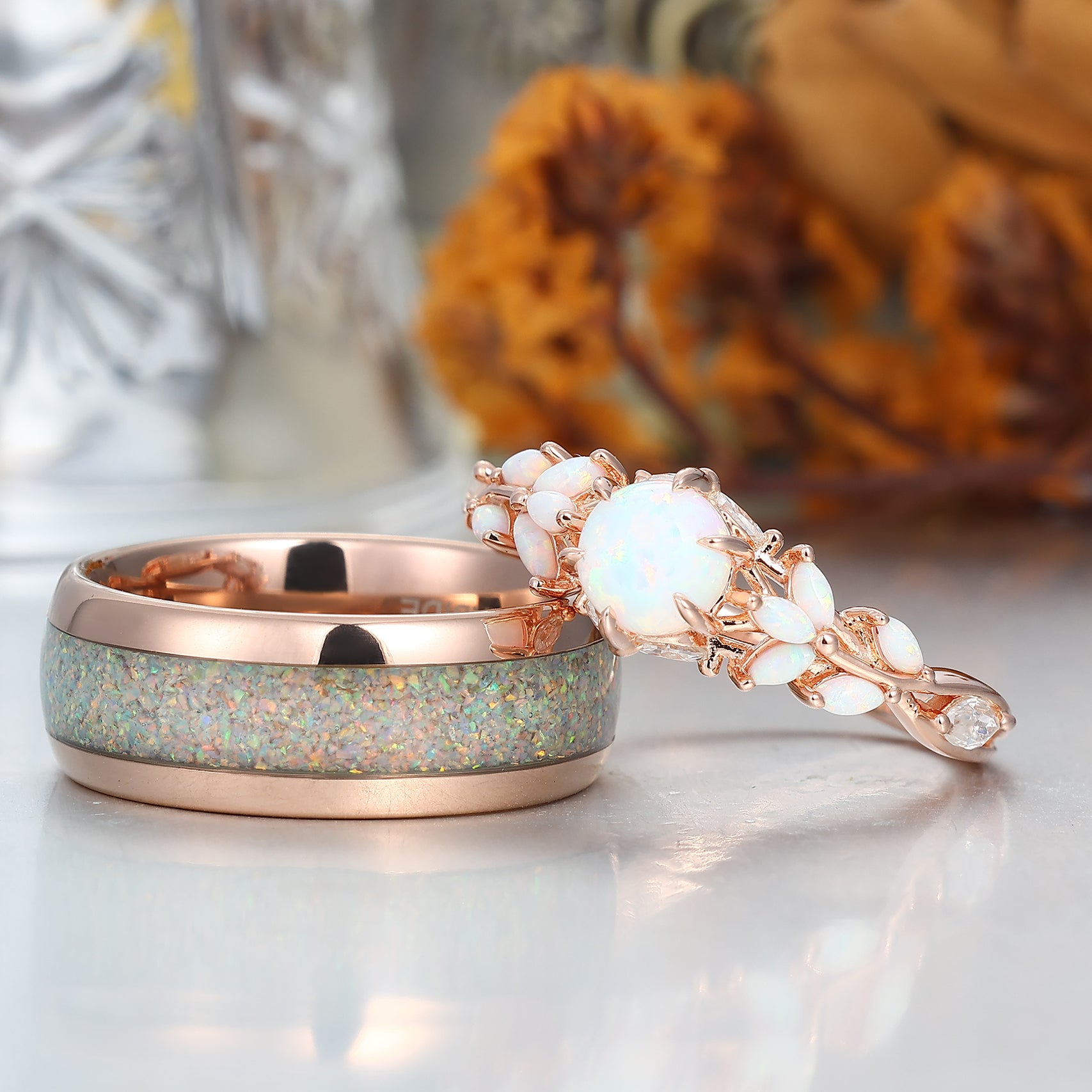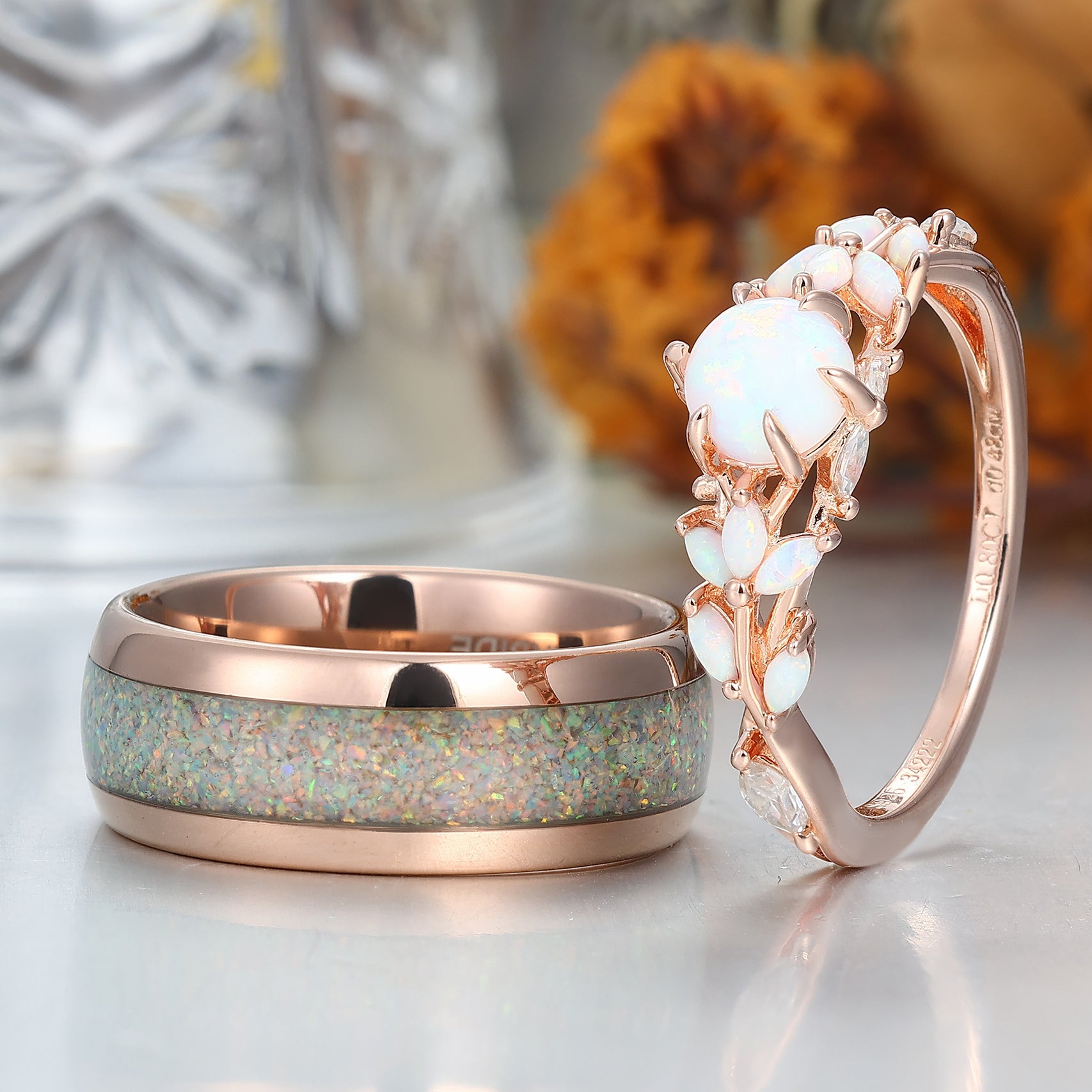 Leaf Design Pink White Opal Couples Ring Set Rose Gold Plated Matching Promise His and Hers Wedding Rings