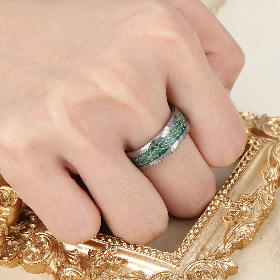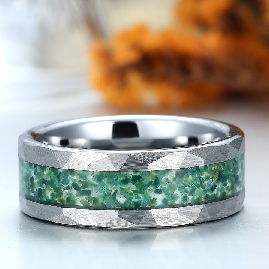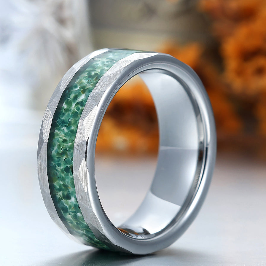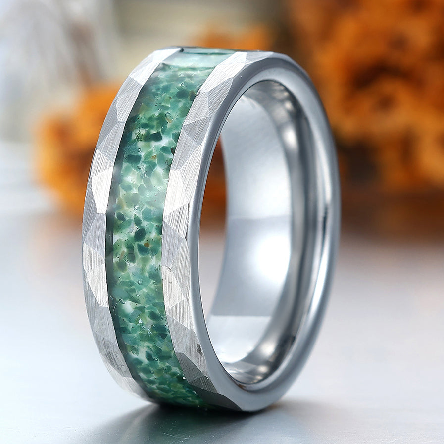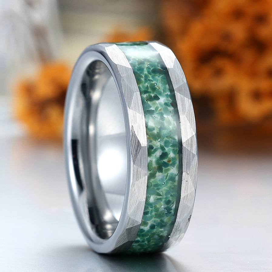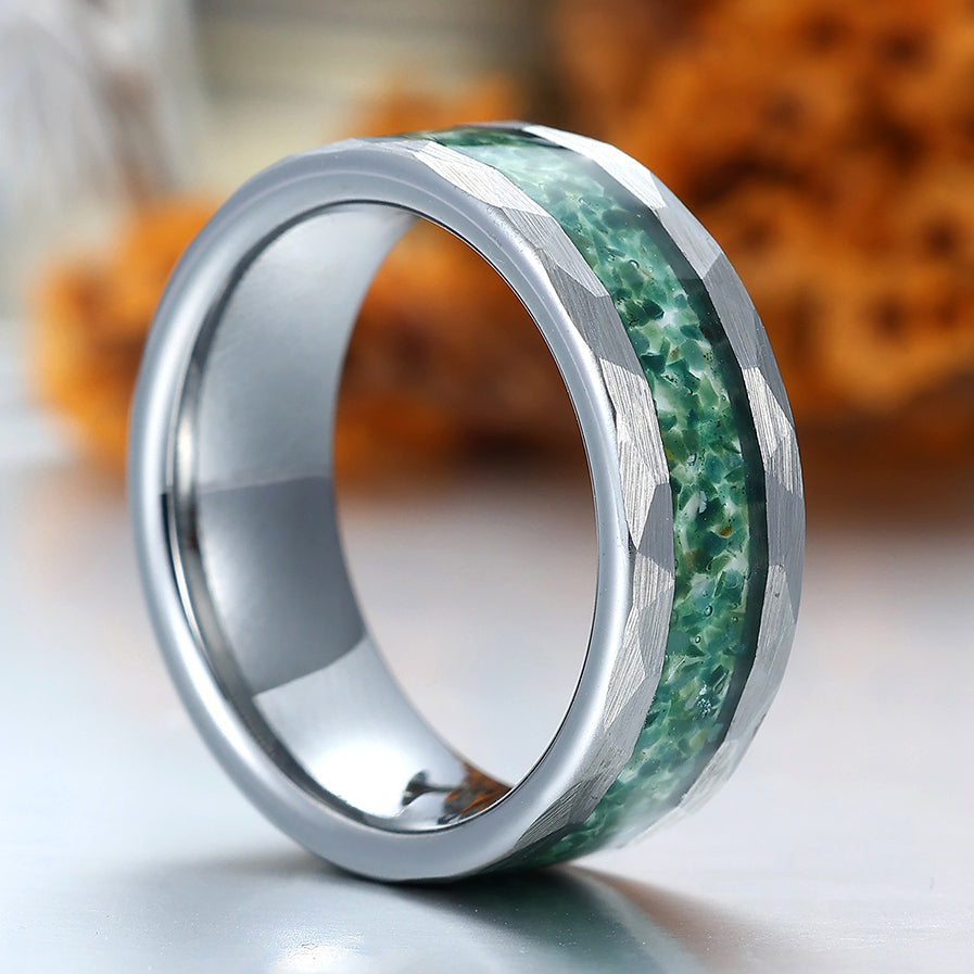 Men's Hammered Moss Agate Ring Tungsten Ring for Men and Women Unisex Birthday Ring
