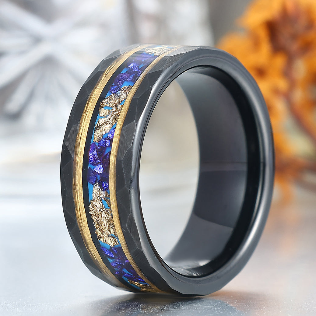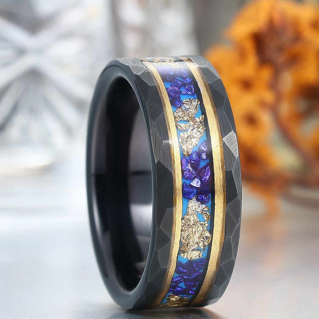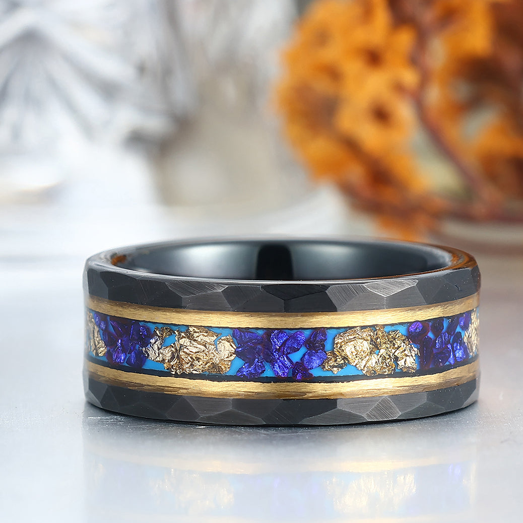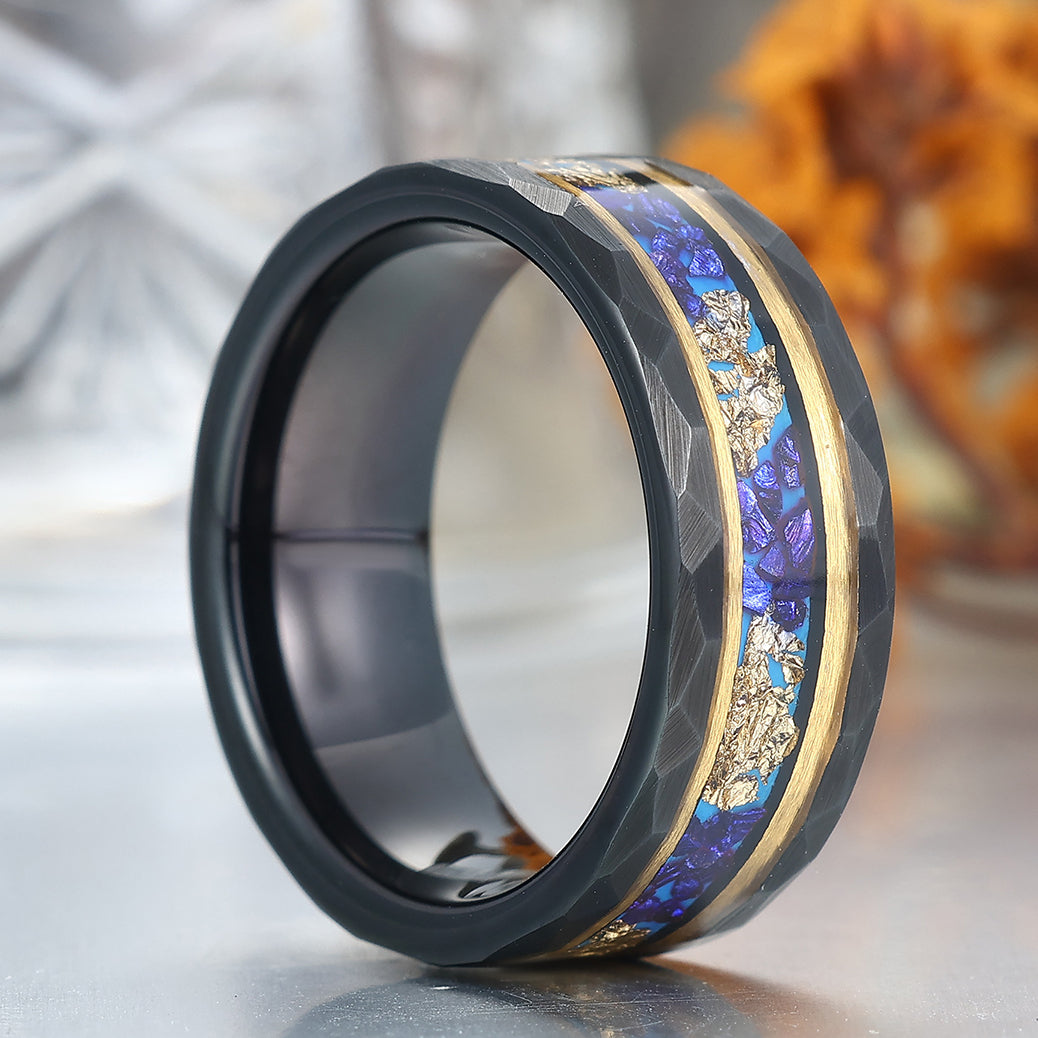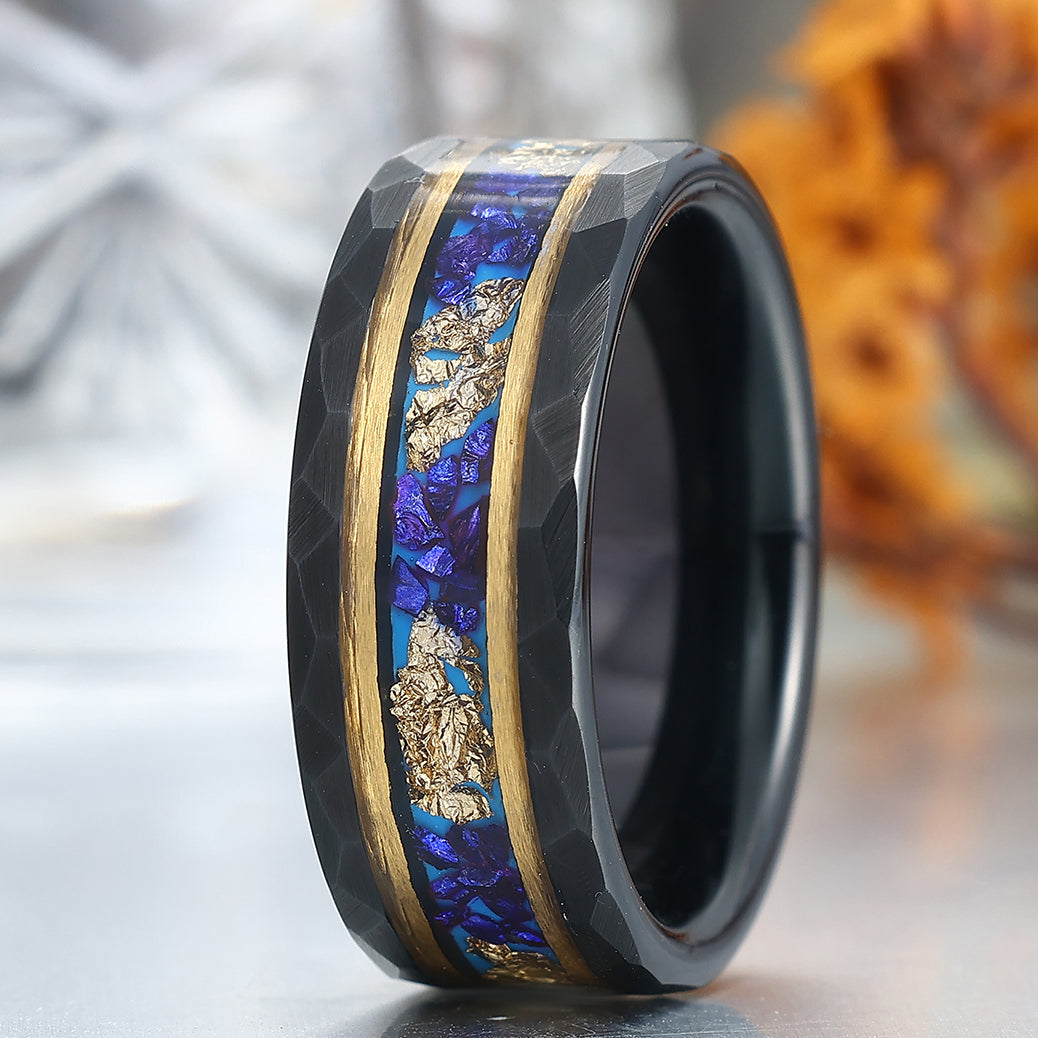 Men's Hammered Sapphire And Gold Foils Inlay Black Tungsten Carbide Wedding Band
