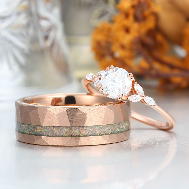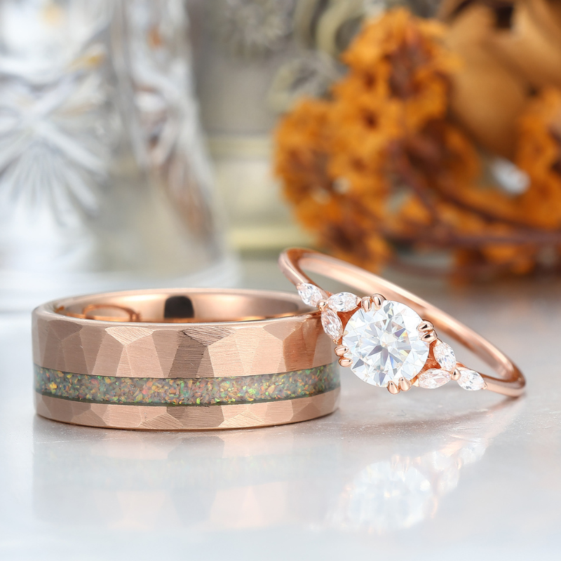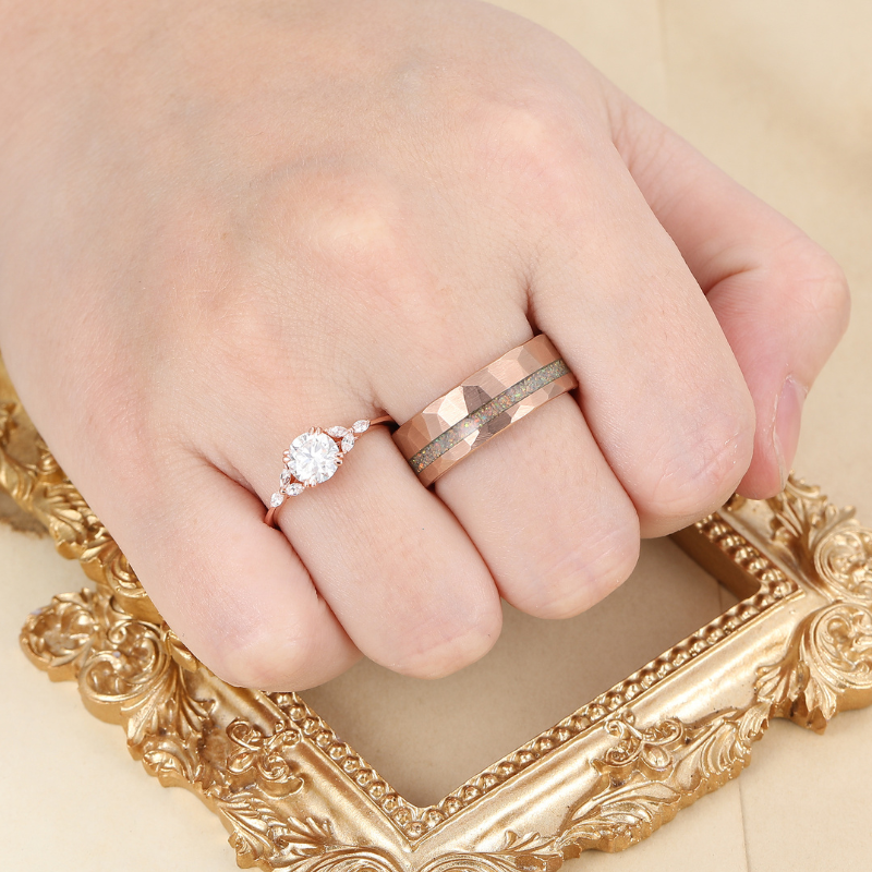 Minimalist Round Cut Moissanite Couples Ring Set S925 Gold Plated And Rhombic Tungsten Matching Ring