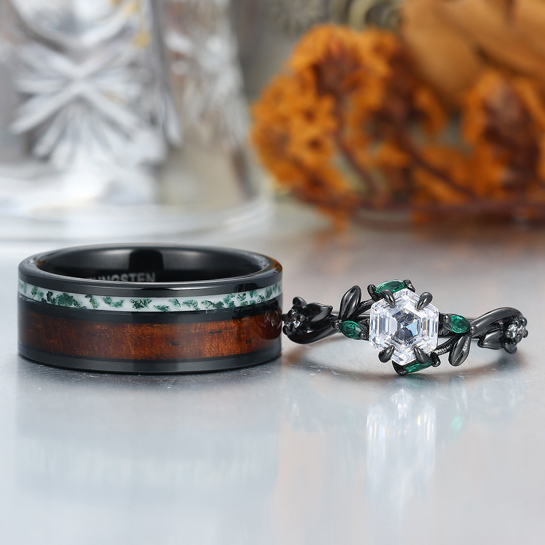 Moissanite Sprigs Engagement Couple Rings Wood Tungsten Matching Wedding Rings