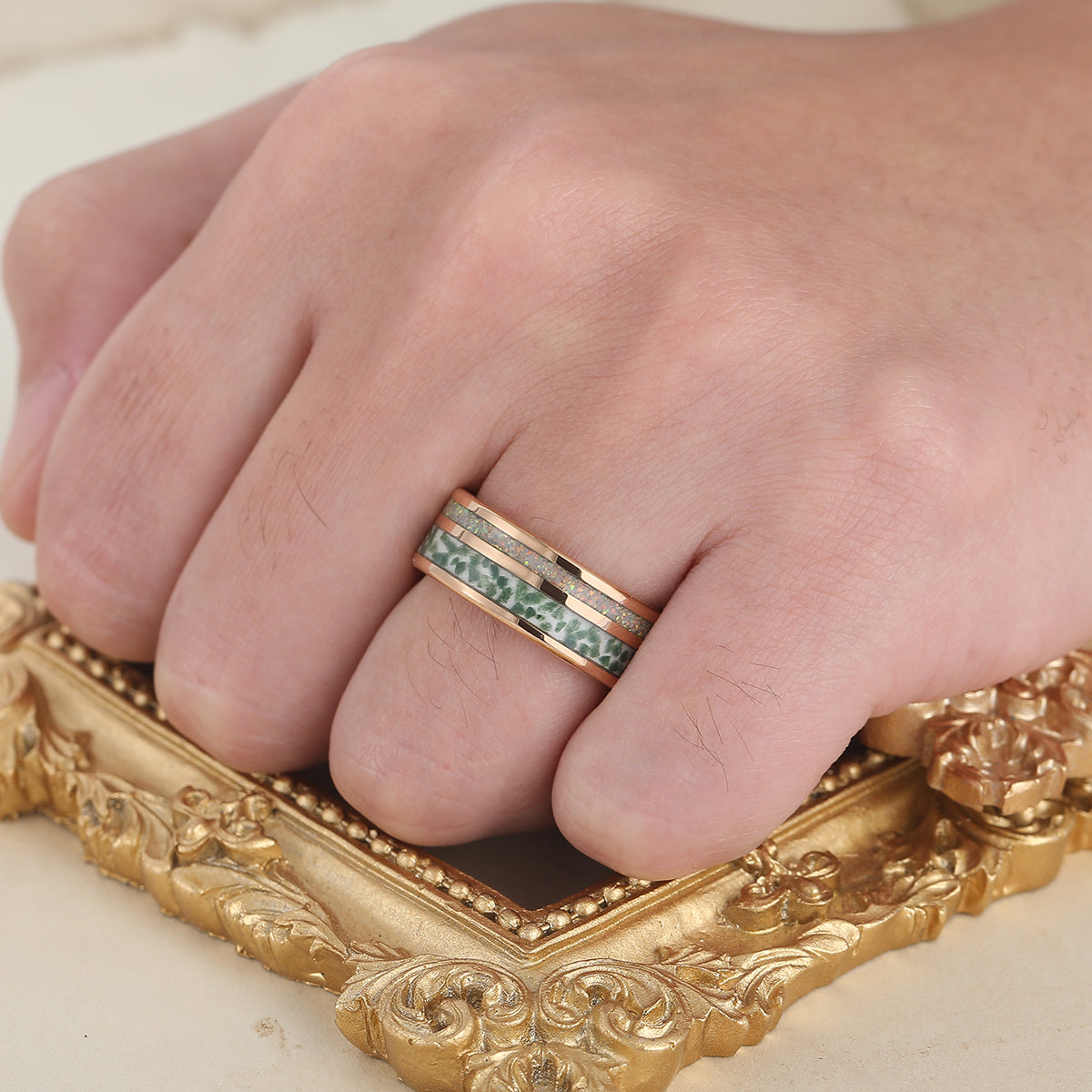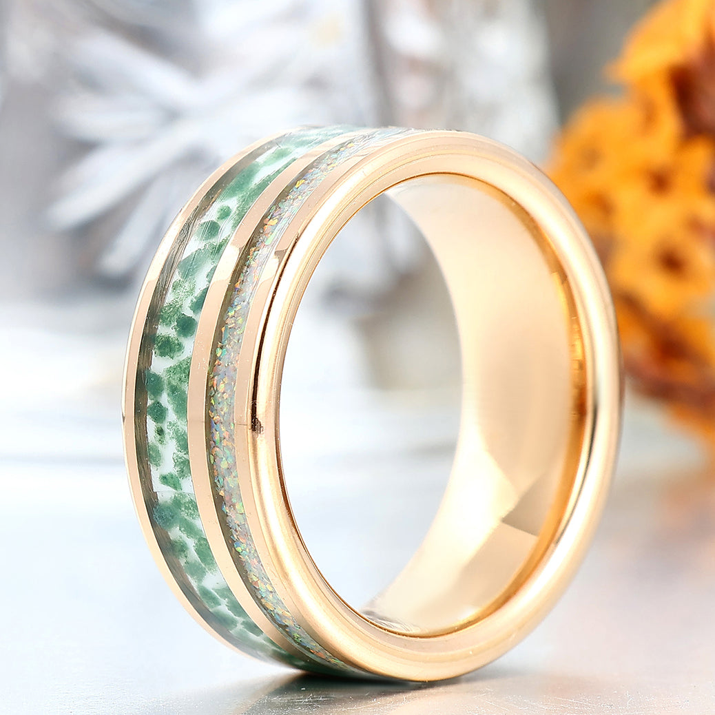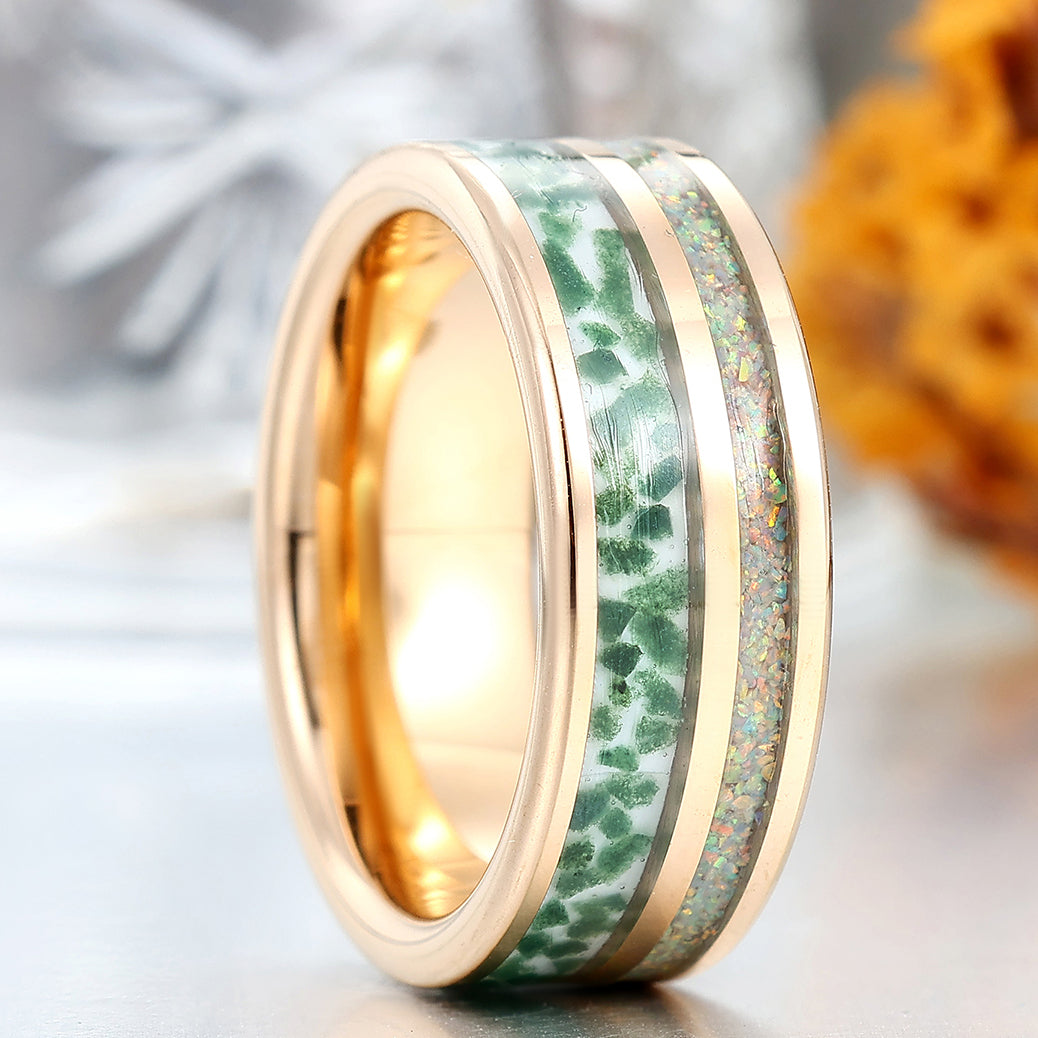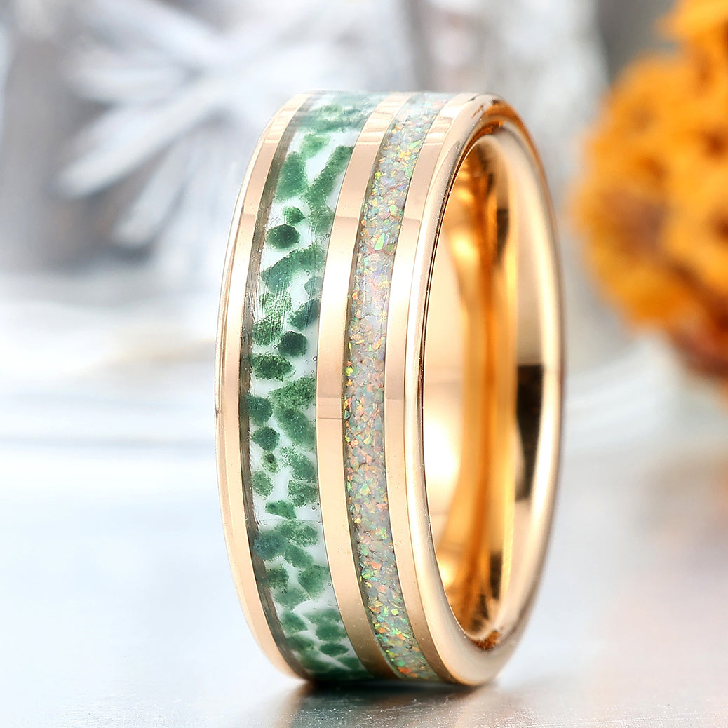 Moss Agate And Pink White Opal Inlay Tungsten Men's Ring Comfort Fit Promise Band