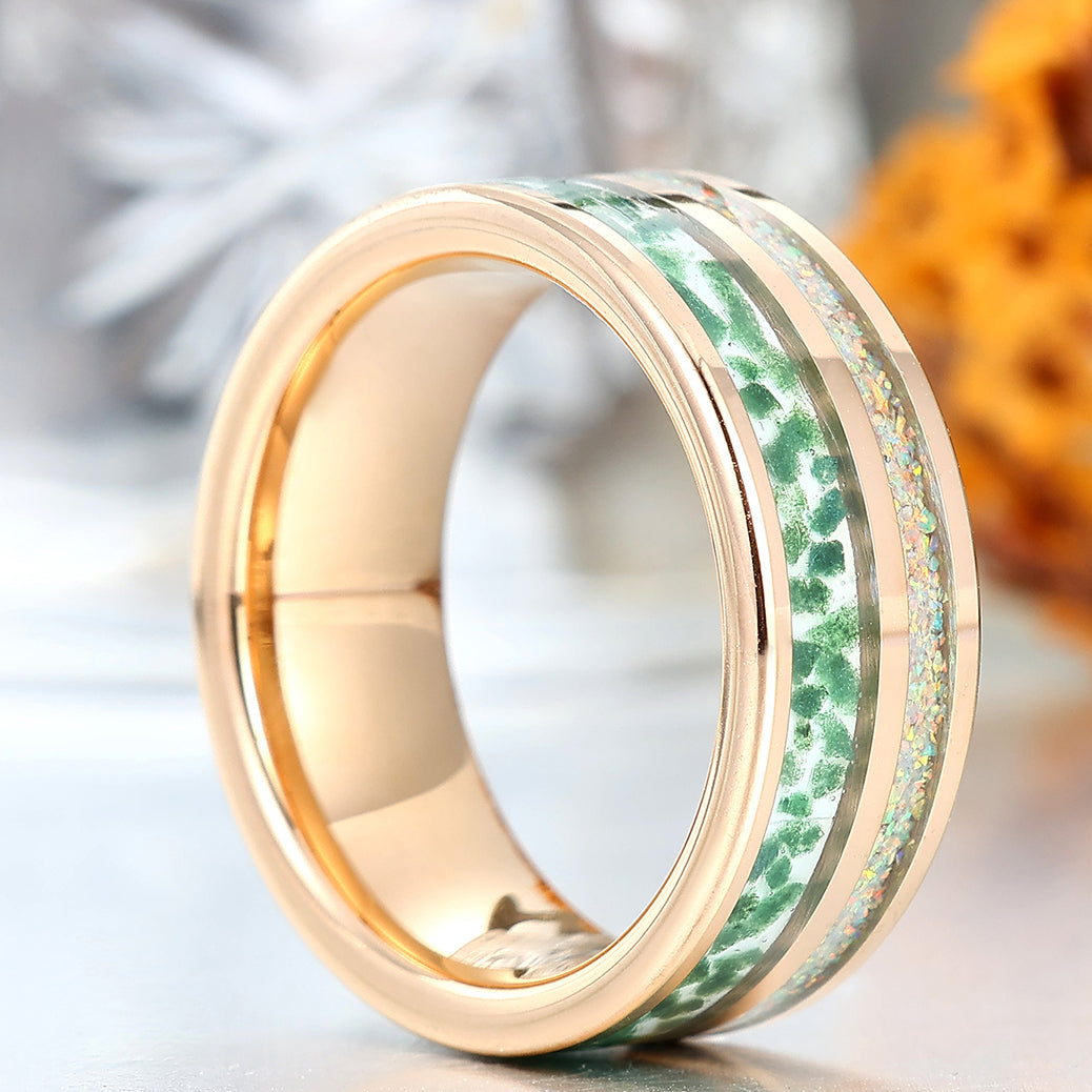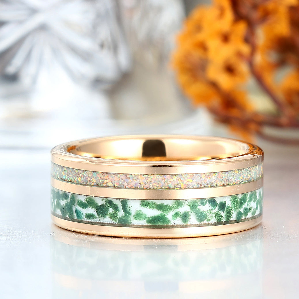 Metal Type: Tungsten Carbide - Crushed Pink White Opal and Moss Agate Inlay - Hypoallergenic