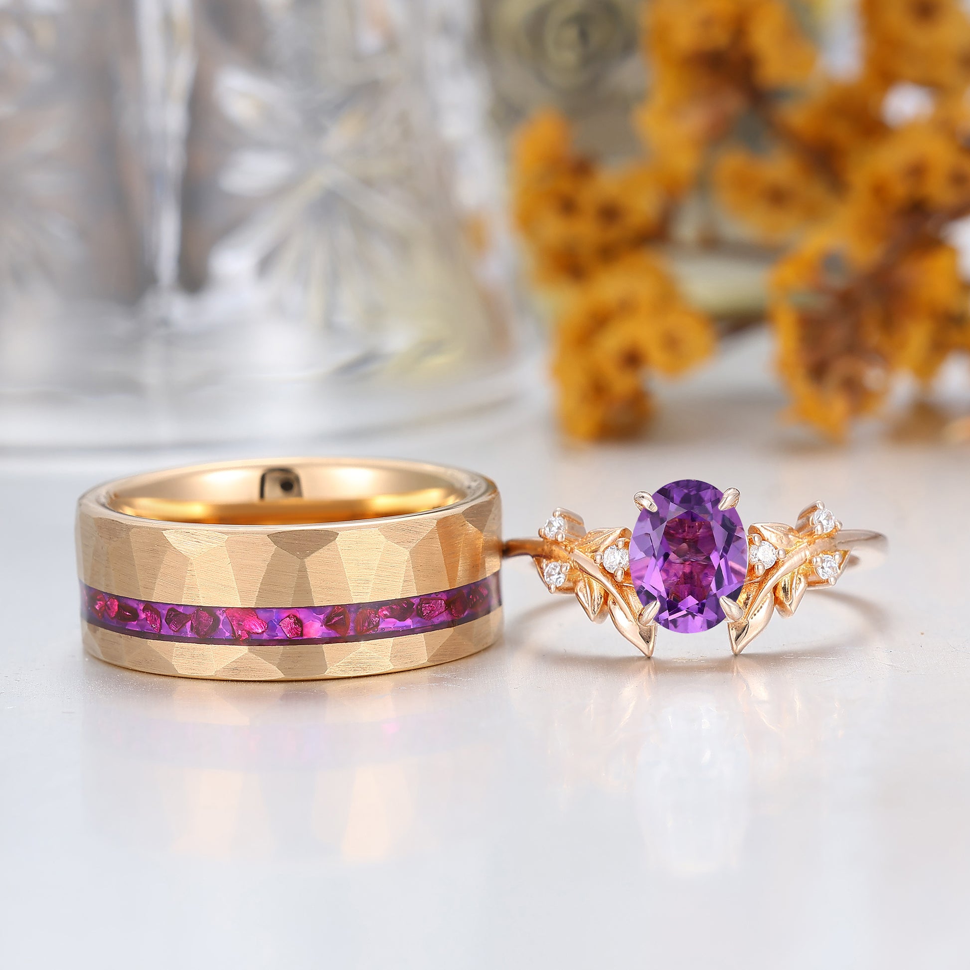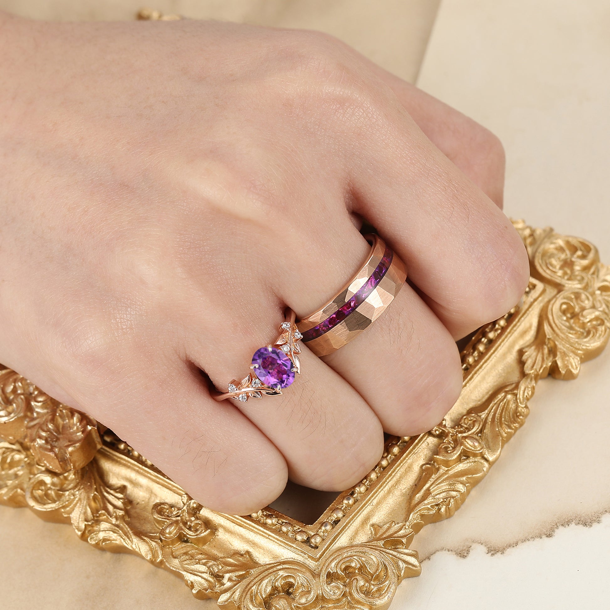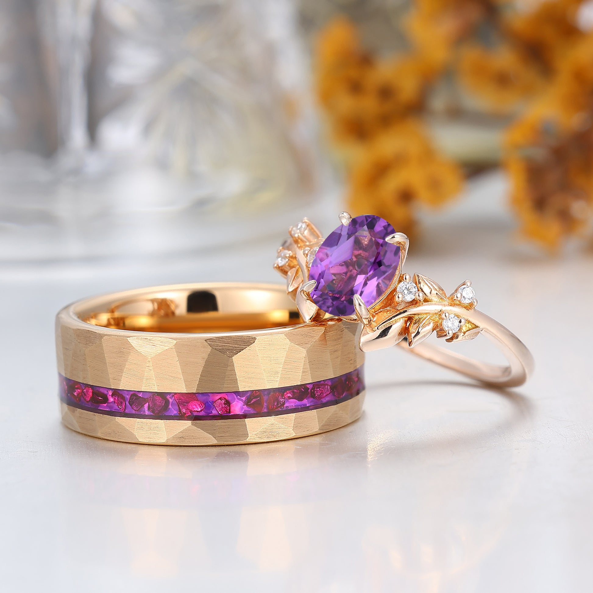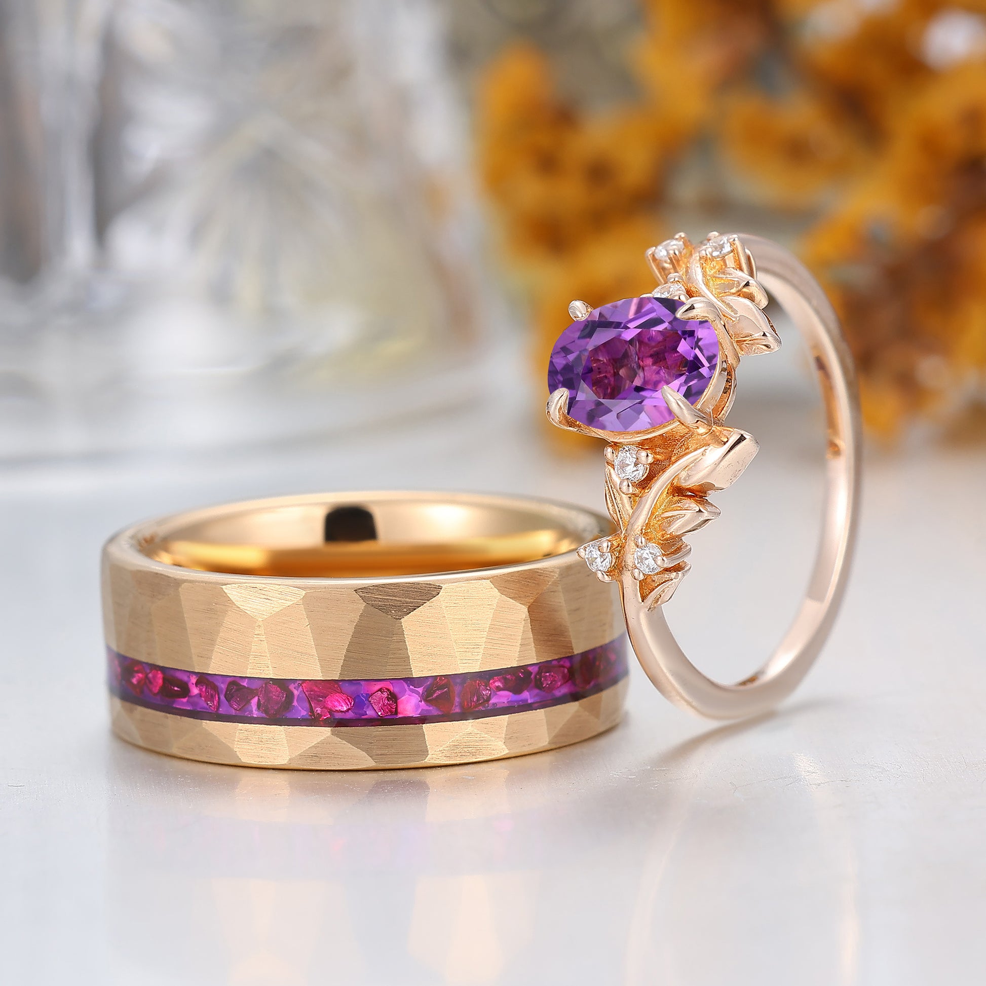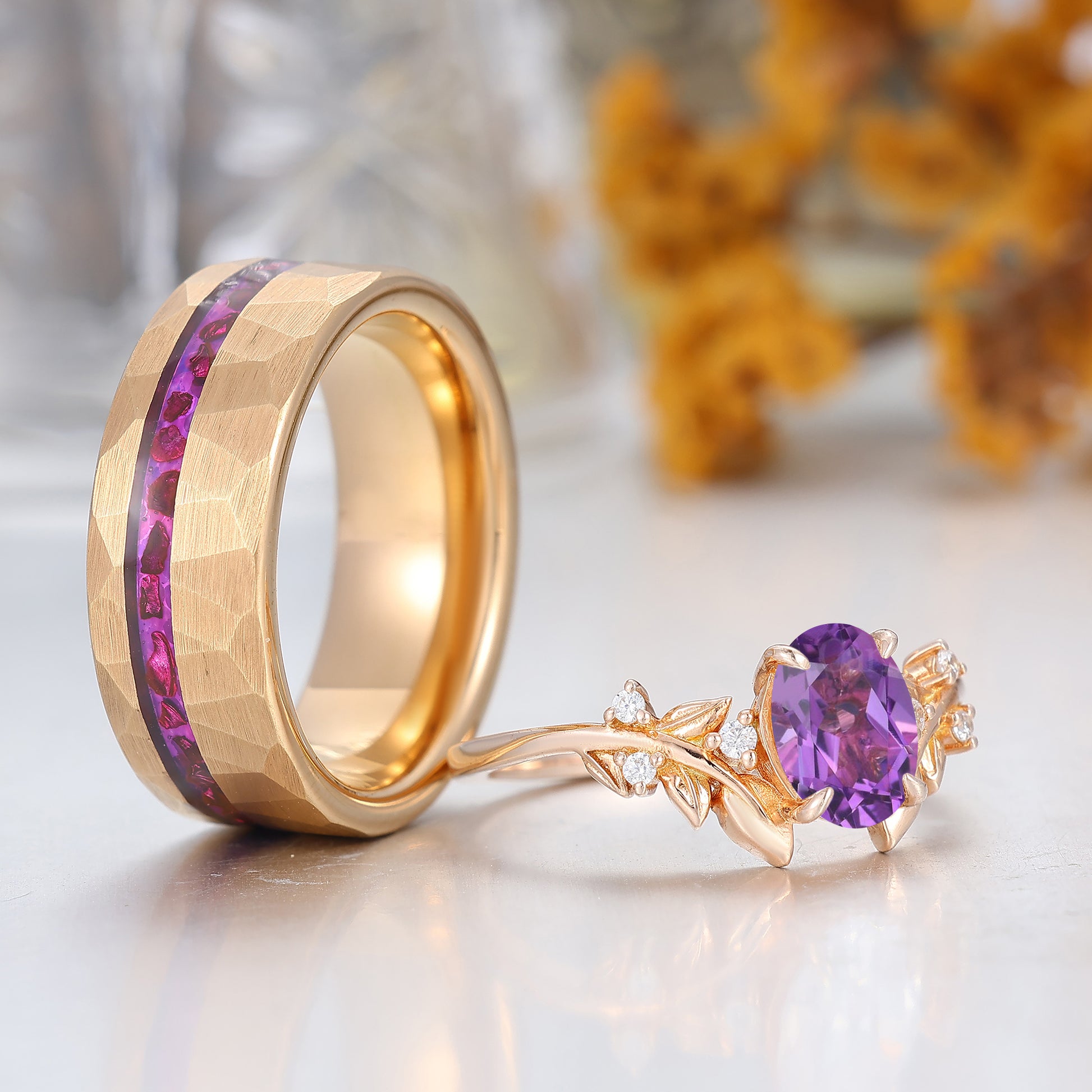 Natural Purple Amethyst Twig Leaf Inspired Couples Ring Set Amethyst Rings For Him And Her