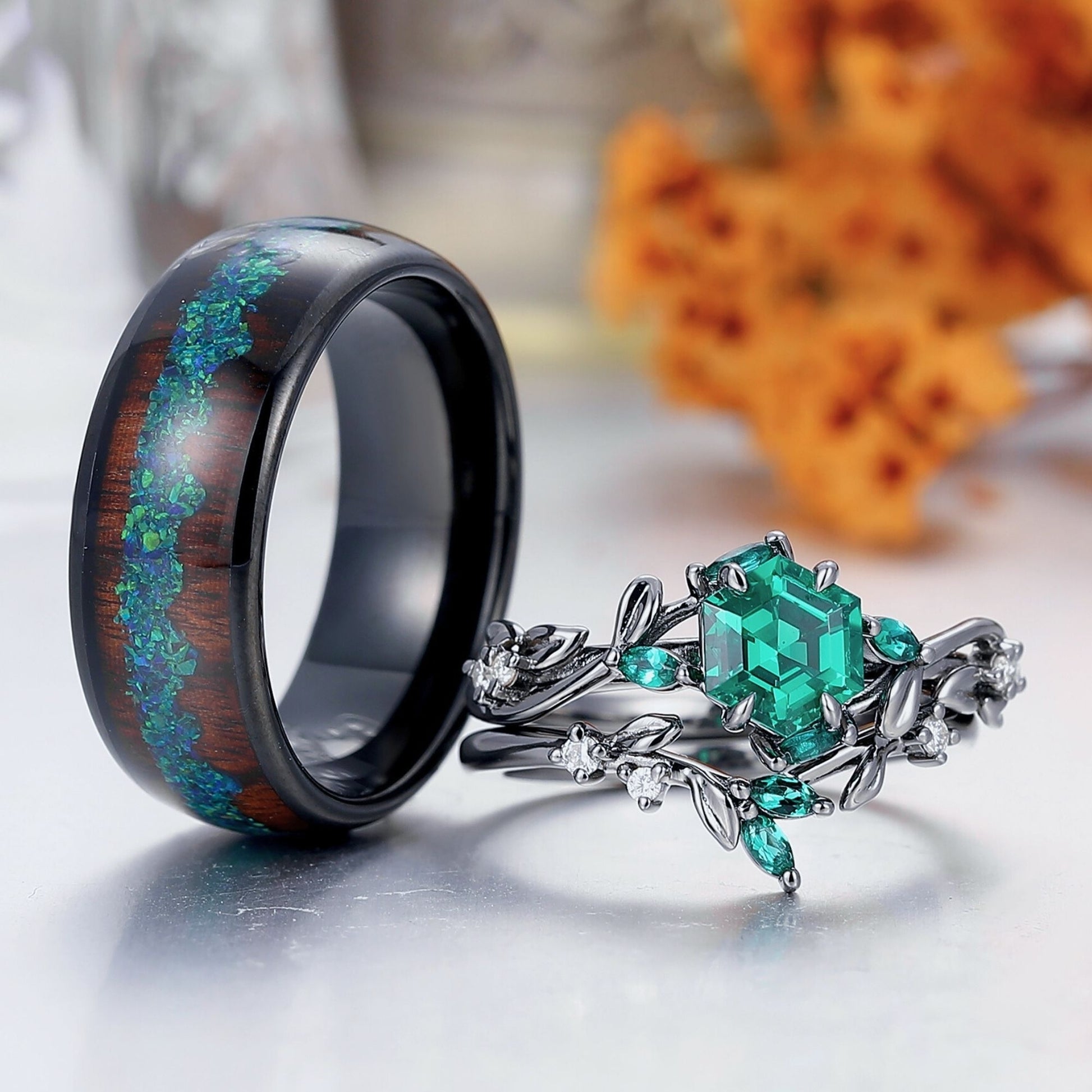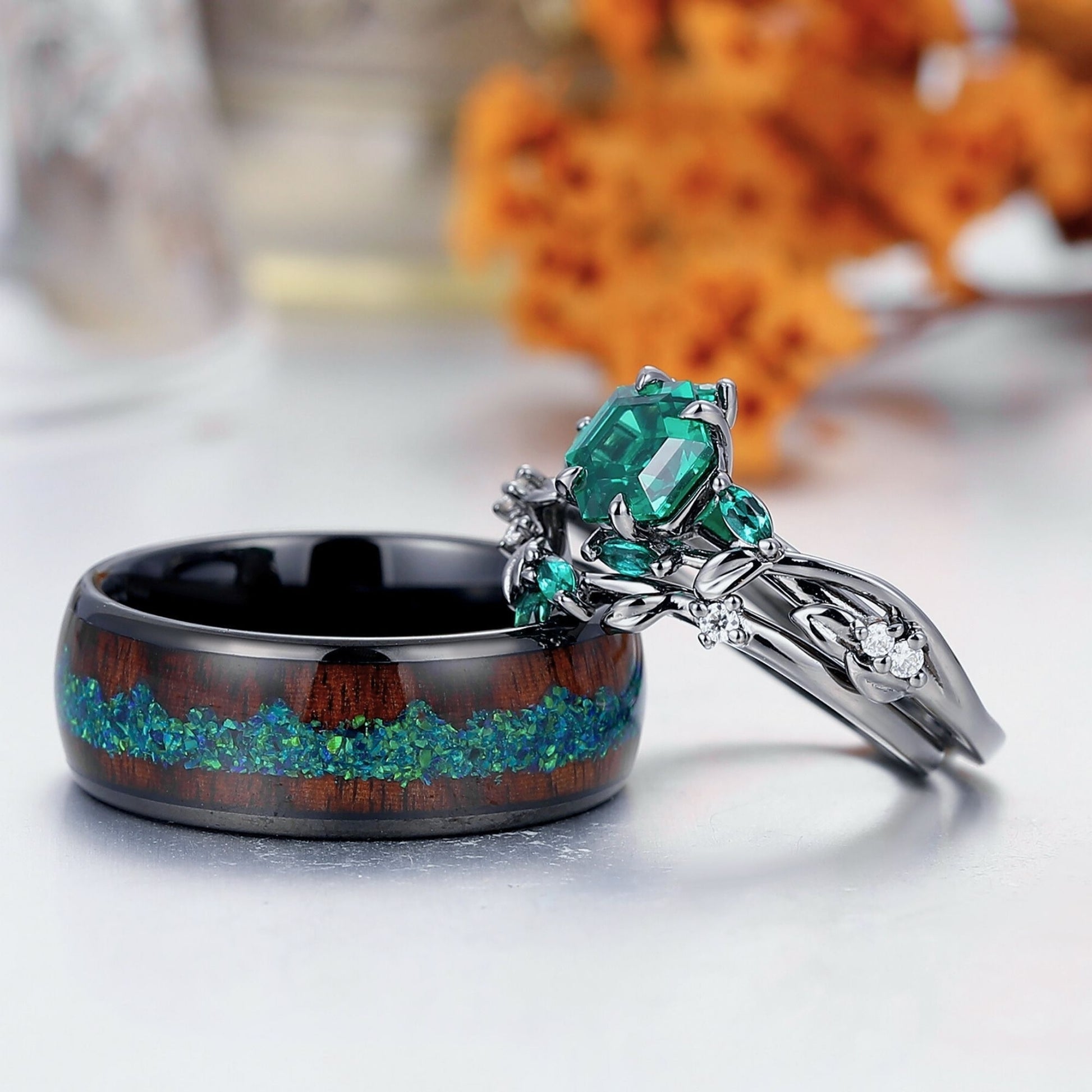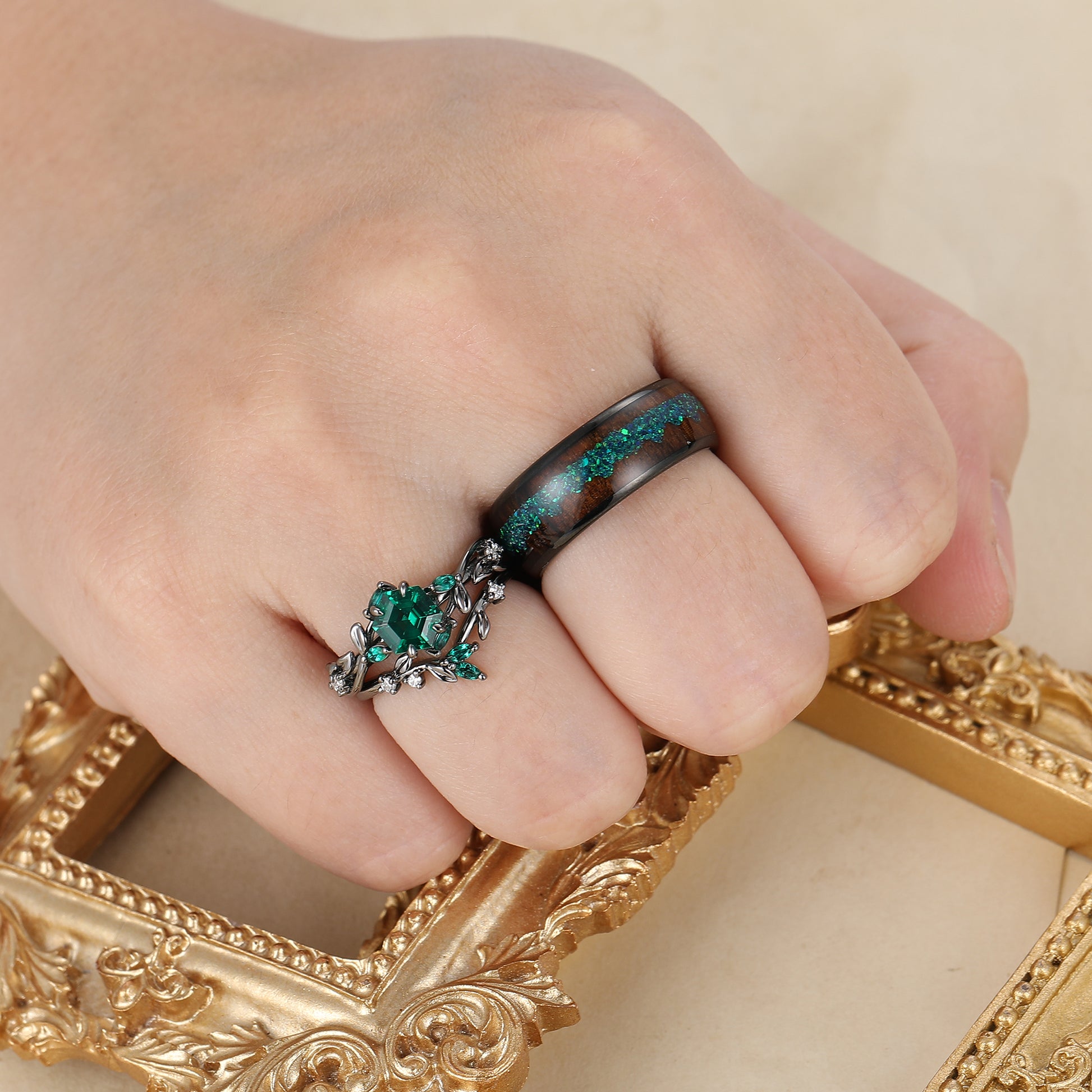 Nature Inspired Emerald Leaf Rings Set For Couples Personalized Green And Black Couples' Set
