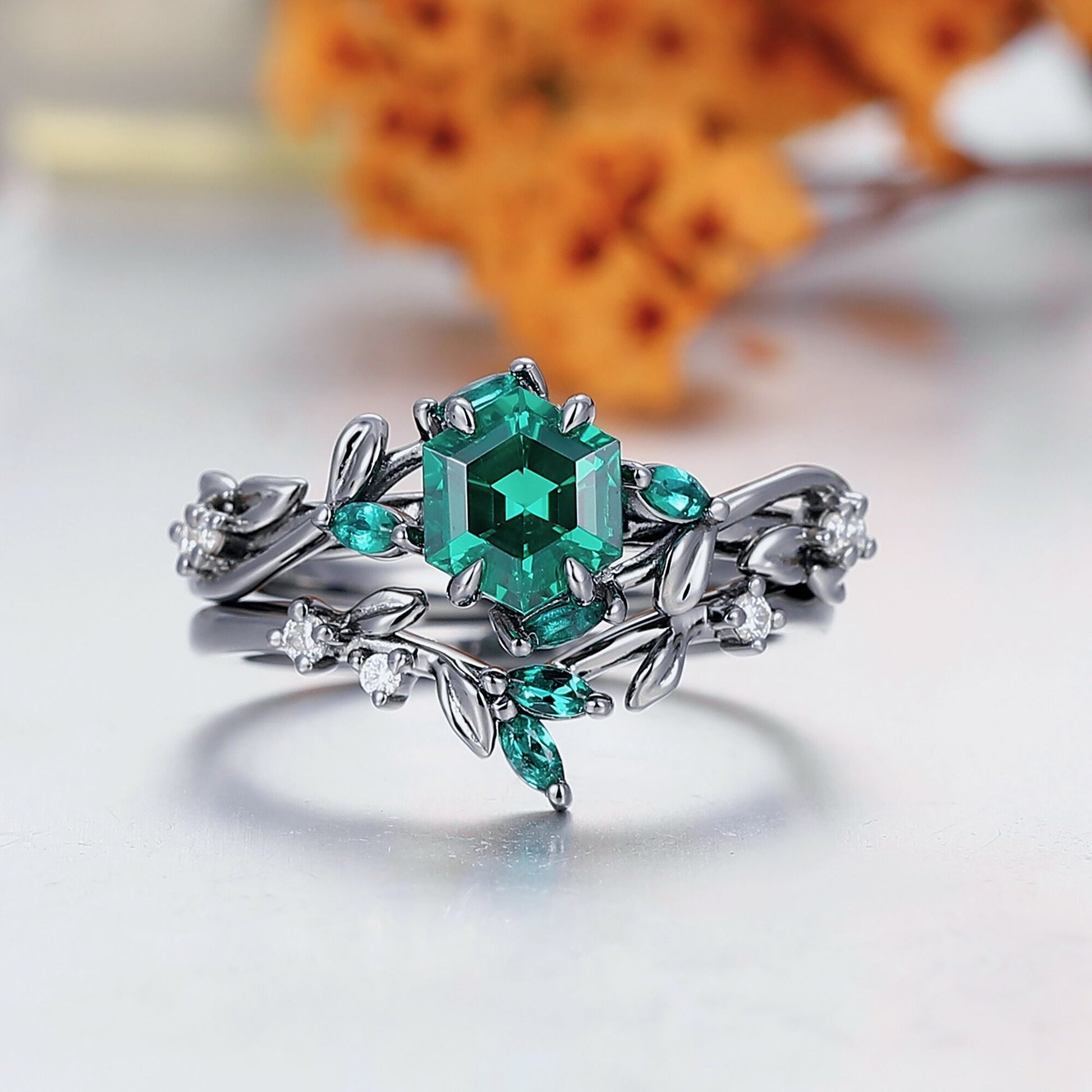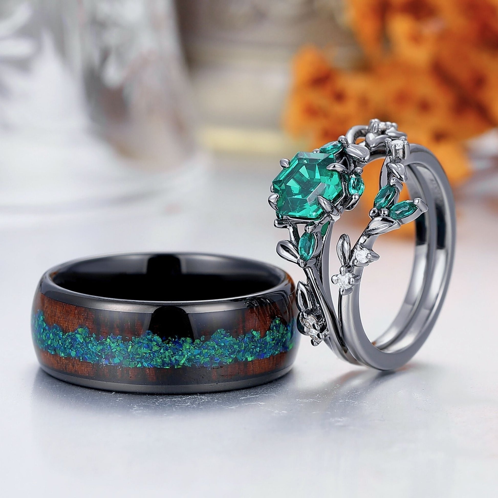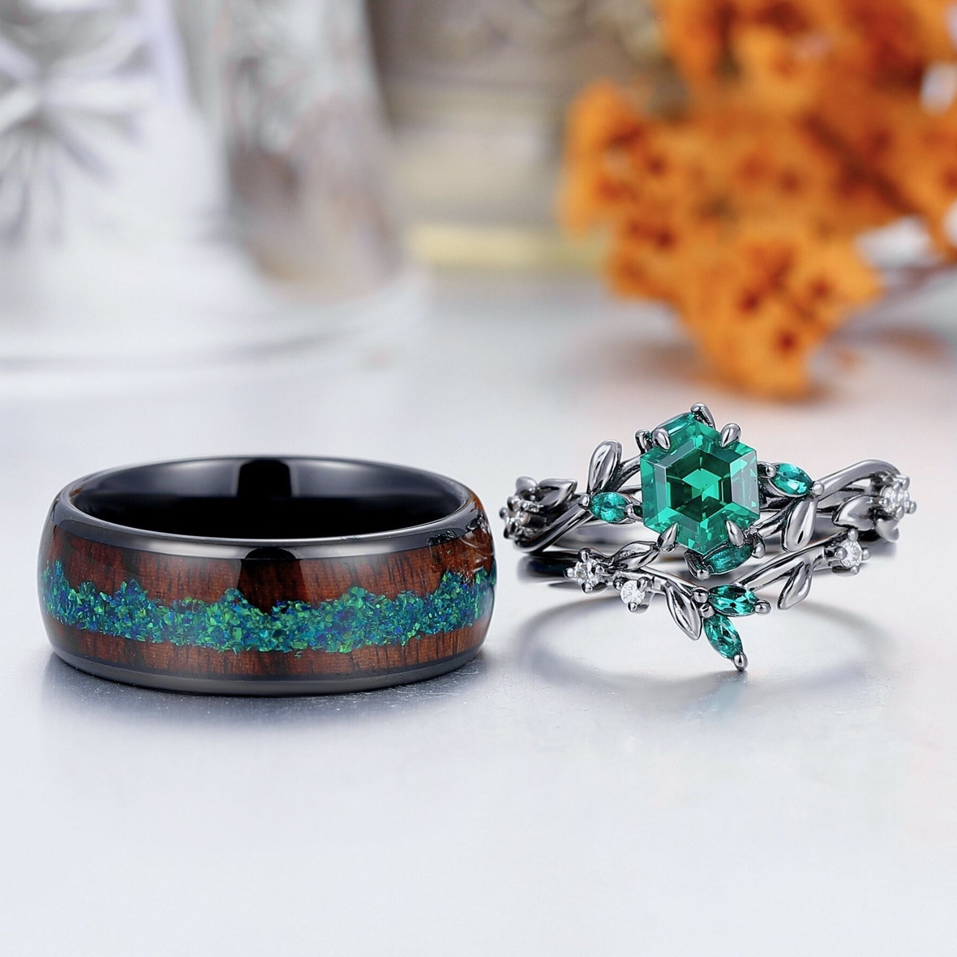 Nature Inspired Emerald Leaf Rings Set For Couples Personalized Green And Black Couples' Set