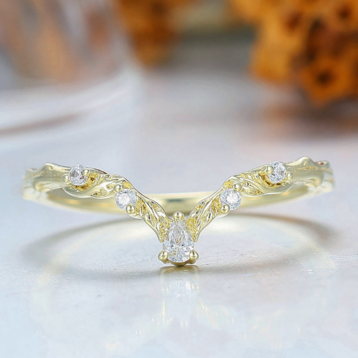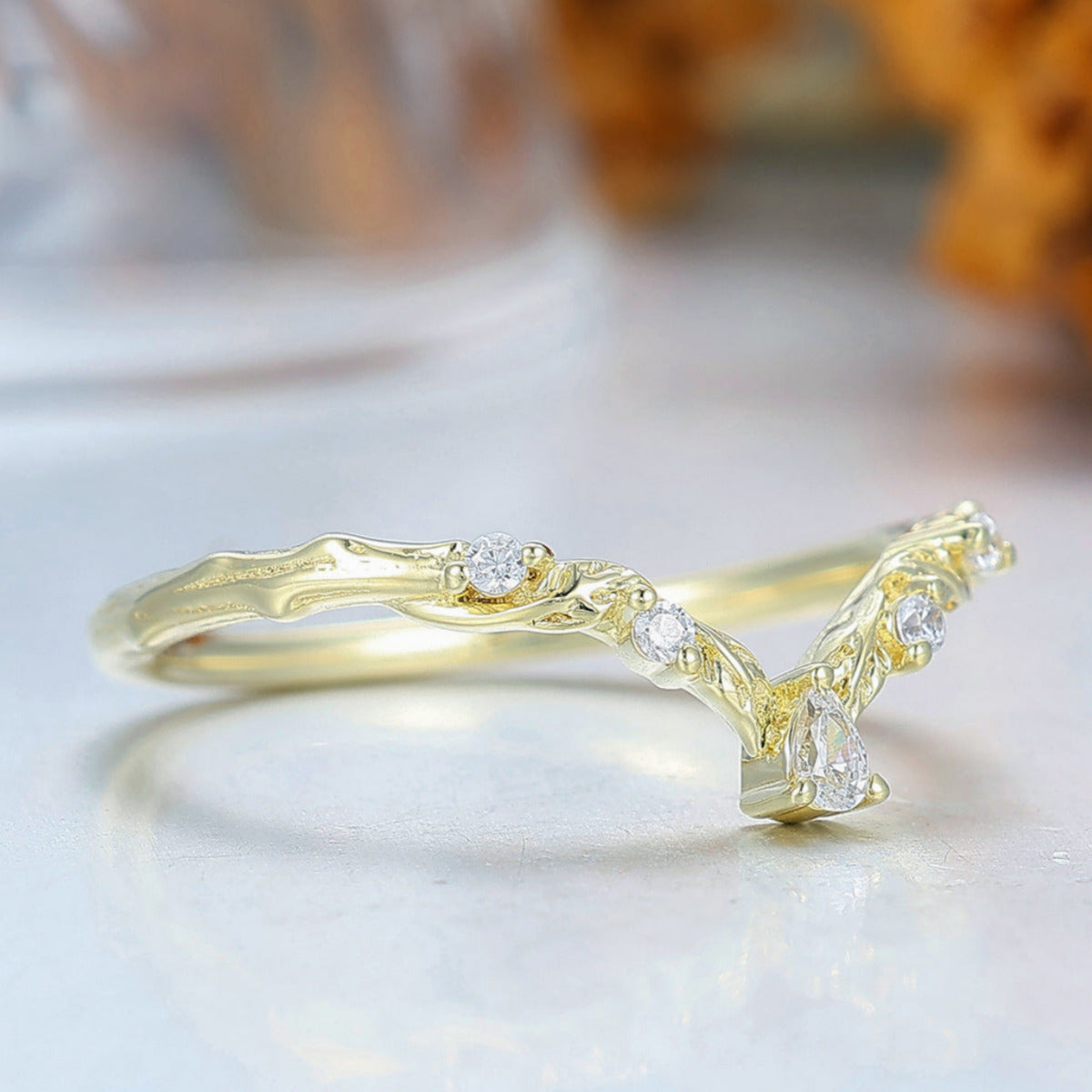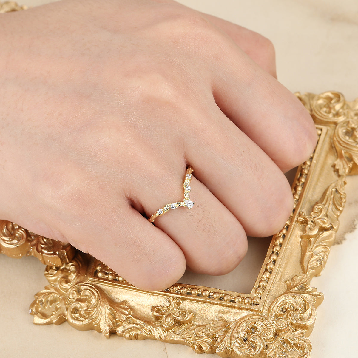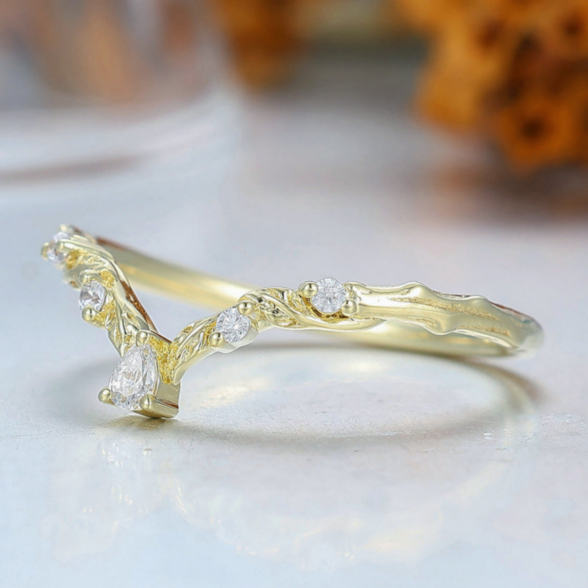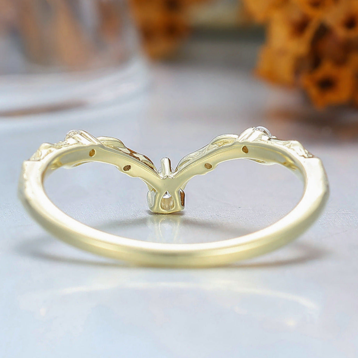 Nature Inspired Moissanite Inlay Curved Wedding Band Brilliant Yellow Gold Women Promise Ring