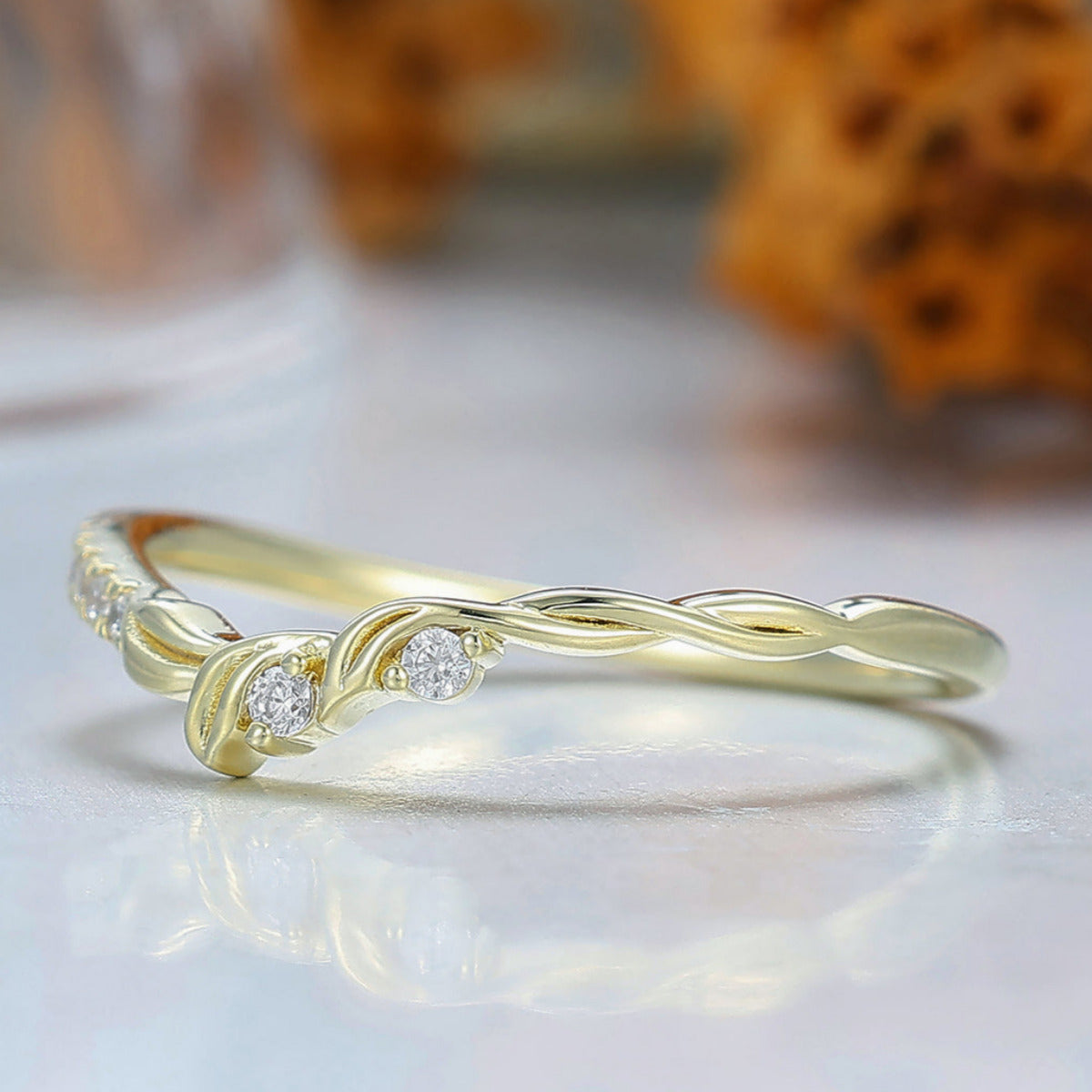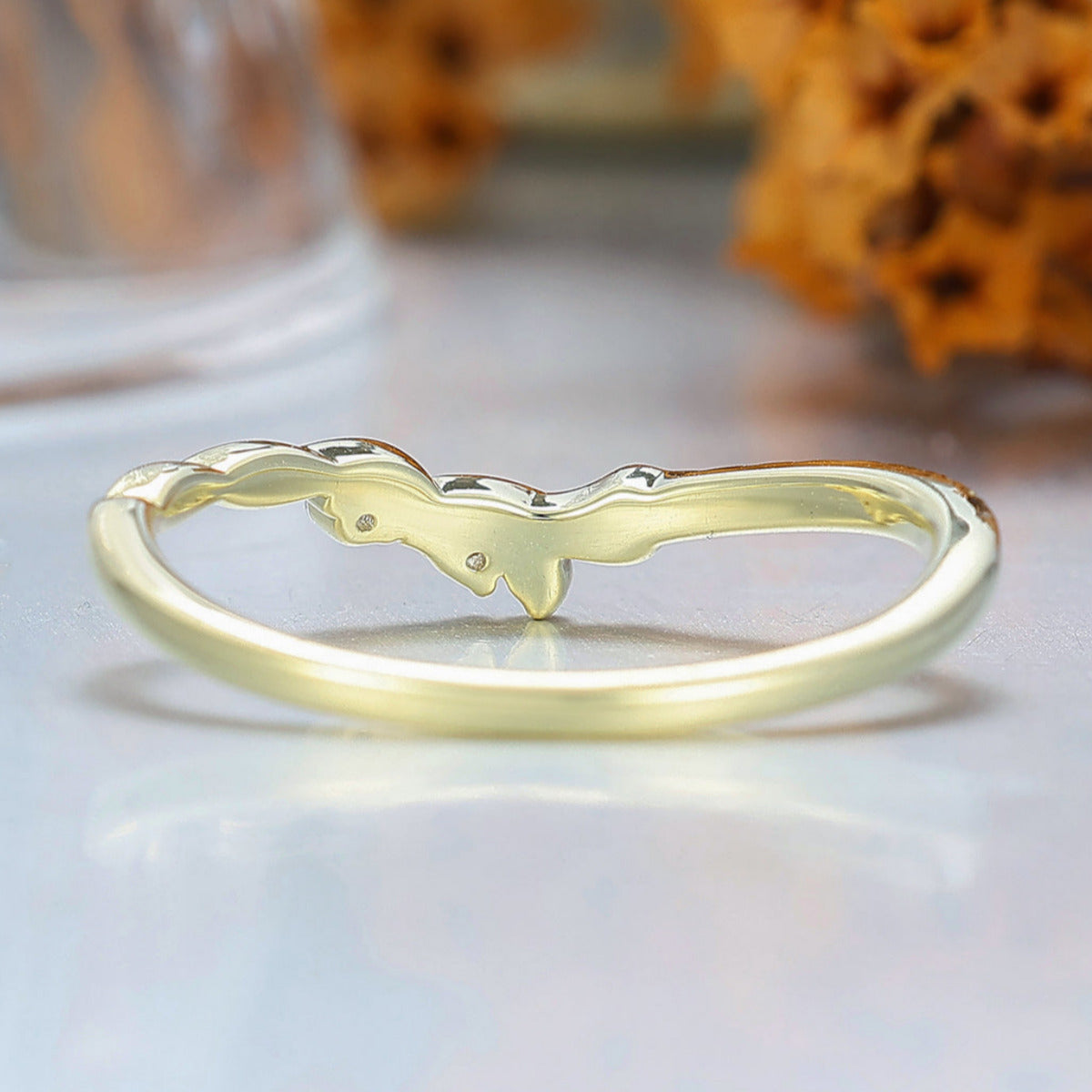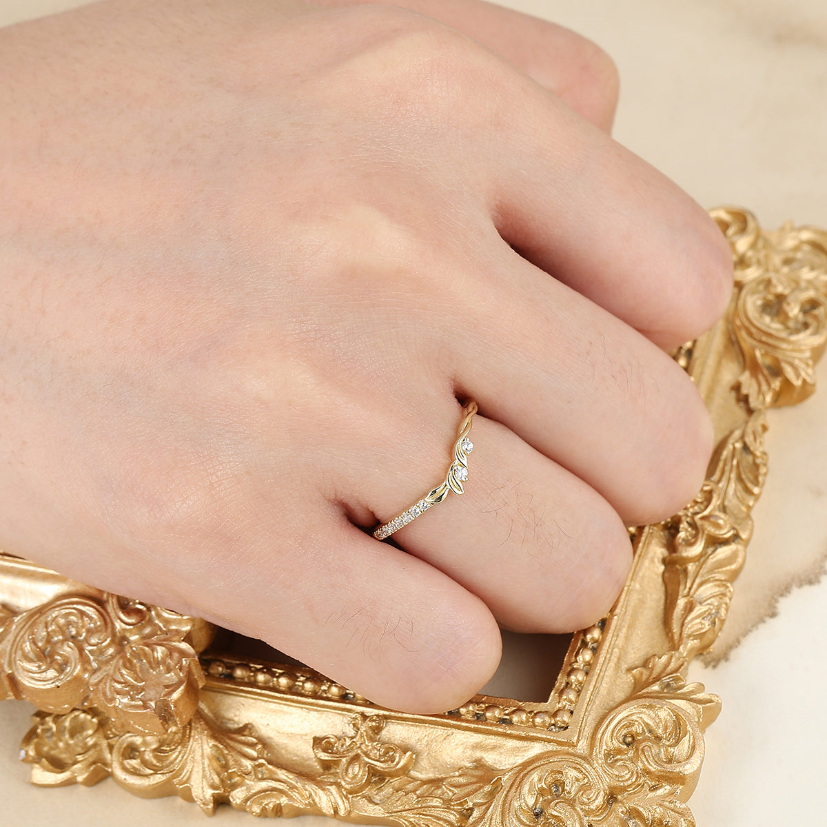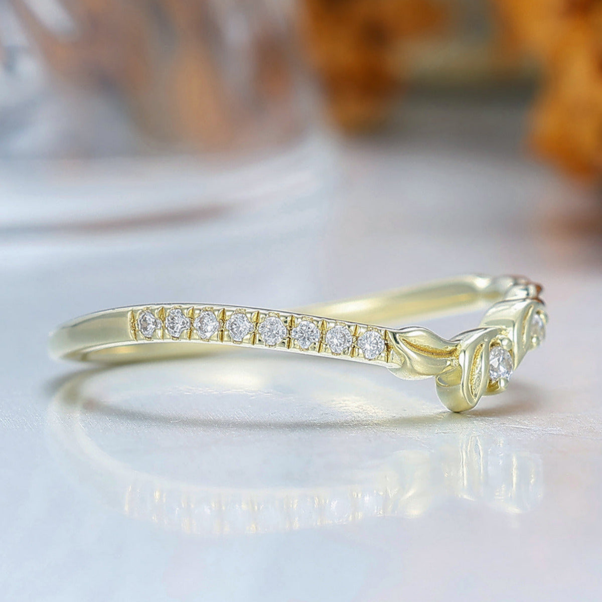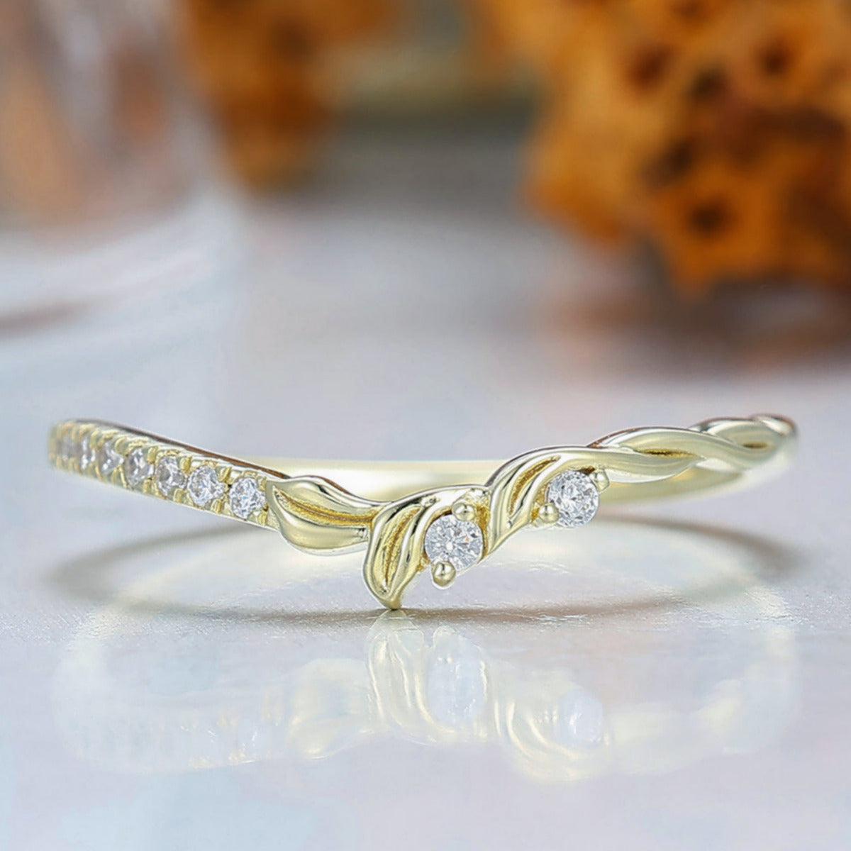 Nature Inspired Moissanite Wedding Band Leaf Design Bridal Anniversary Band Yellow Gold Handmade Curved Band