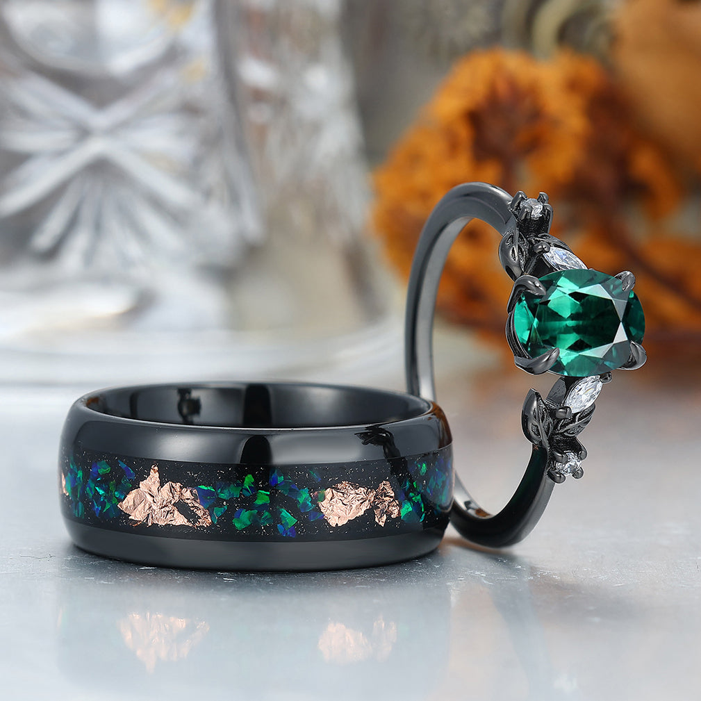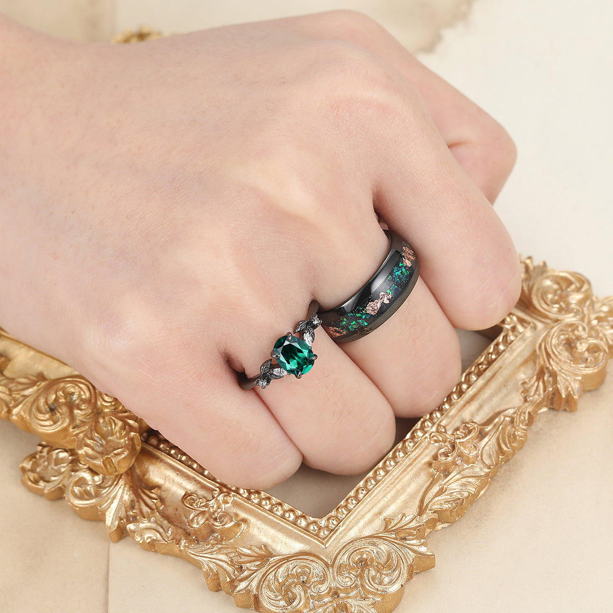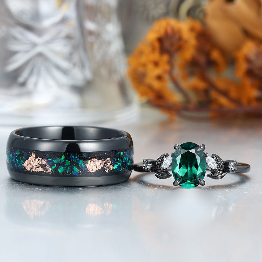 Noble Oval Cut Emerald Branches Leaves Couples Ring Set Green Tungsten Matching Ring