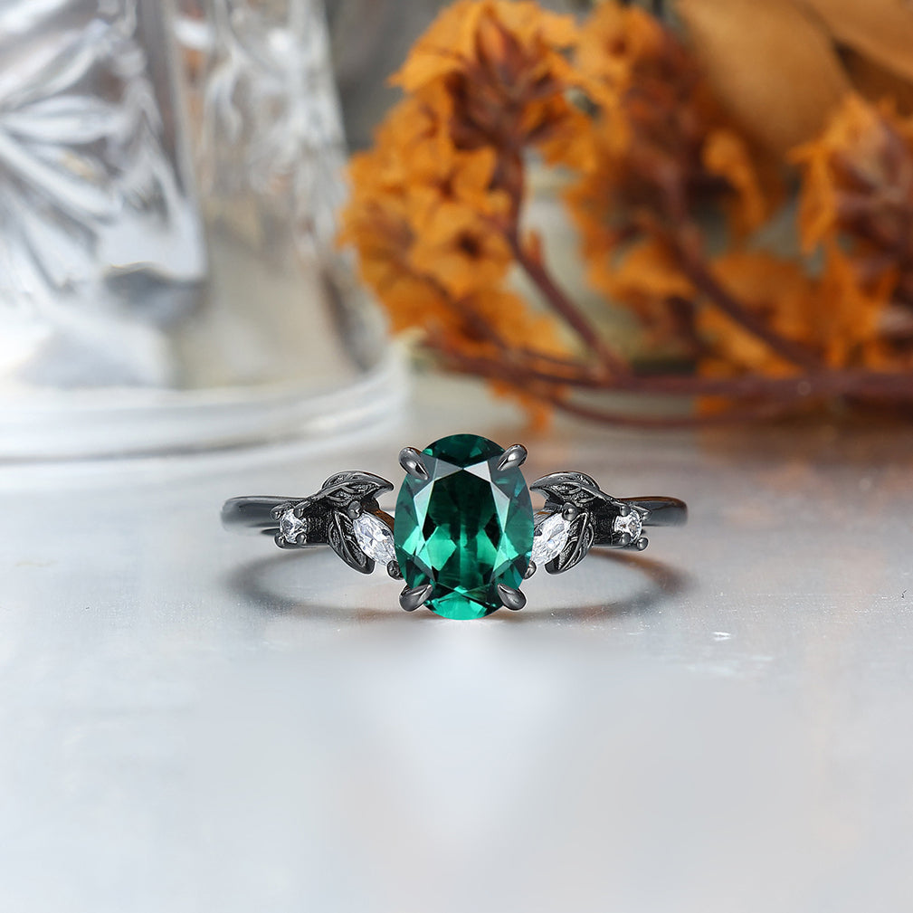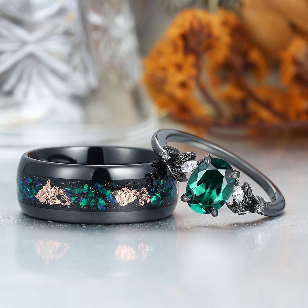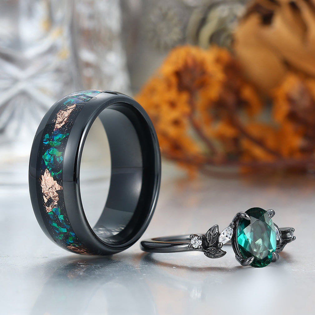 Noble Oval Cut Emerald Branches Leaves Couples Ring Set Green Tungsten Matching Ring