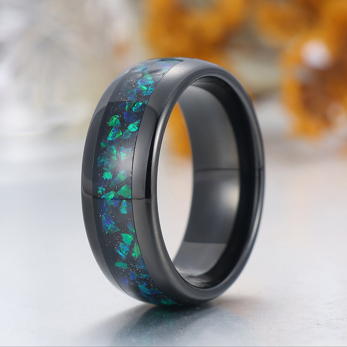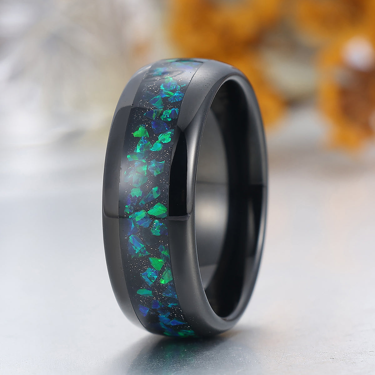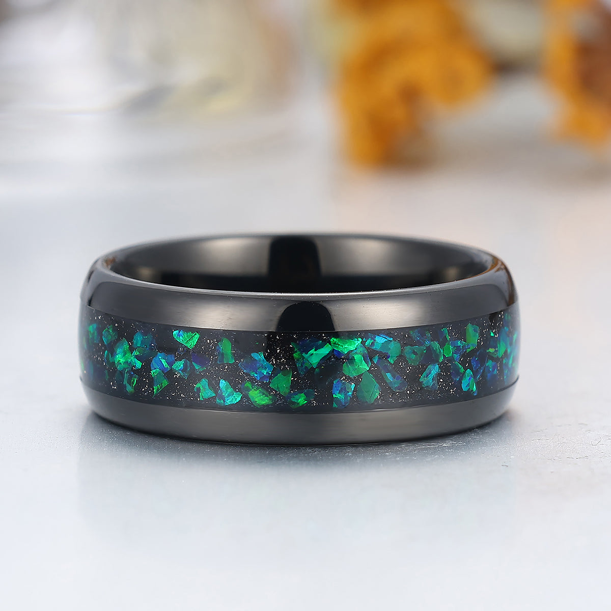 Metal Type: Tungsten Carbide - Crushed Lab Peacock Green Opal Inlay - Hypoallergenic