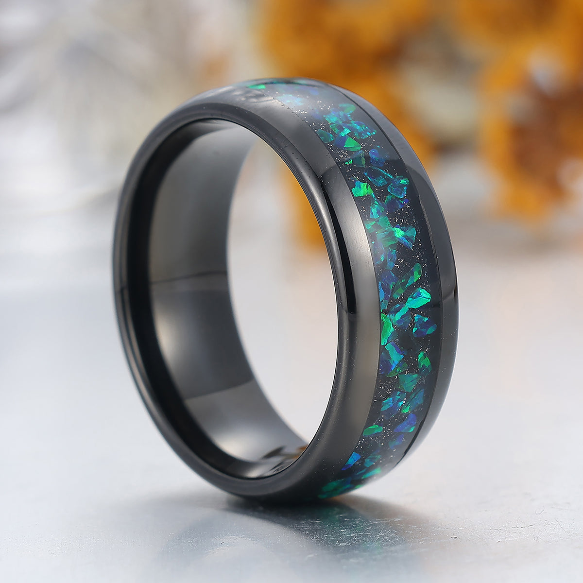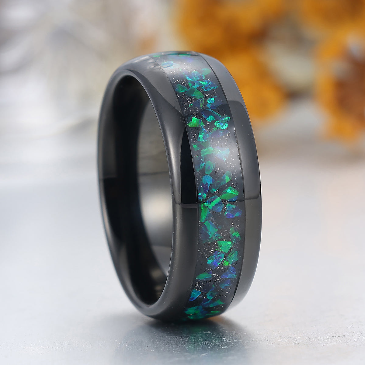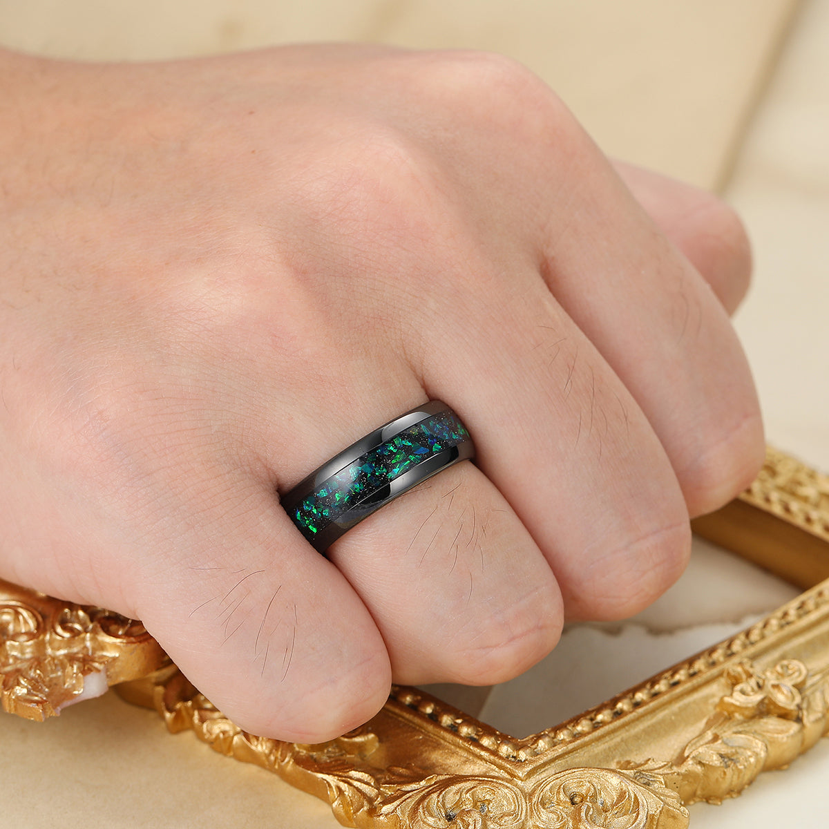 Peacock Green Opal Inlay Tungsten Carbide Ring Black Plated Men's Wedding Band Blue Green Ring