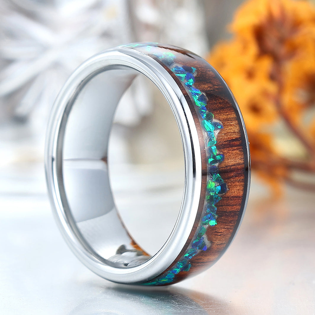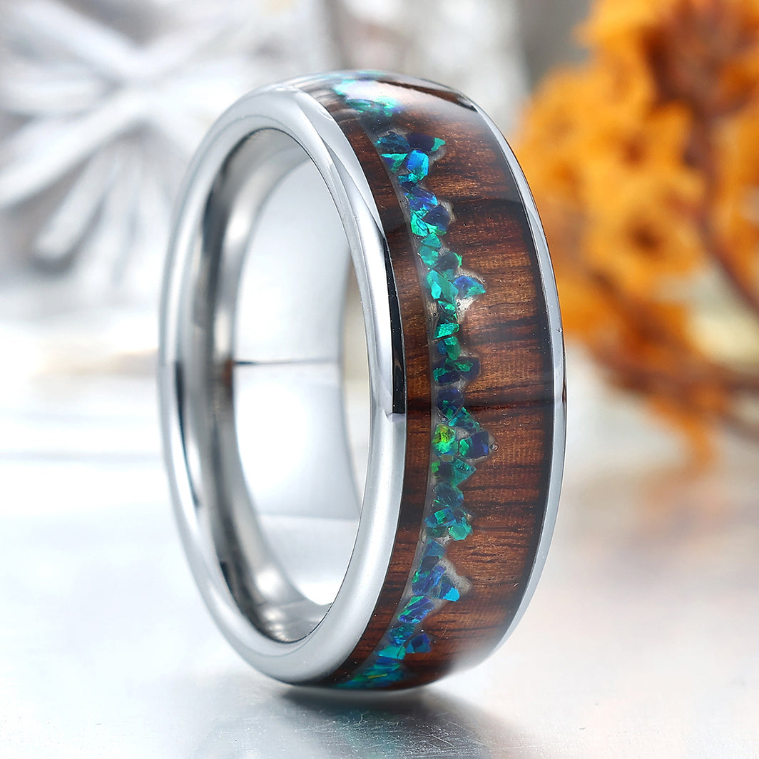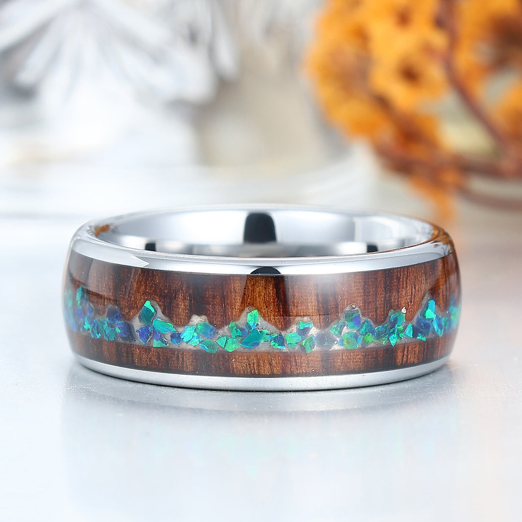 Metal Type: Tungsten Carbide - Crushed Peacock Green Opal and Wood Inlay - Hypoallergenic