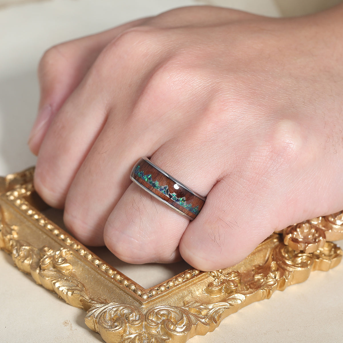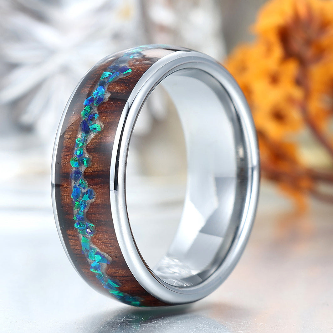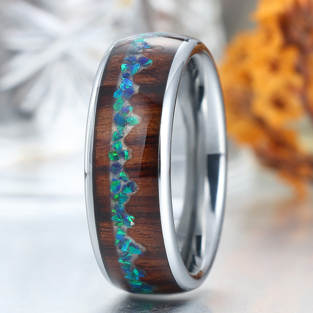 Metal Type: Tungsten Carbide - Crushed Peacock Green Opal and Wood Inlay - Hypoallergenic