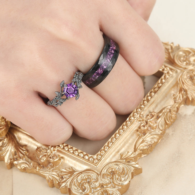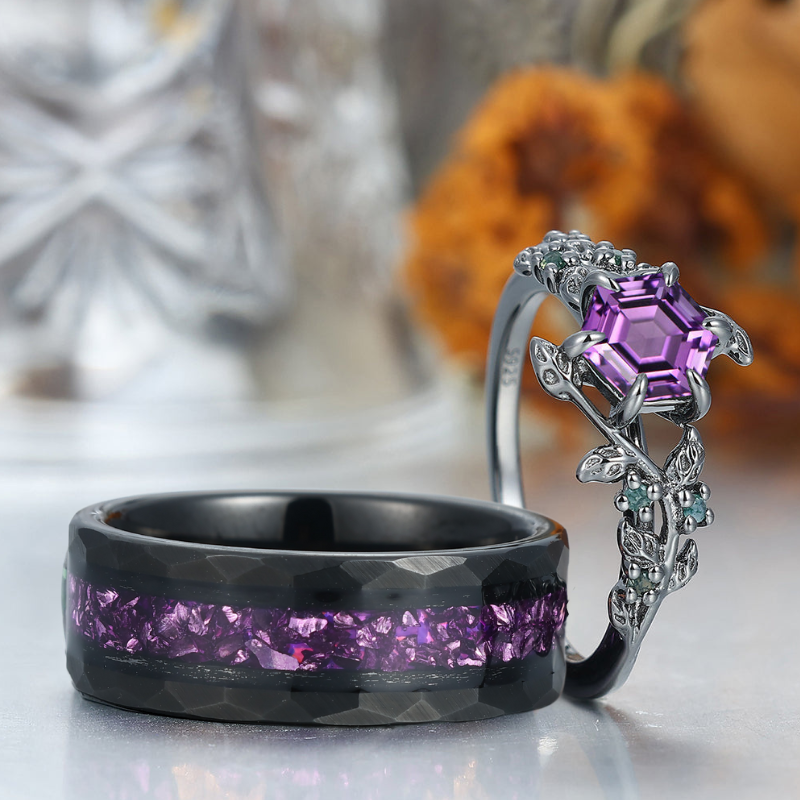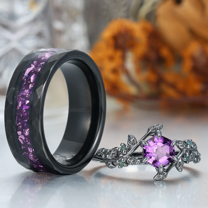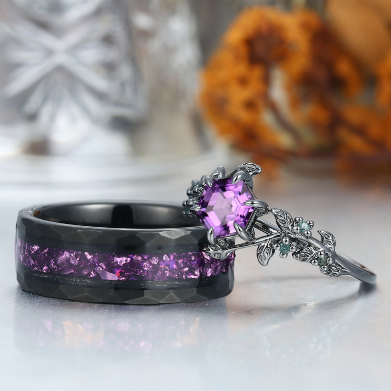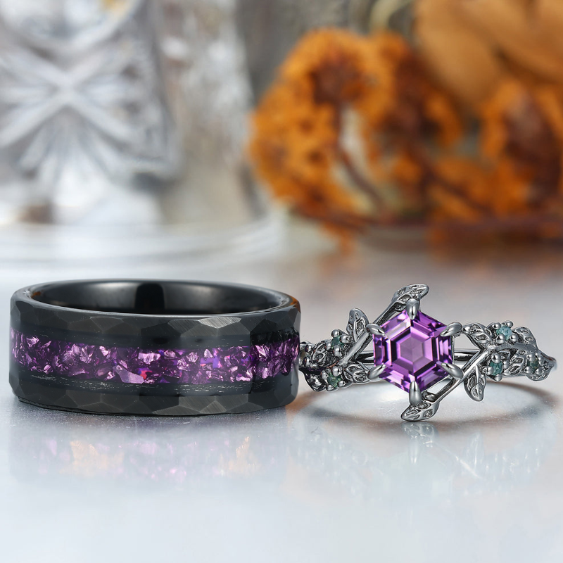 Personalized Natural Amethyst Leaves His And Hers Wedding Bands Matching Purple Tungsten Rings