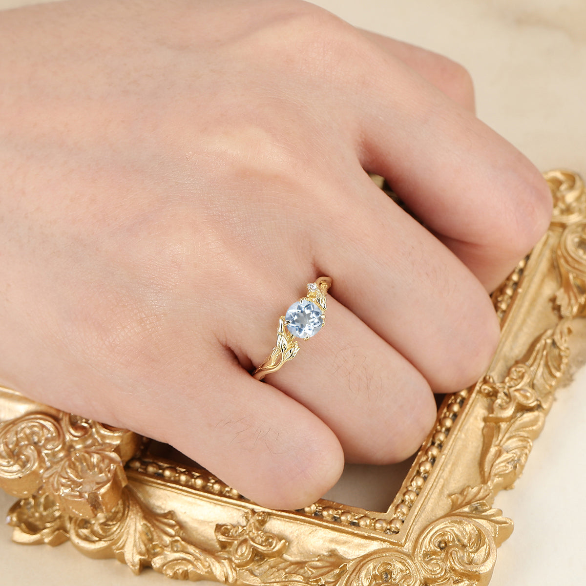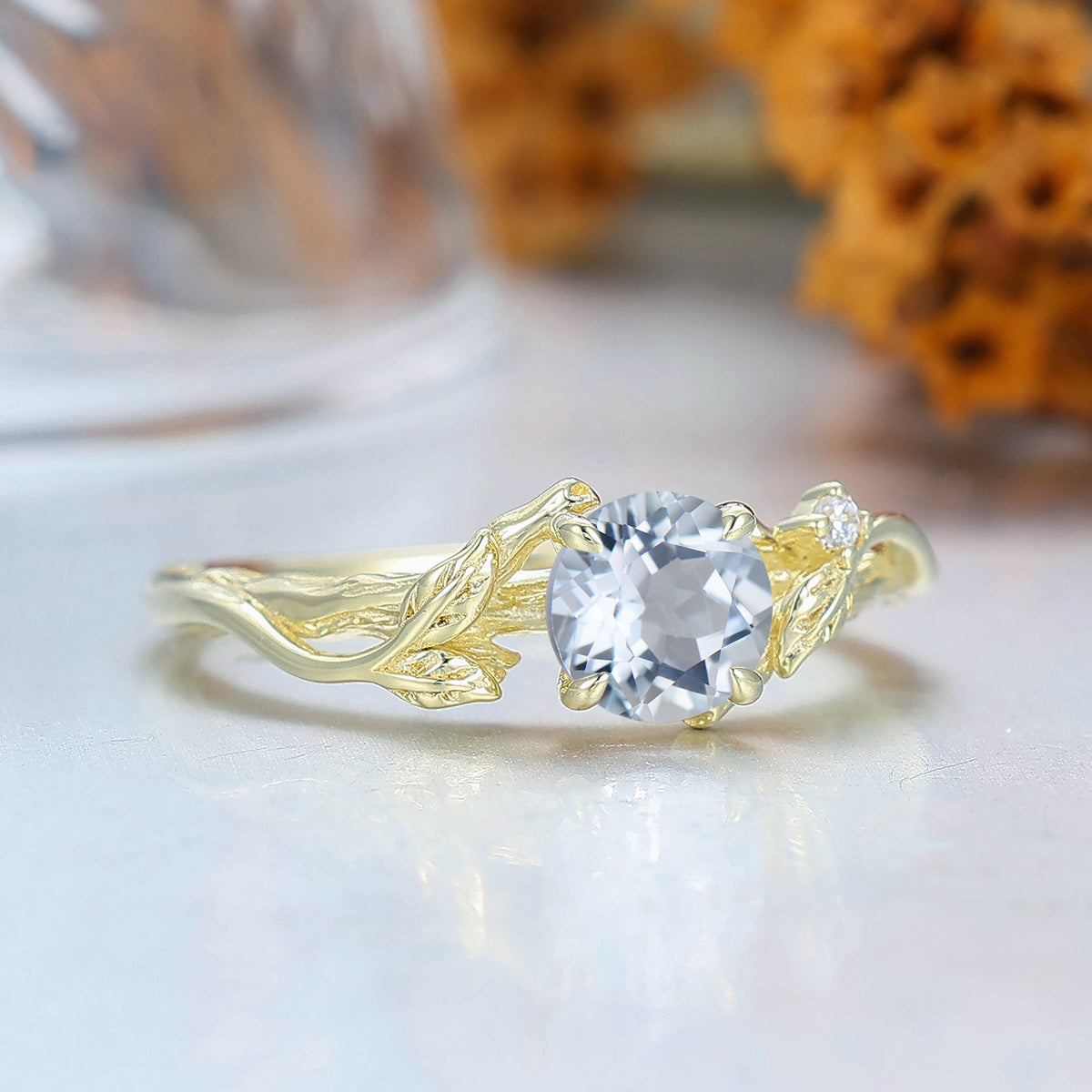 Personalized Round Aquamarine Leaf Engagement Ring Aquamarine March Birthstone Ring For Women Gift