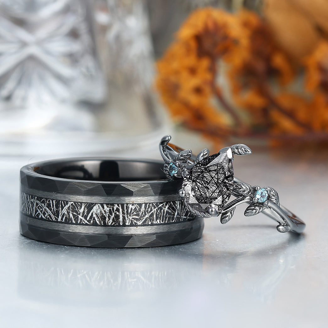 Promise Pear Shape Black Rutilated Quartz Engagement Alexandrite Inlaid Couples Ring Set