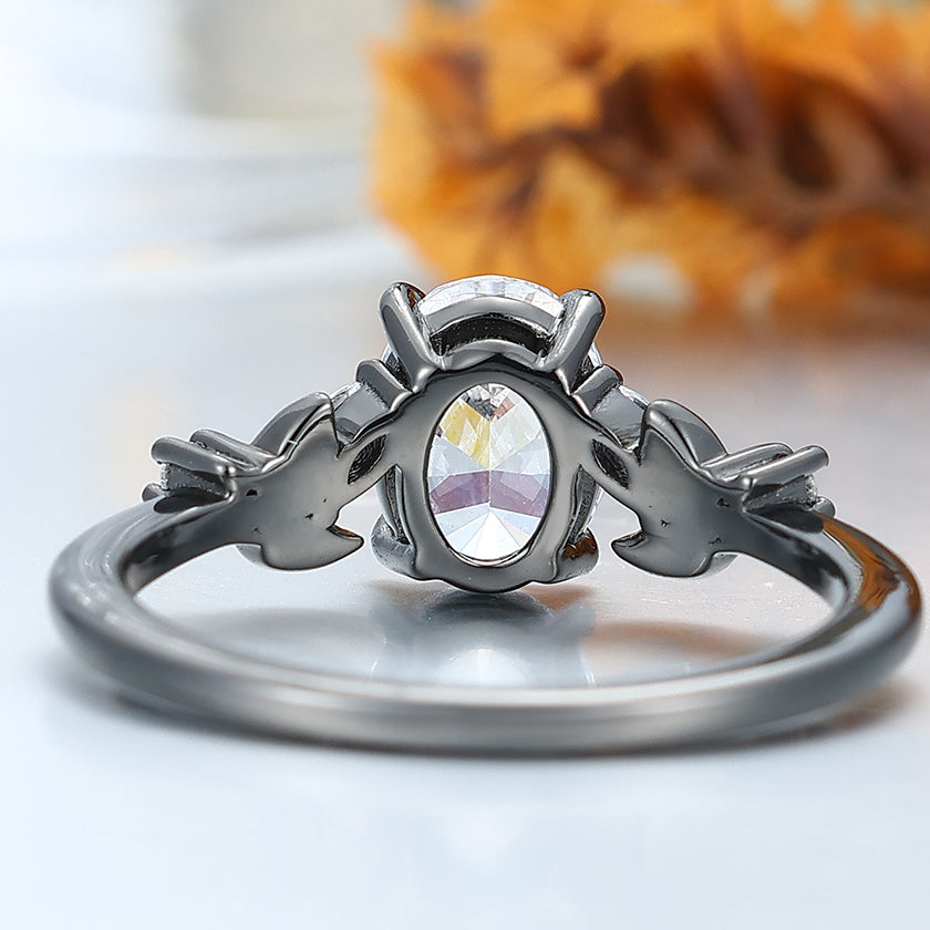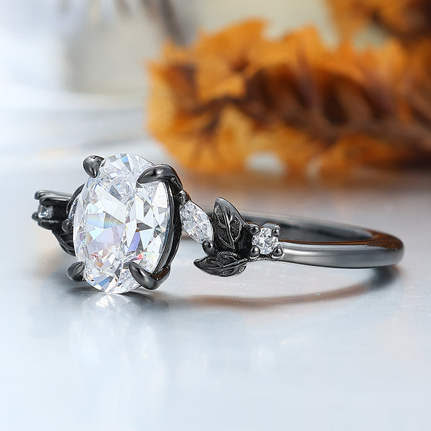 Prongs Setting Oval Moissanite Engagement Ring Black Plated Leaf Wedding Ring