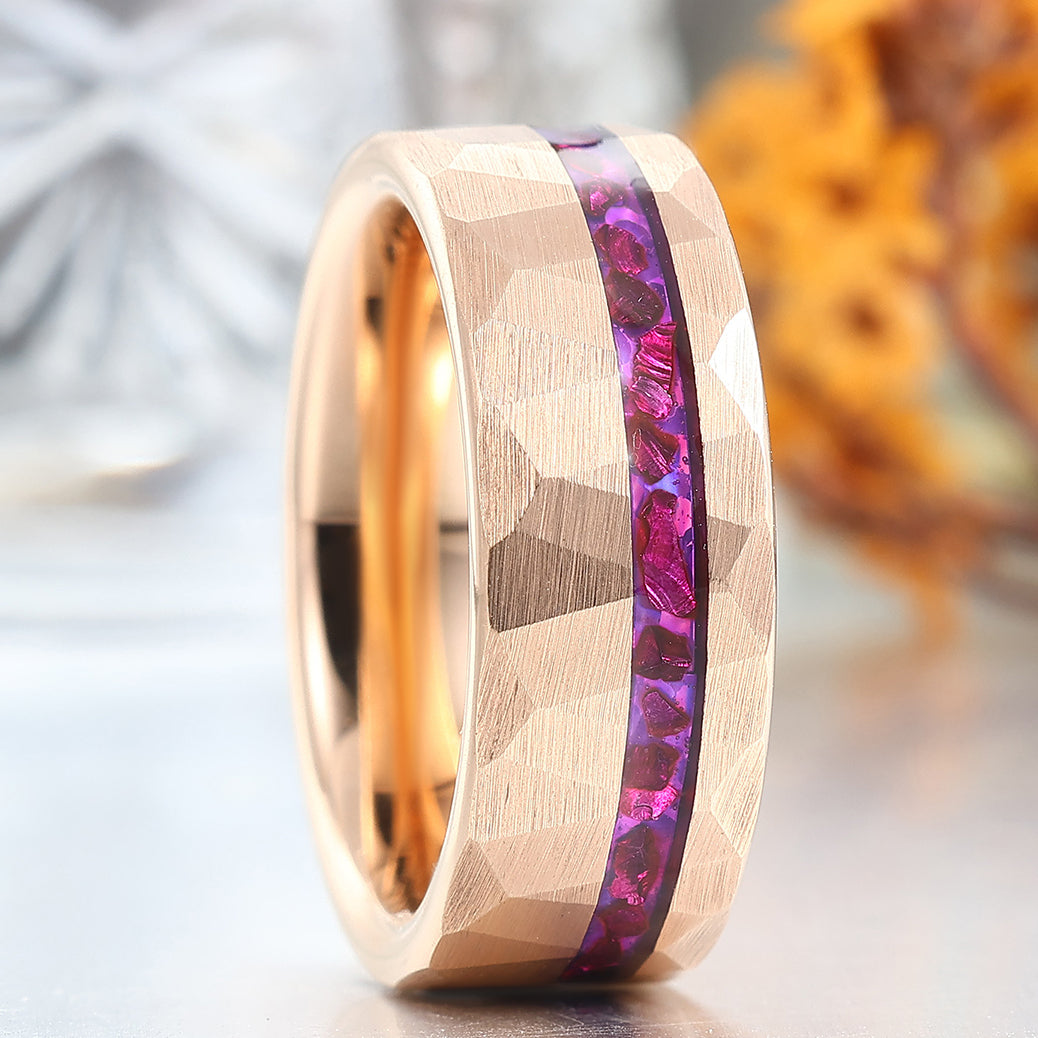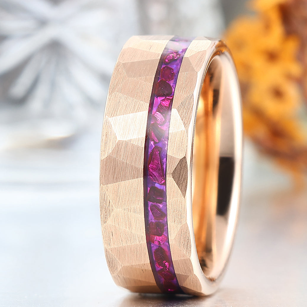 Purple Amethyst Men's Wedding Band 8mm Hammered Rose Gold Plated Tungsten Ring