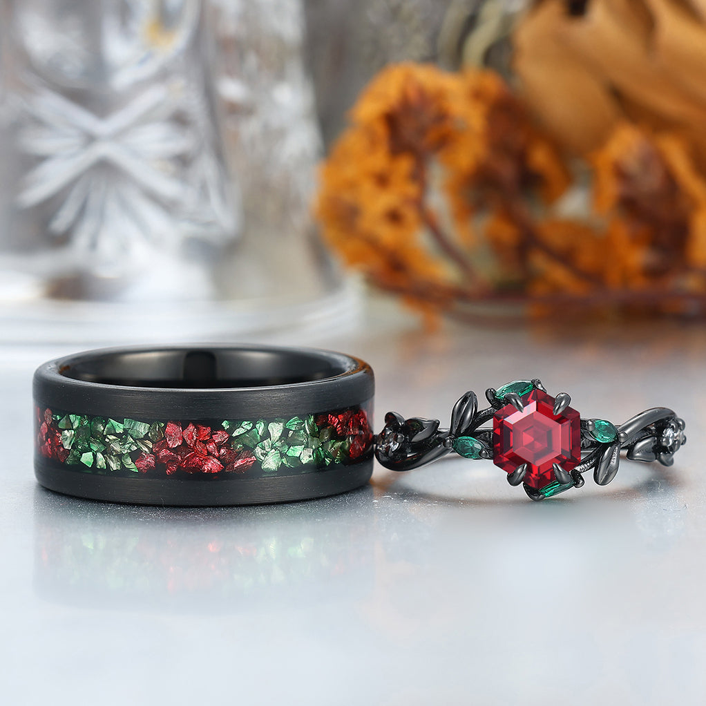 Red Garnet Sprigs Engagement Couple Rings Promise Green Tungsten Matching Wedding Rings