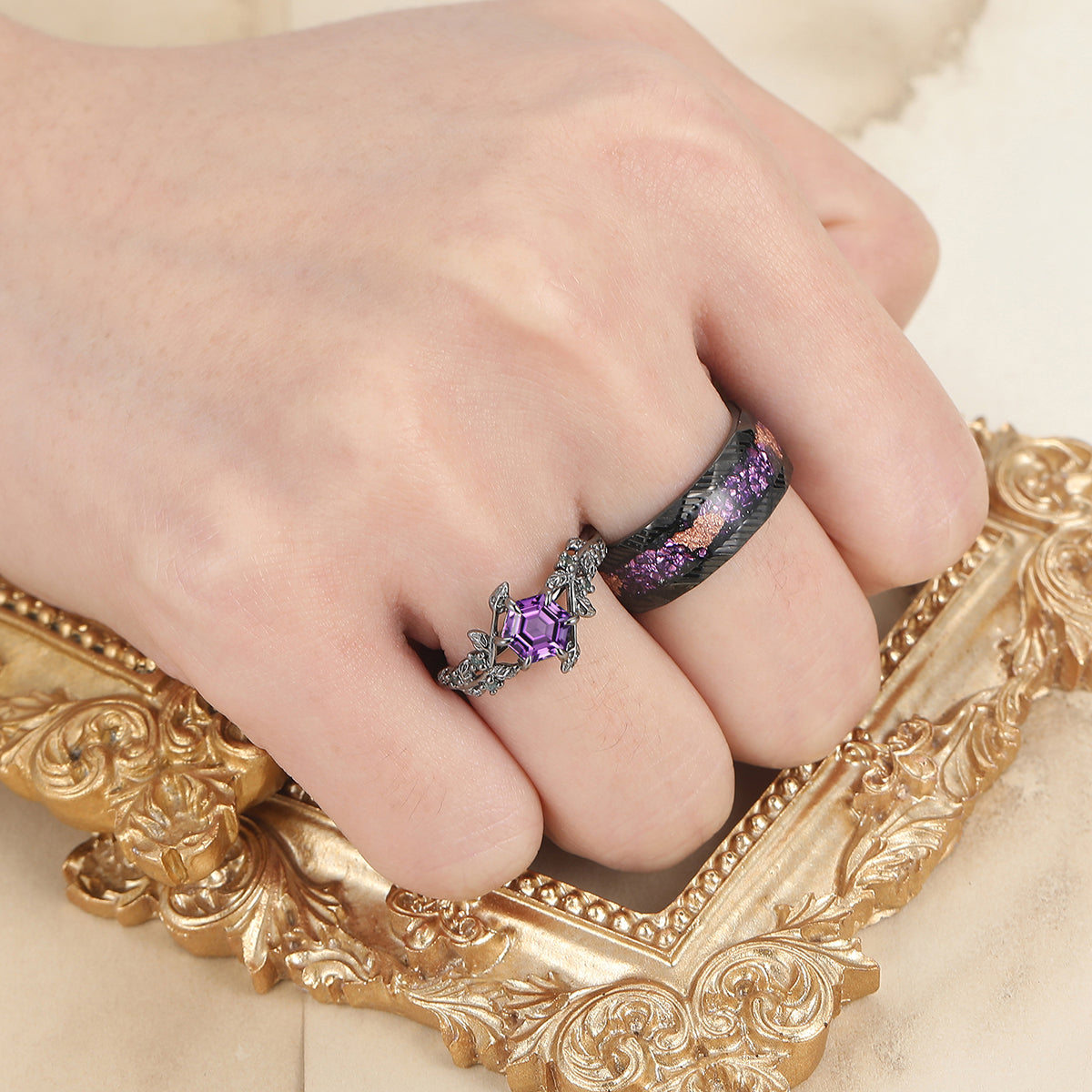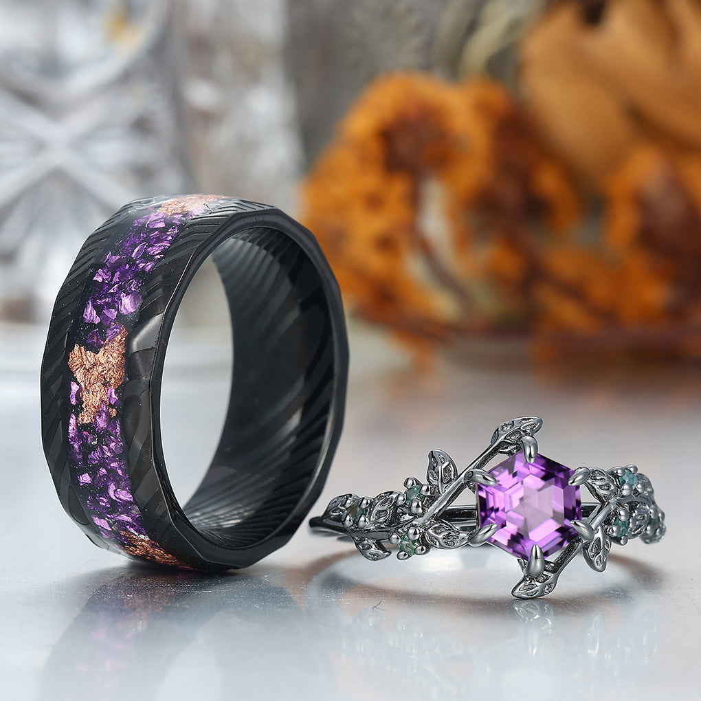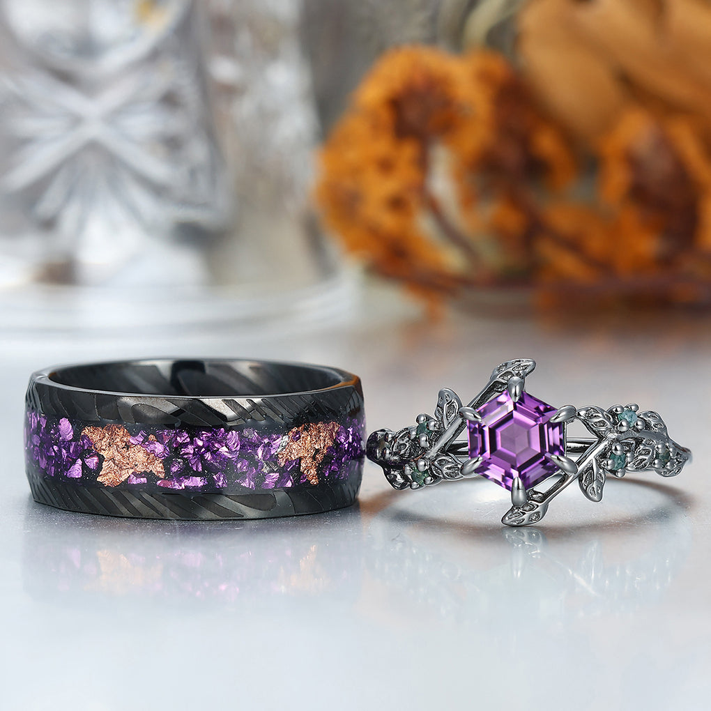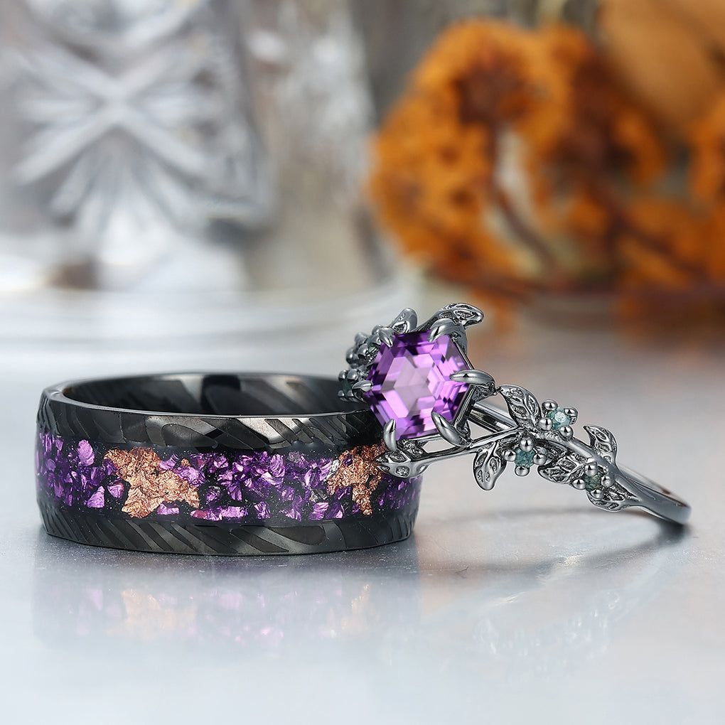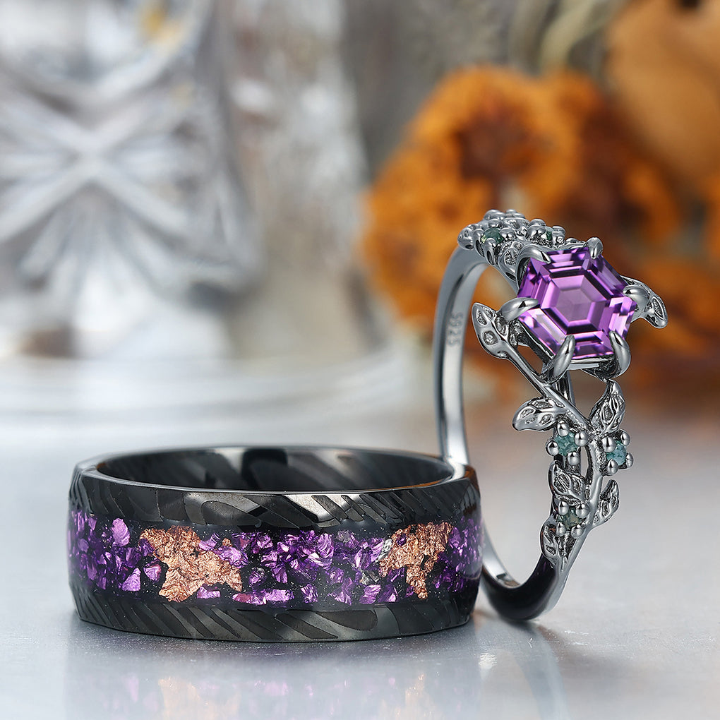 Retro Branches Purple Amethyst Engagement Couples Ring Set Matching Tungsten Promise Wedding Rings