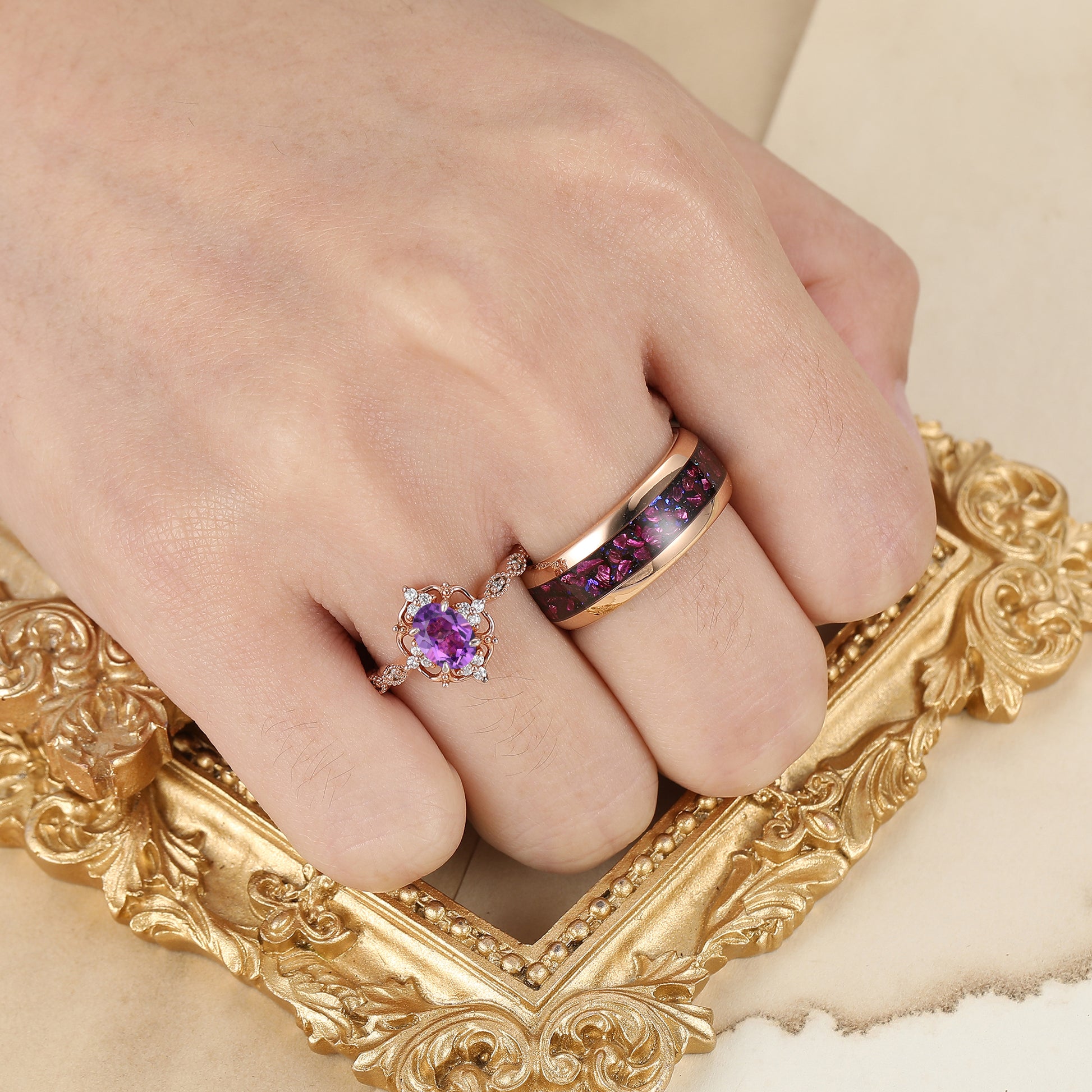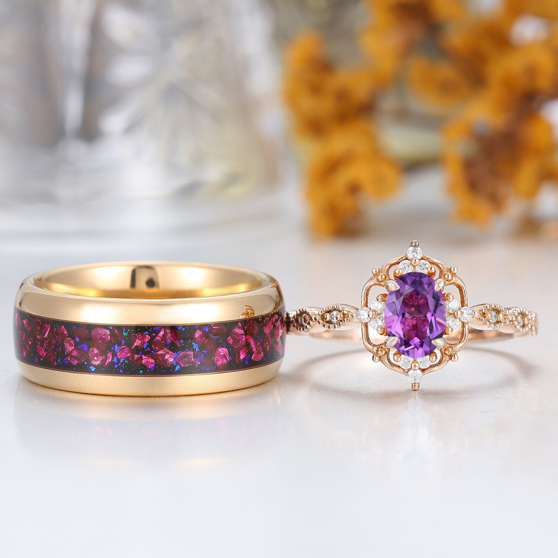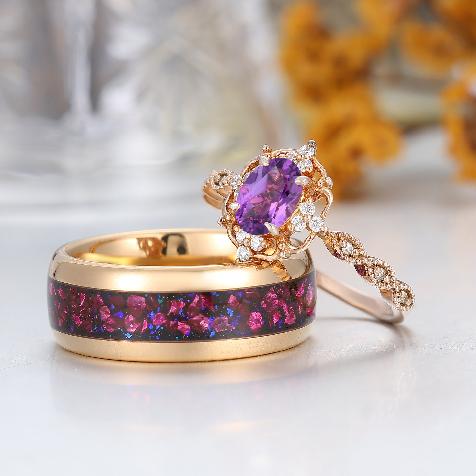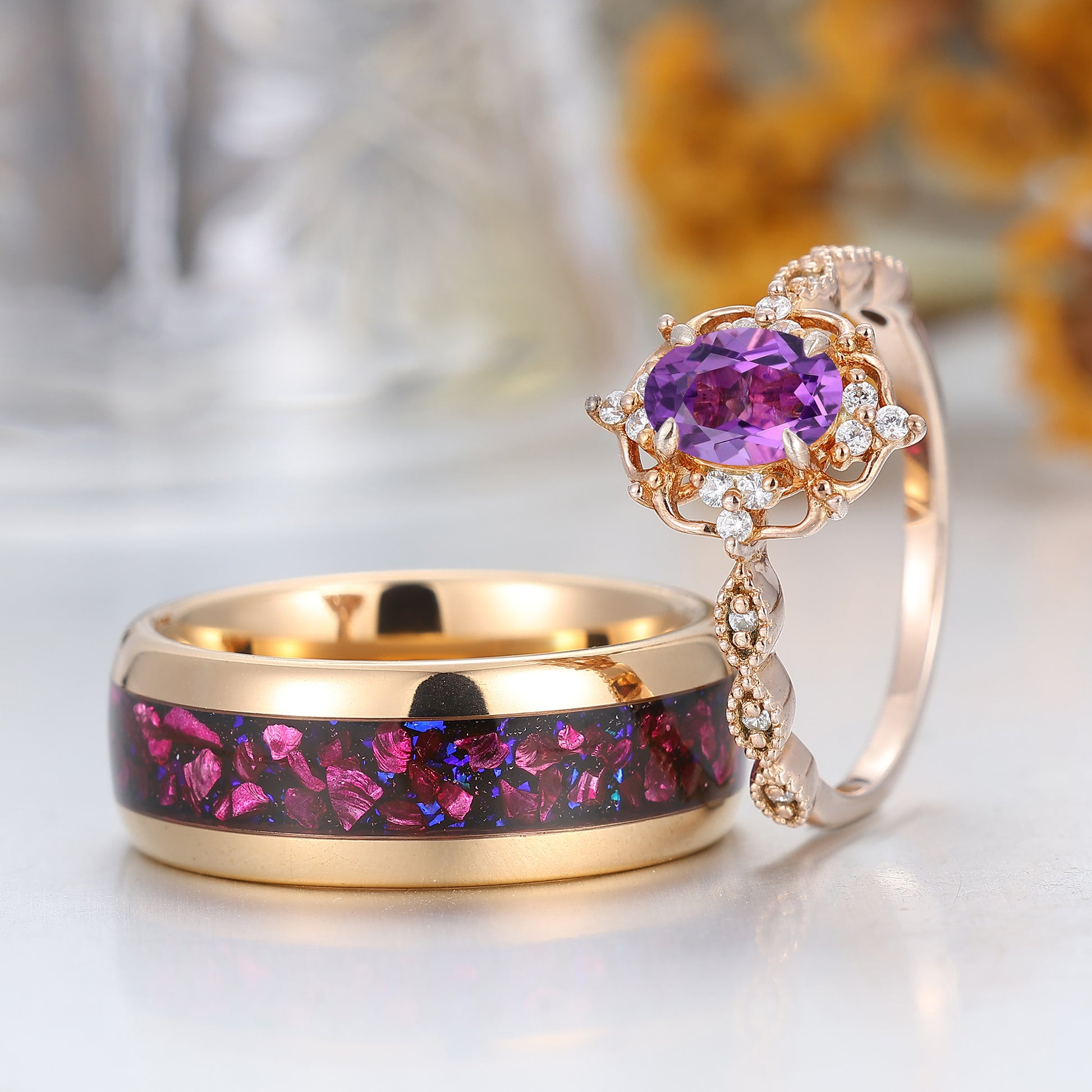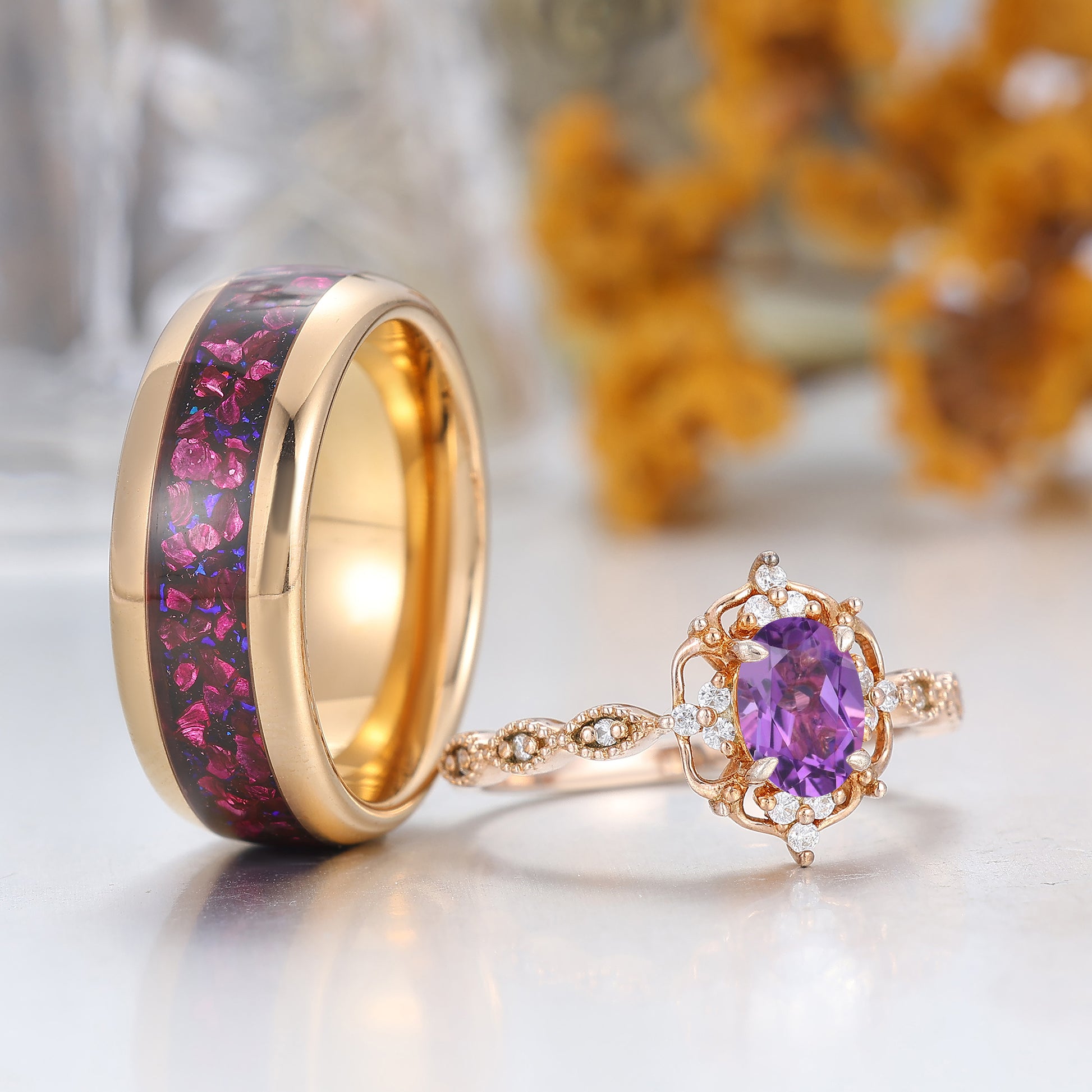 Retro Oval Natural Amethyst Filigreed Couple Ring Set Purple Amethyst Tungsten His And Hers Rings