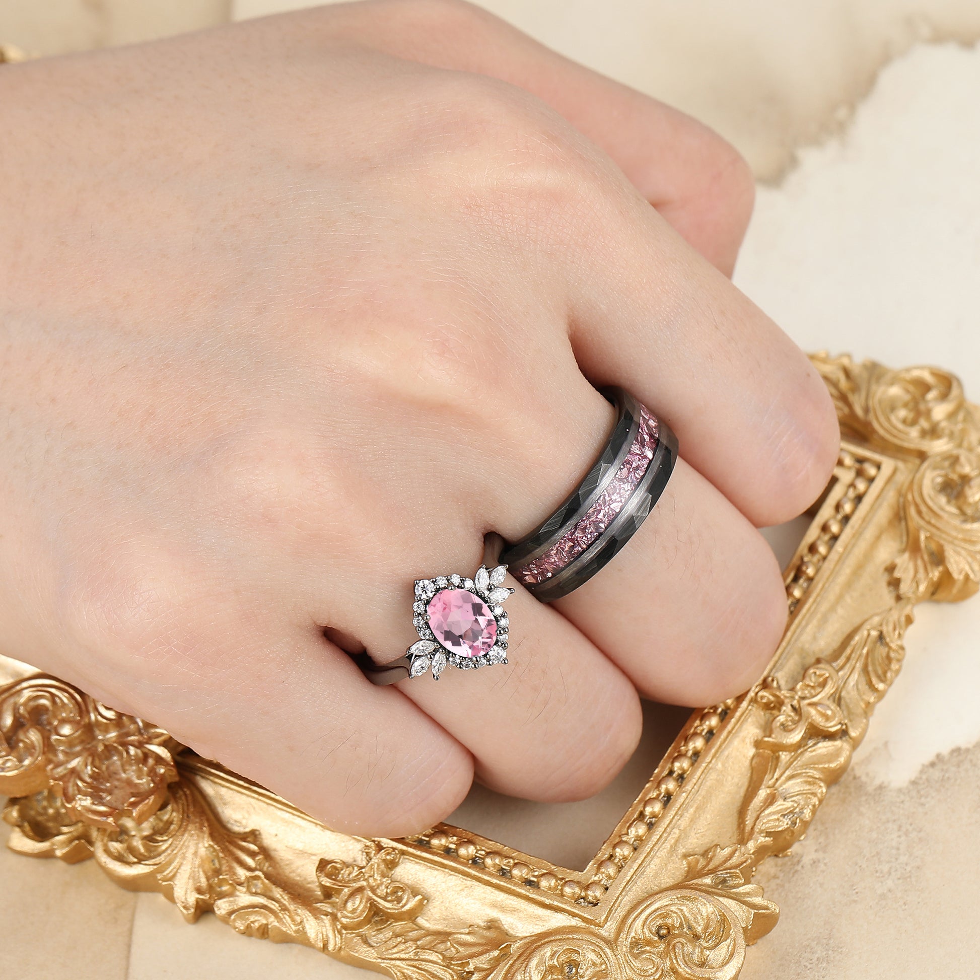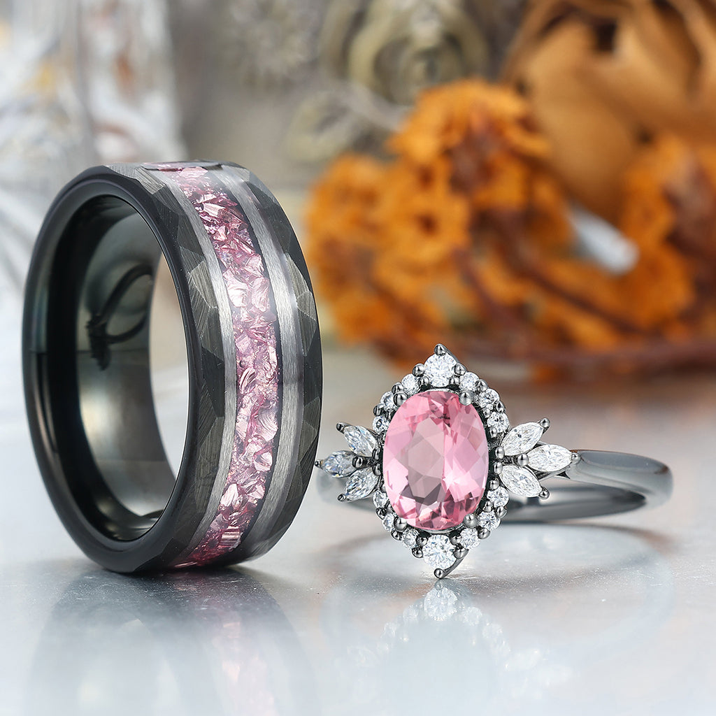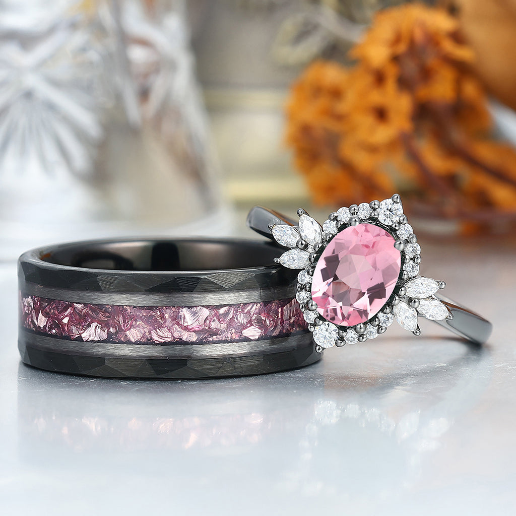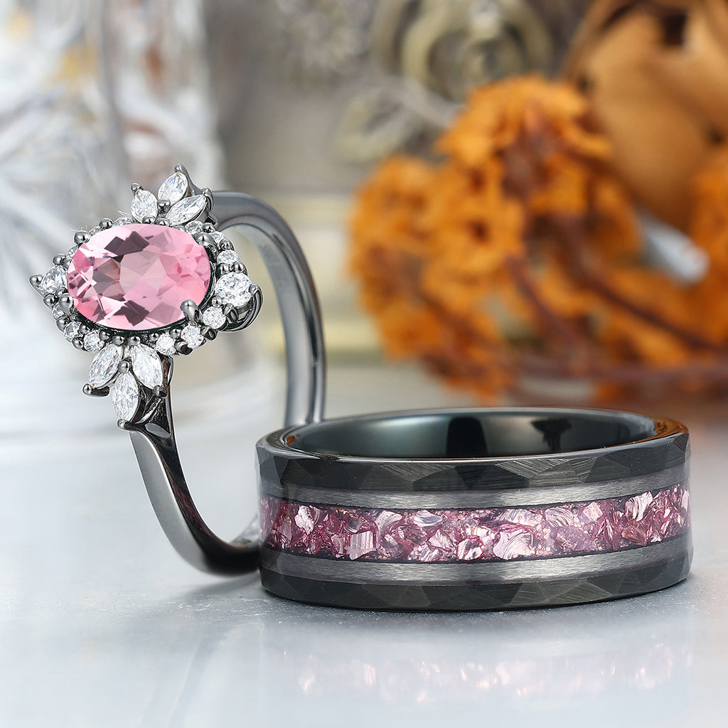 Romantic Pink Morganite Engagement Couple Rings Matching Black Tungsten His And Hers Wedding Bands
