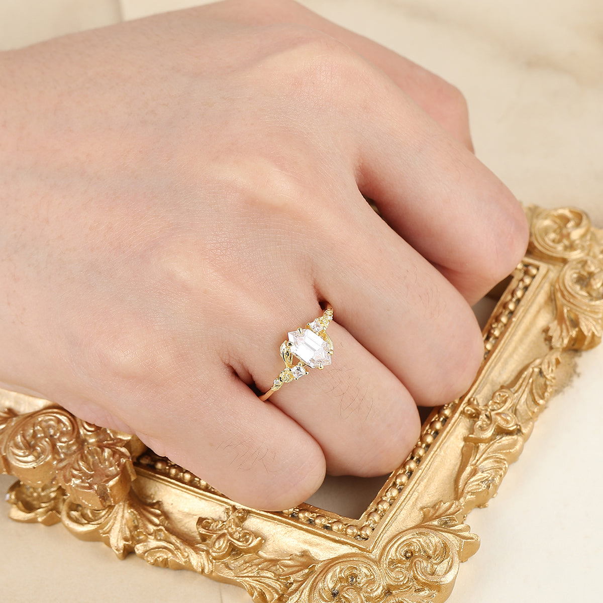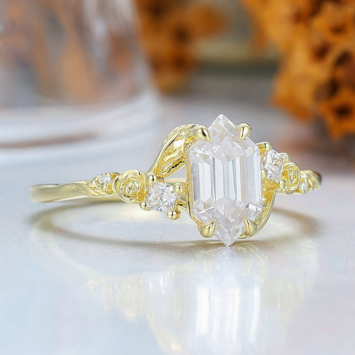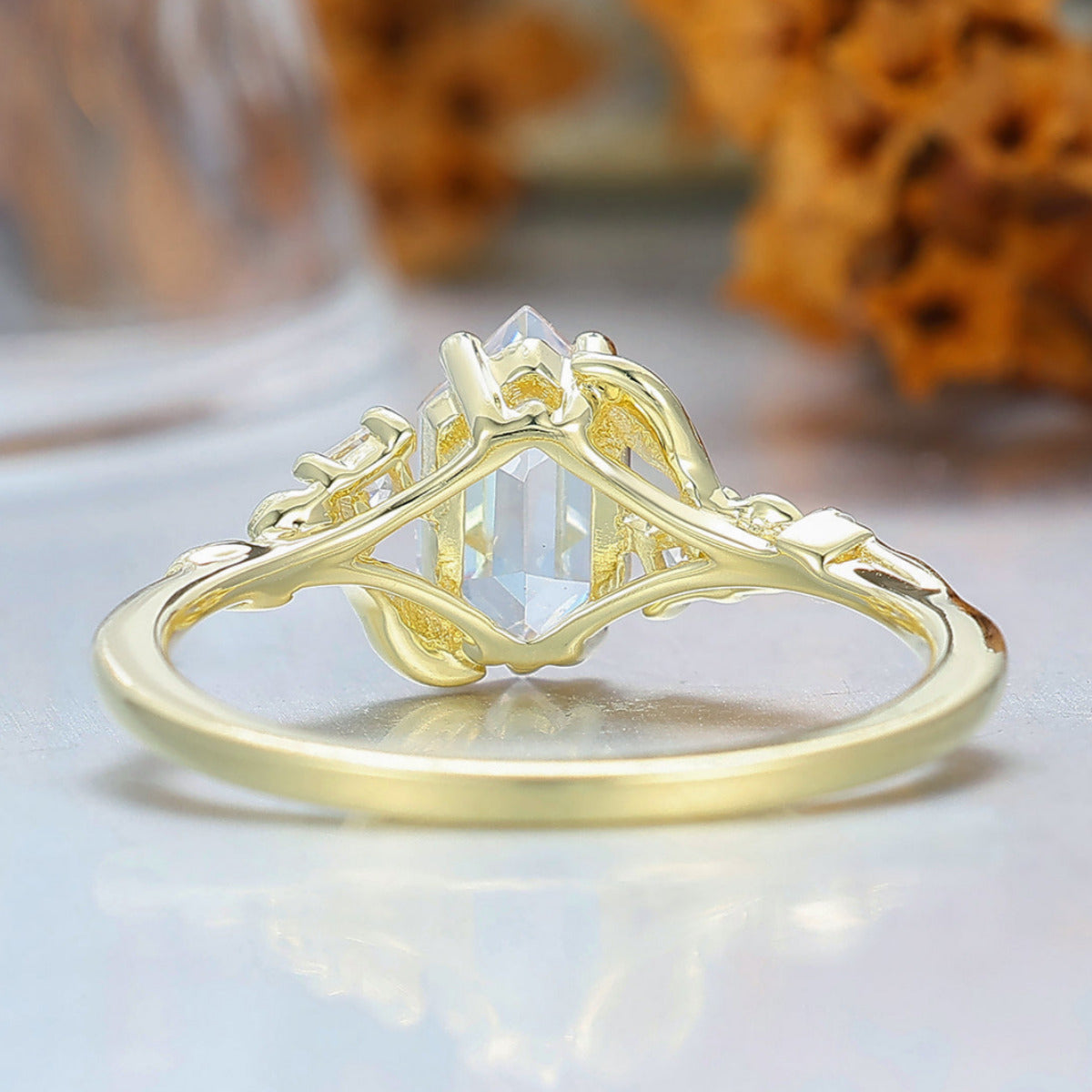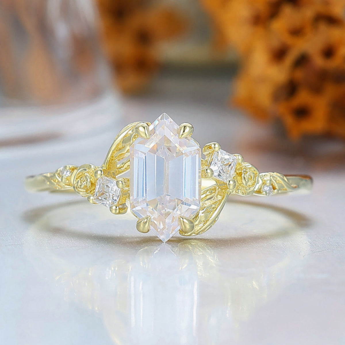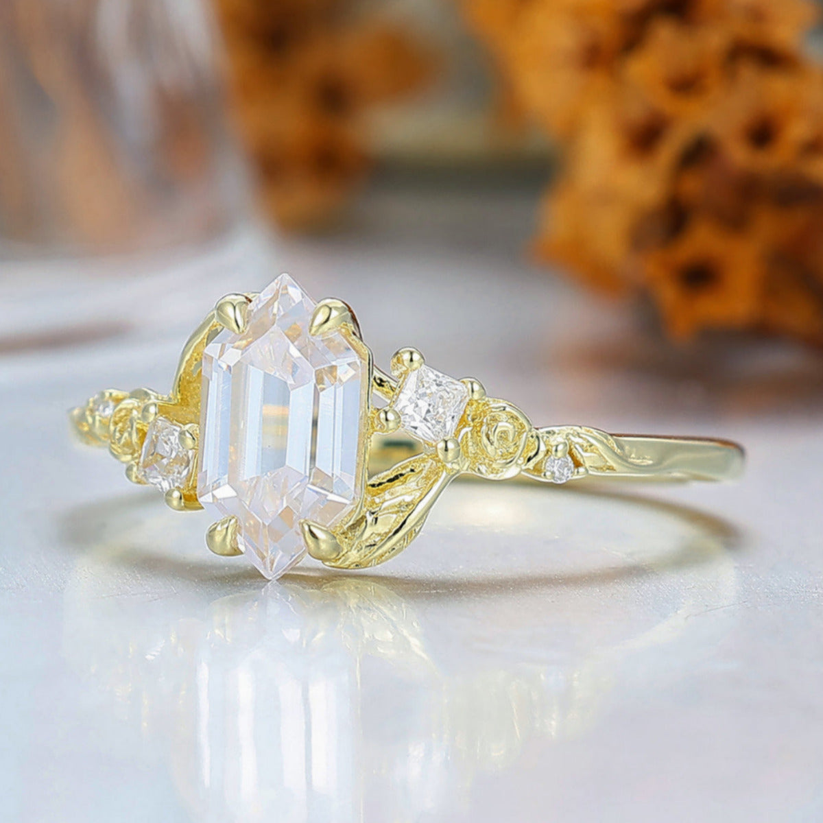 Rose Leaf Engraved Moissanite Engagement Ring Nature Inspired Women Ring Yellow Gold Promise Ring