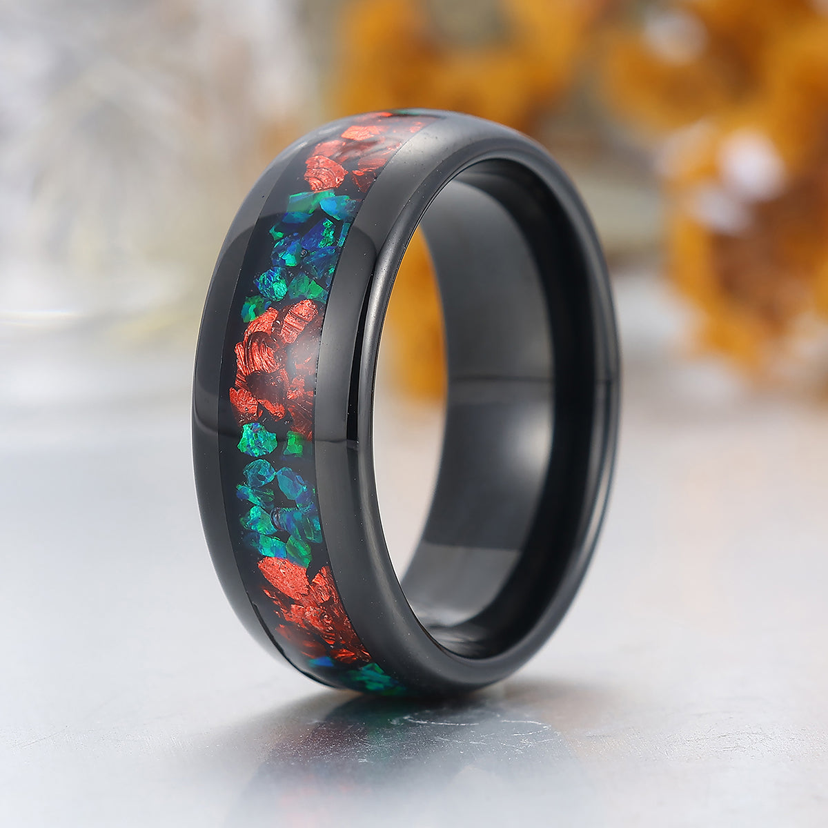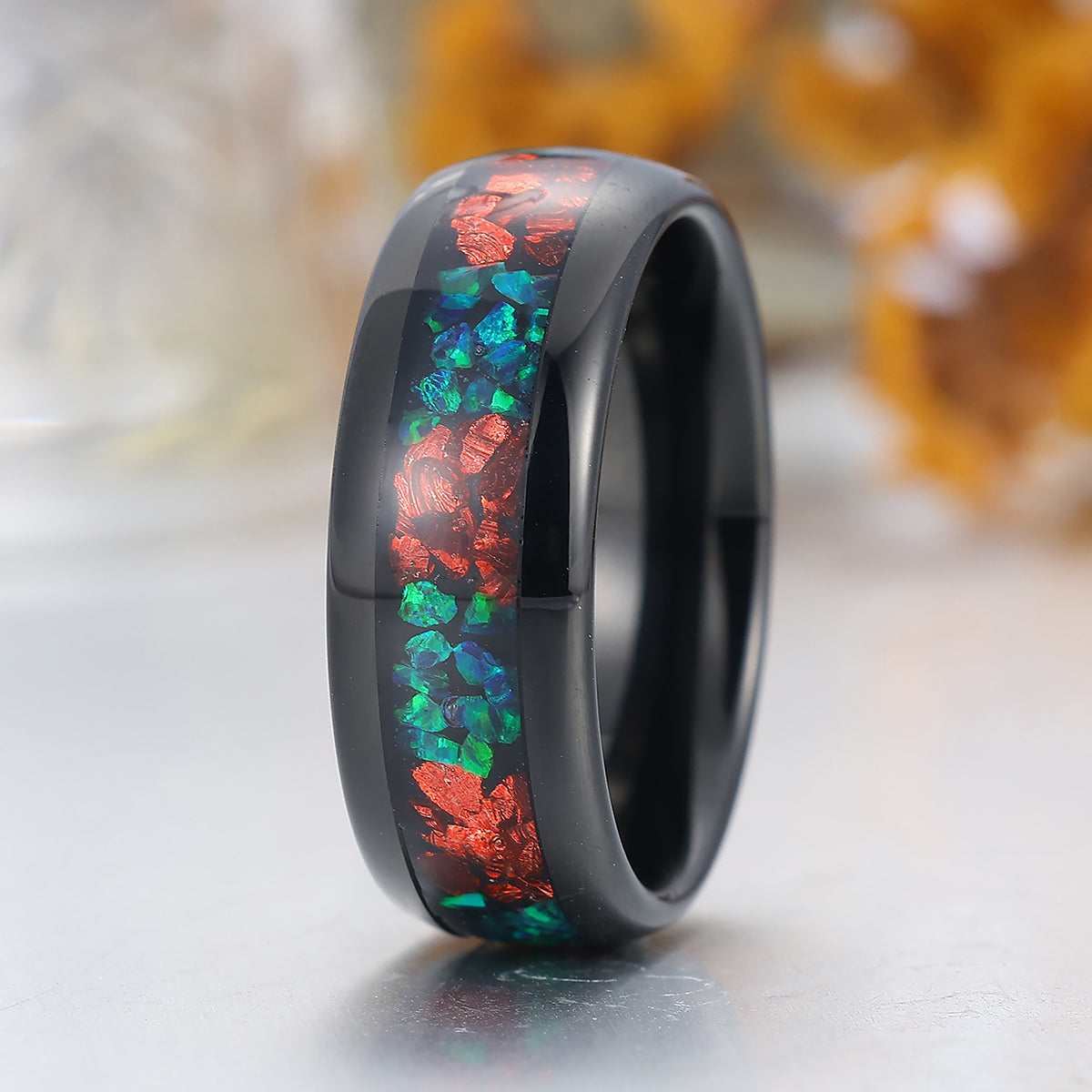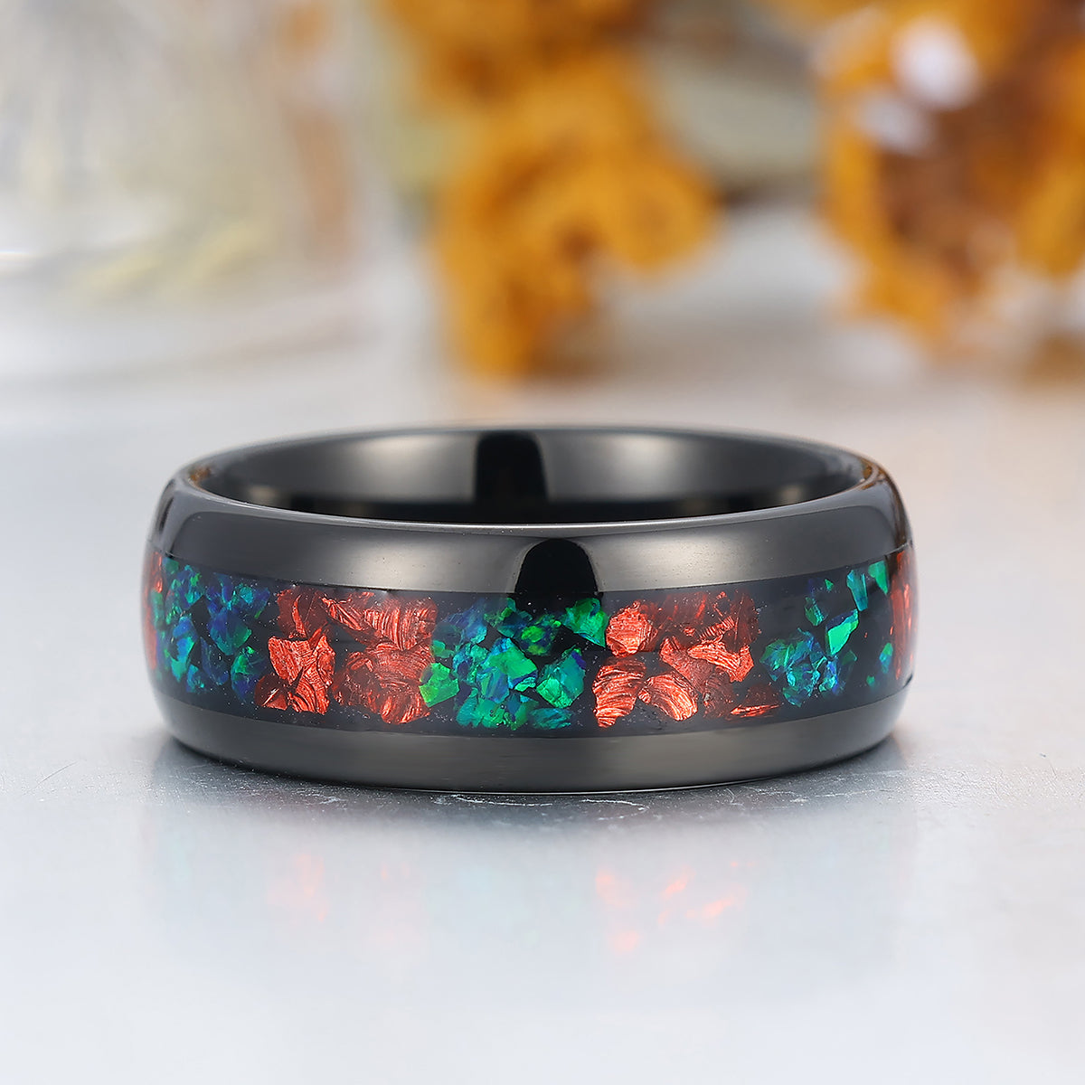 Metal Type: Tungsten Carbide - Crushed Lab Ruby and Peacock Green Opal Inlay - Hypoallergenic