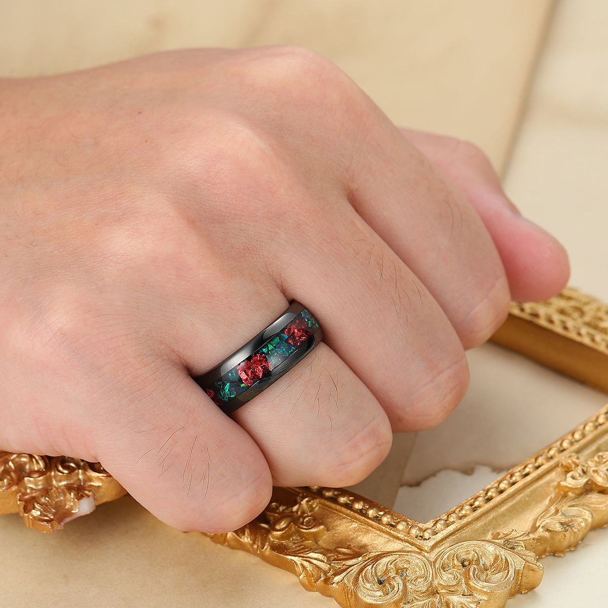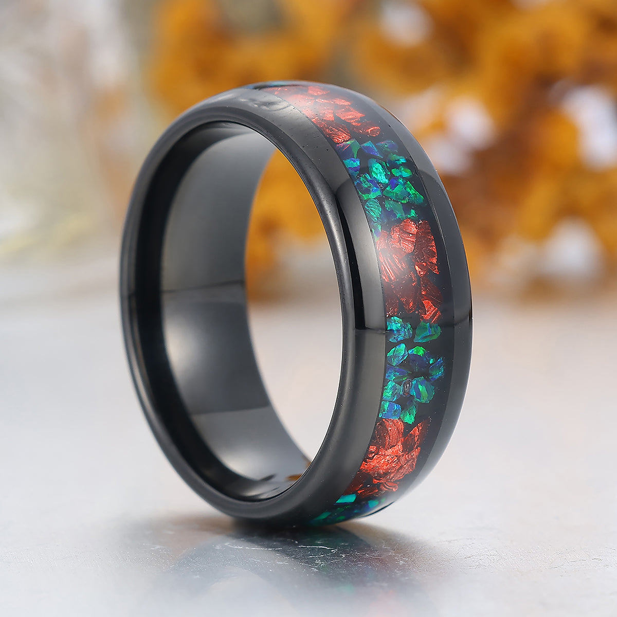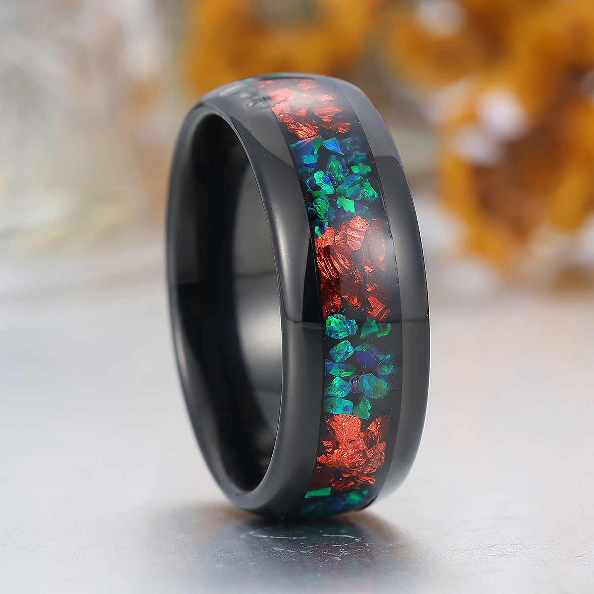 Ruby And Peacock Green Opal Tungsten Ring Polished Dome Black Men's Tungsten Ring