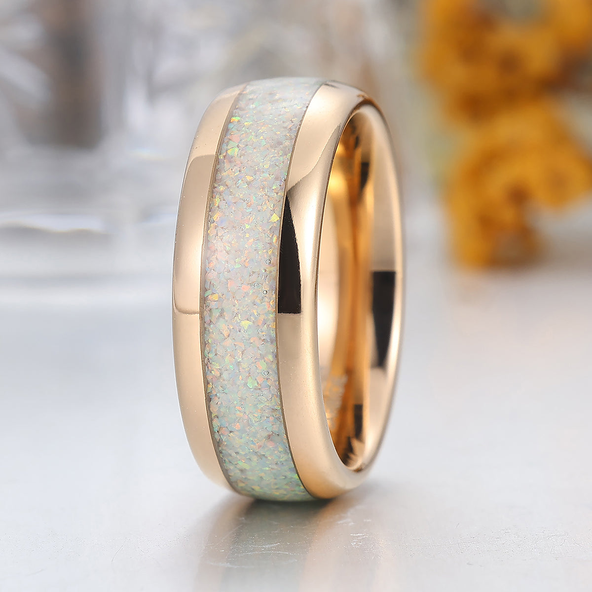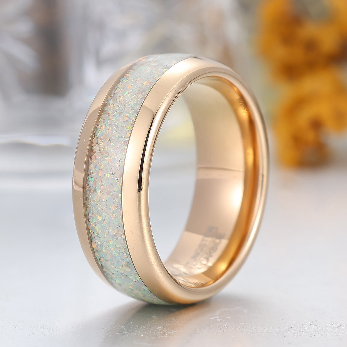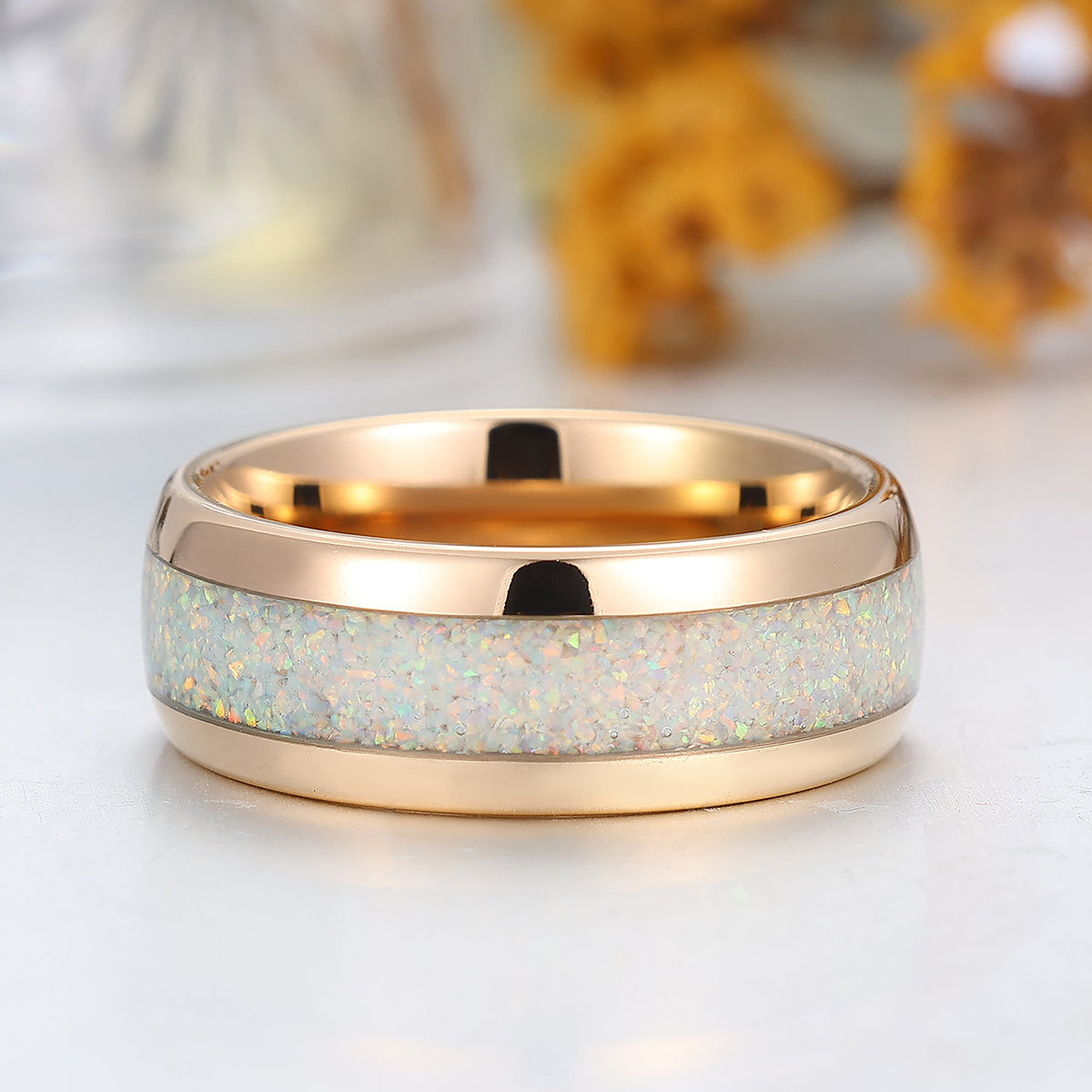Snow White Opal Tungsten Ring Polished Dome Rose Gold Unisex Tungsten Ring
