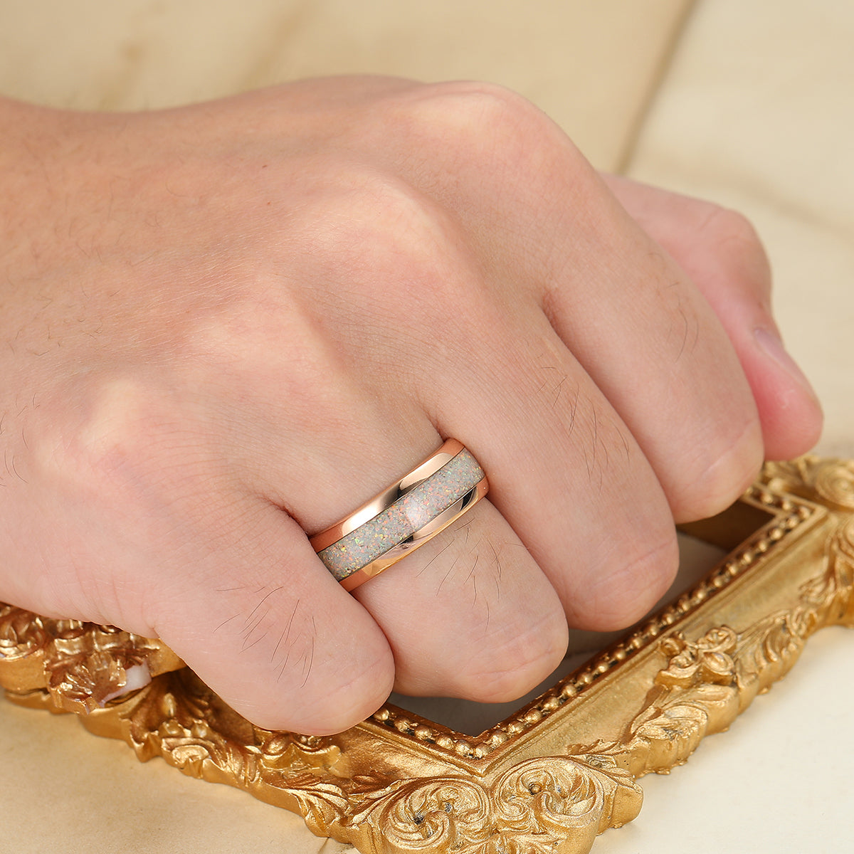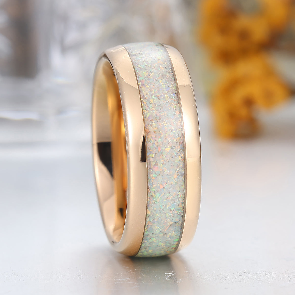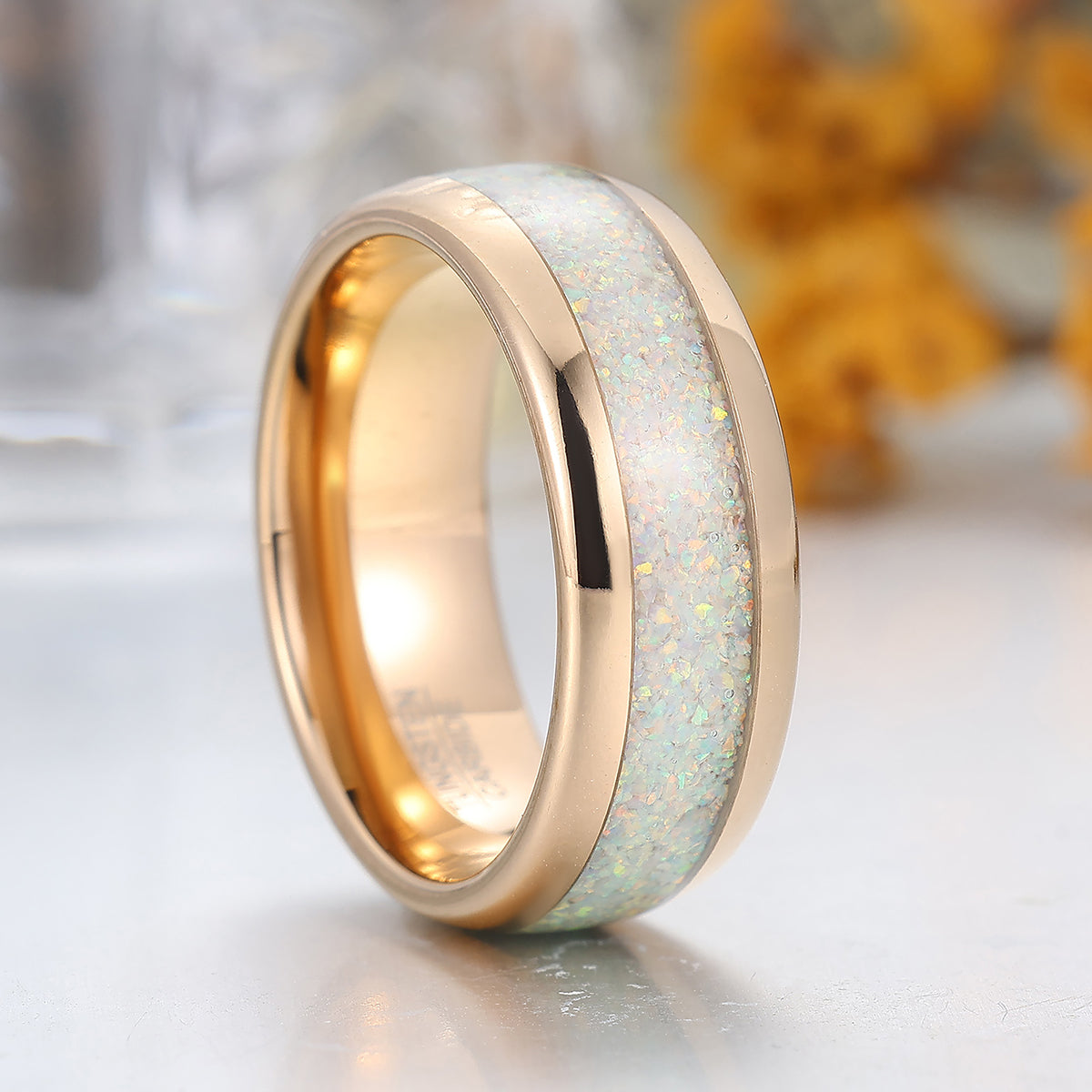 Snow White Opal Tungsten Ring Polished Dome Rose Gold Unisex Tungsten Ring