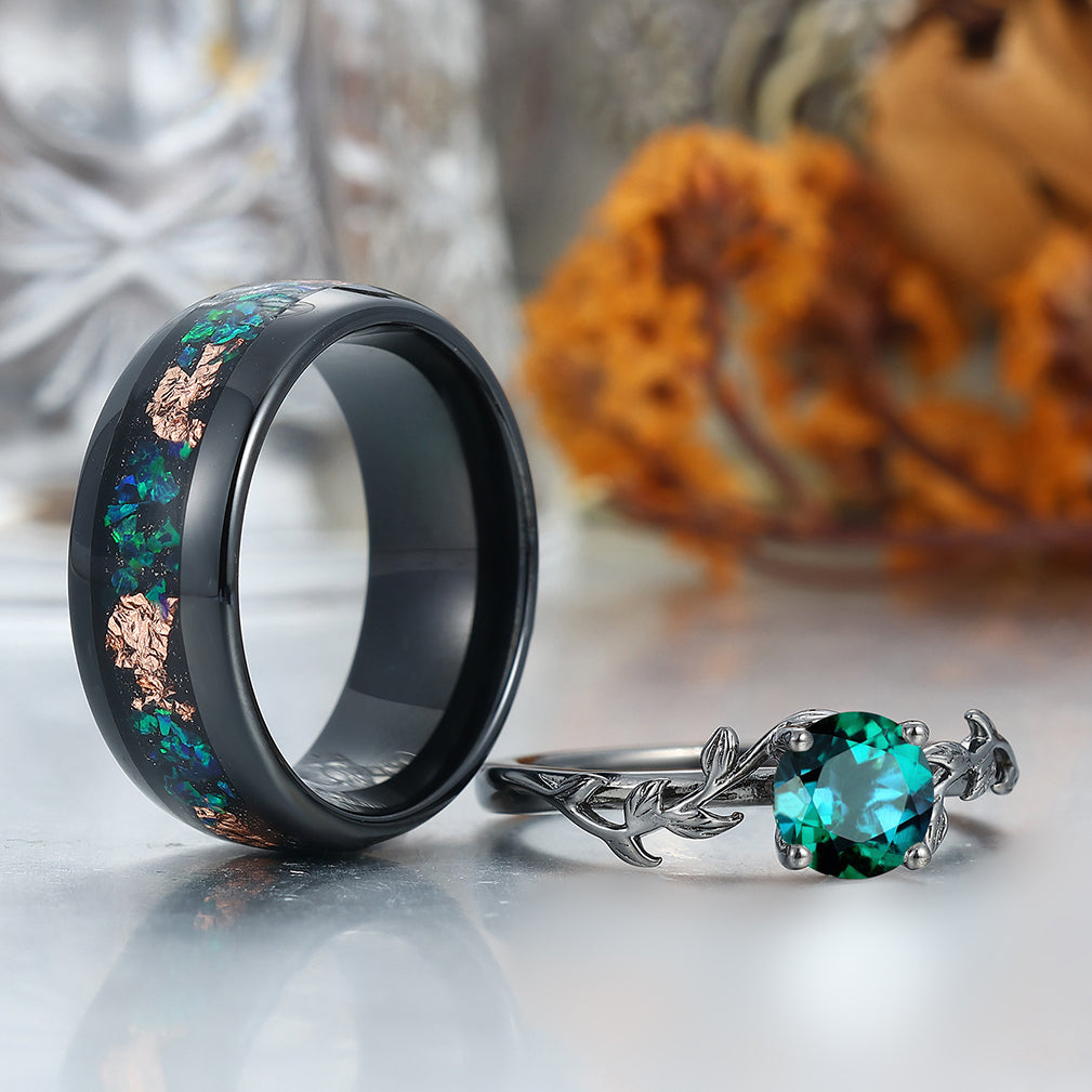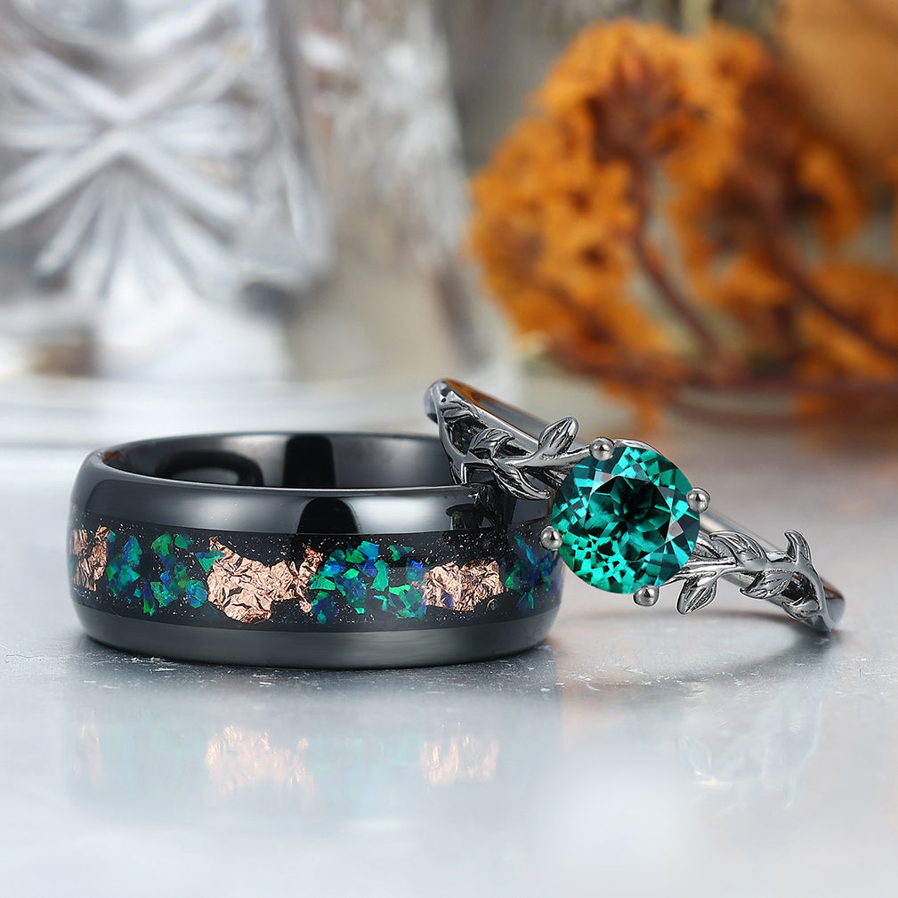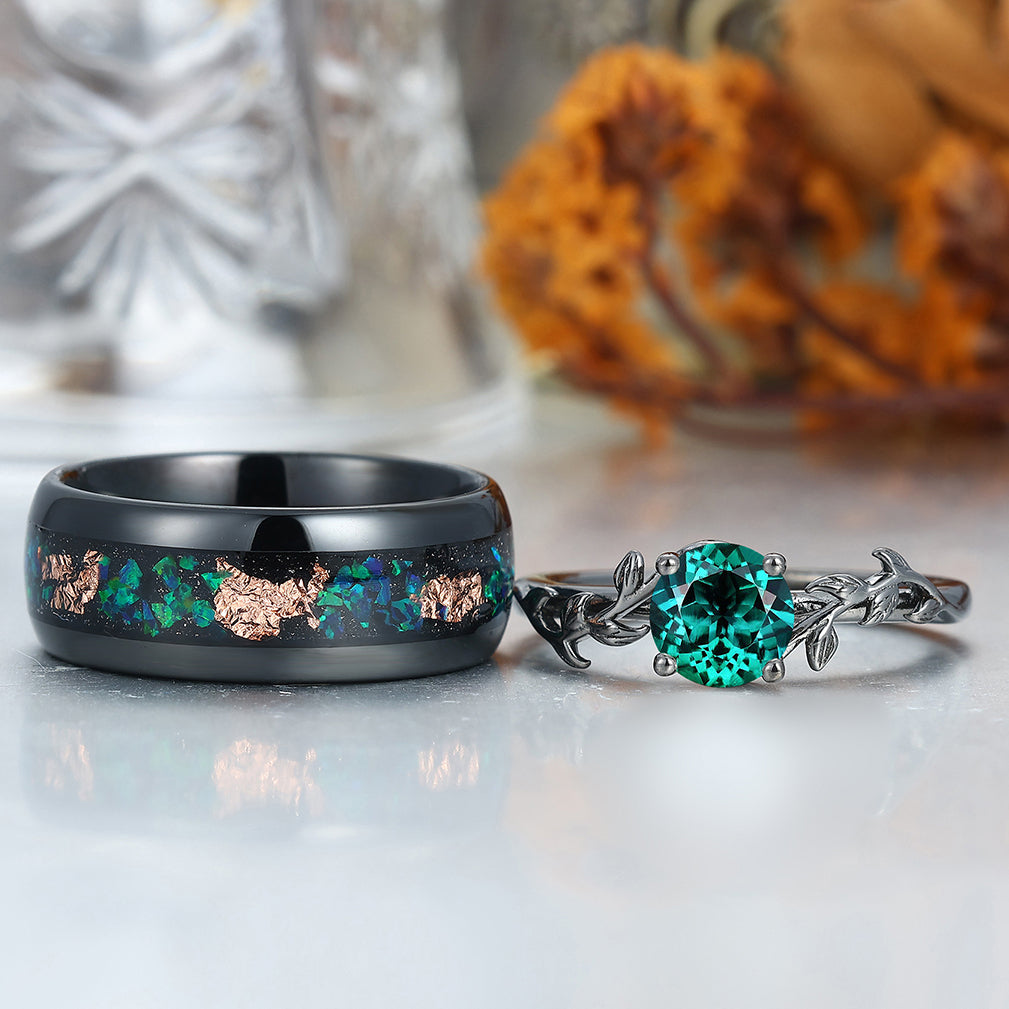 Solitaire 0.8CT Round CutLab Grown Emerald Engagement Couples Ring Set