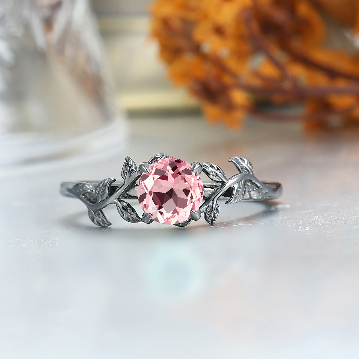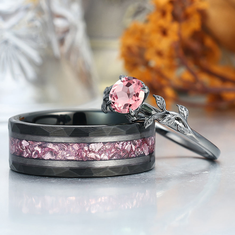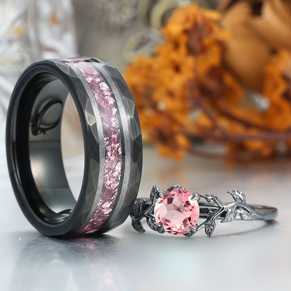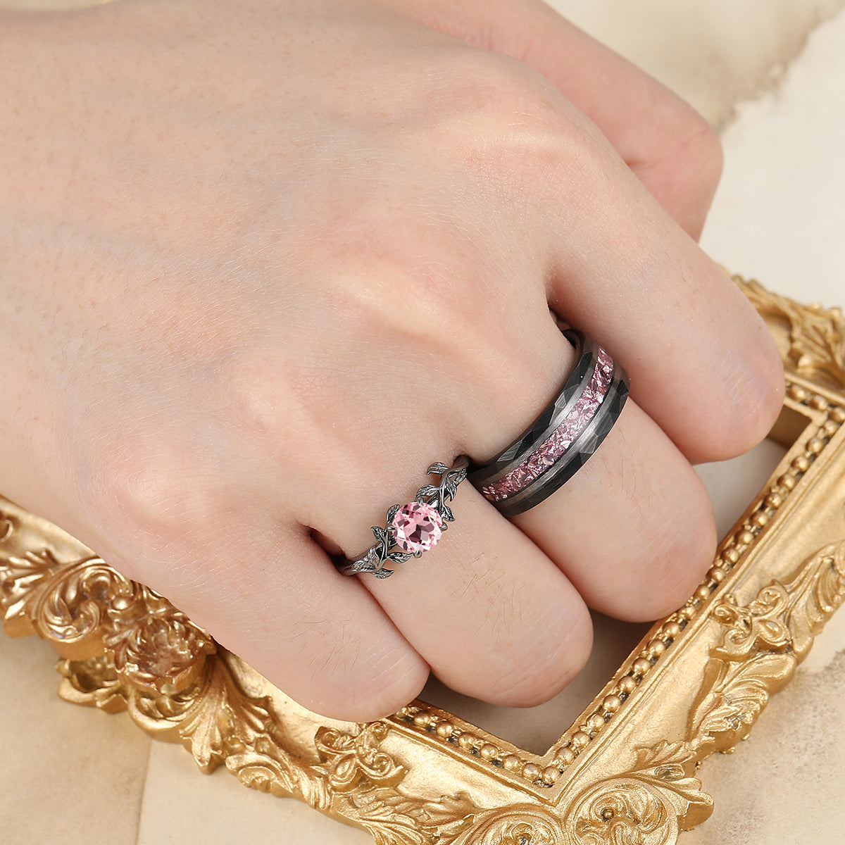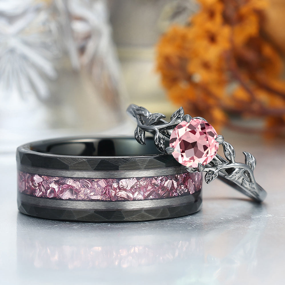 Solitaire Pink Morganite Prongs Engagement Couple Rings Matching Pink Tungsten Promise Wedding Bands