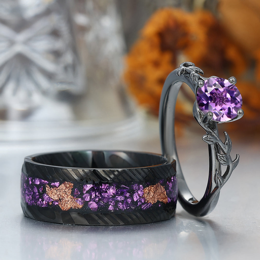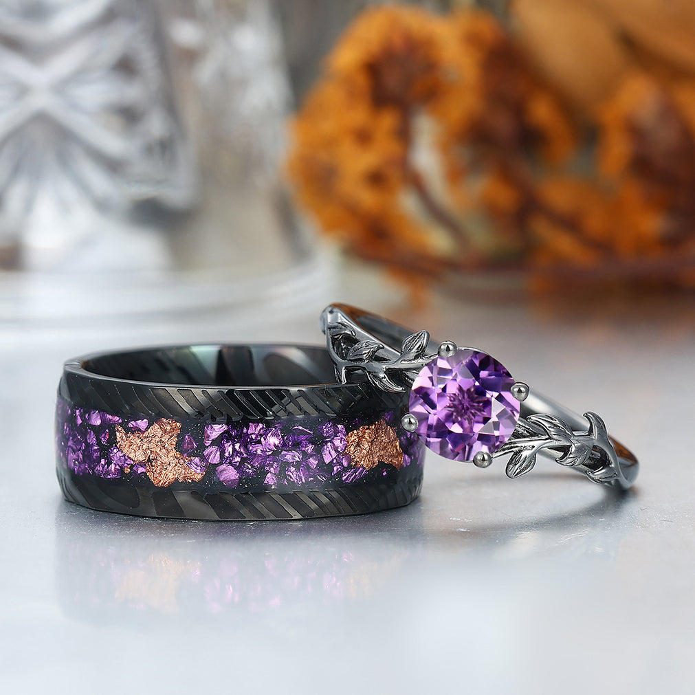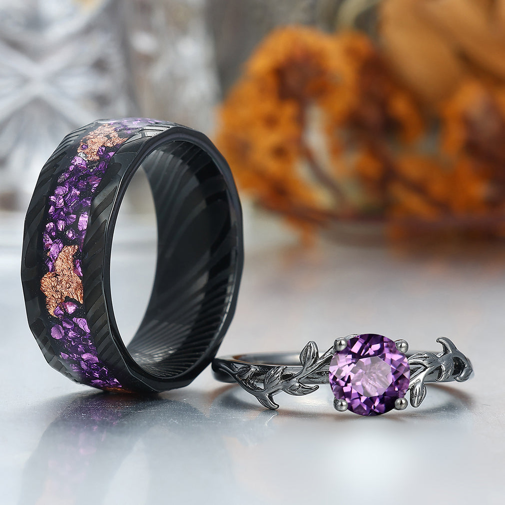 Solitaire Round Cut Amethyst Couples Ring Set Silver And Damascus Steel Matching Ring
