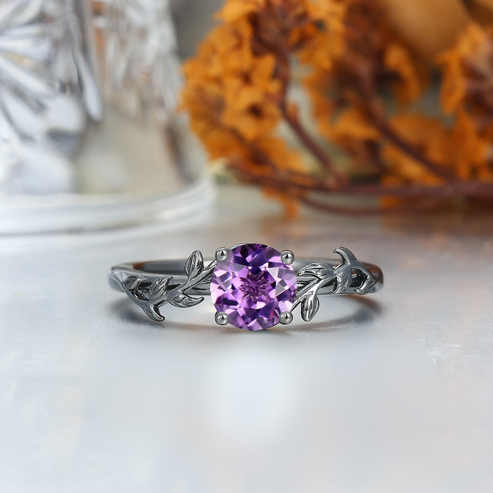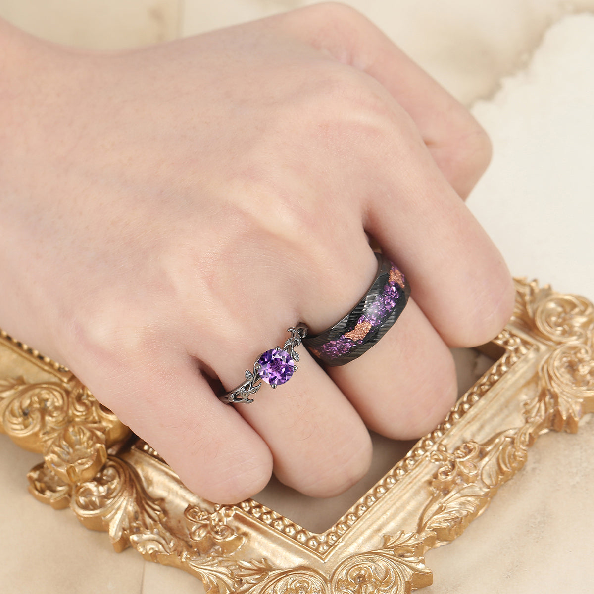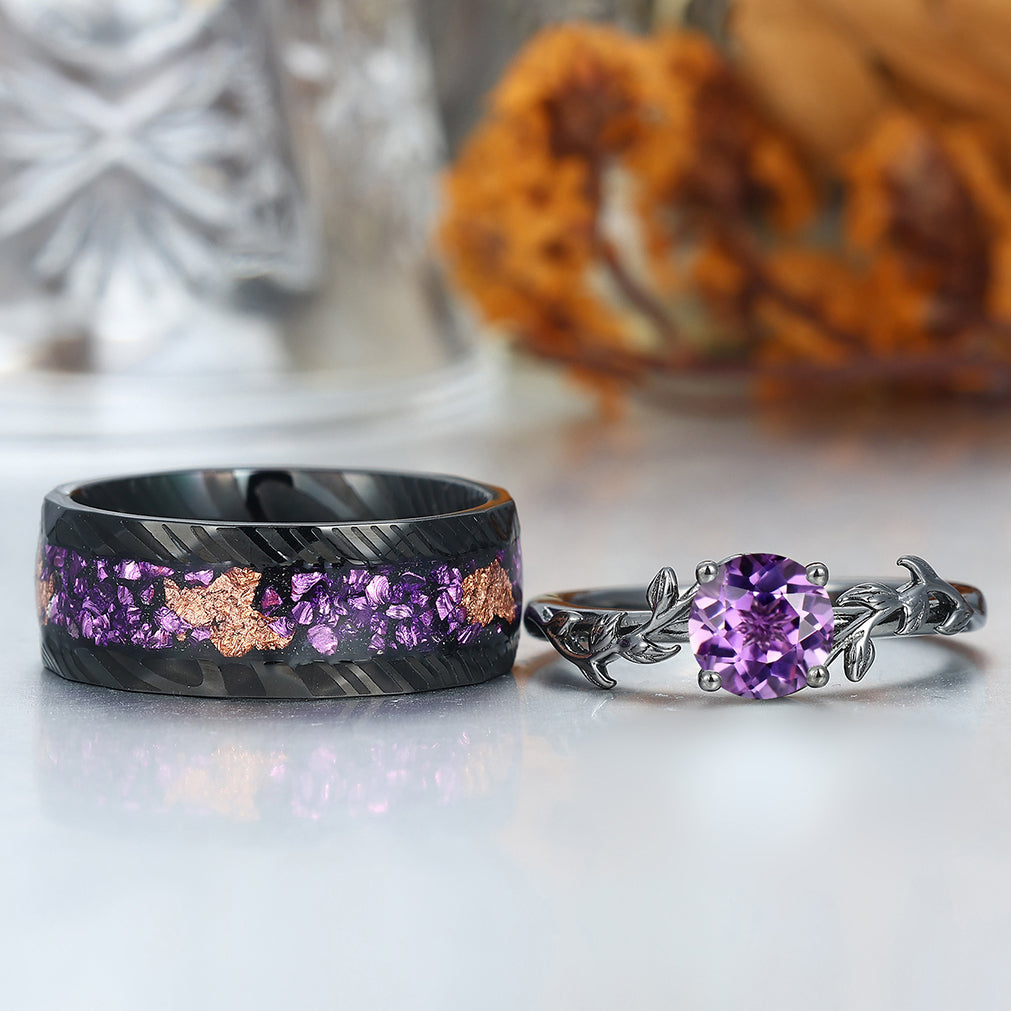 Solitaire Round Cut Amethyst Couples Ring Set Silver And Damascus Steel Matching Ring