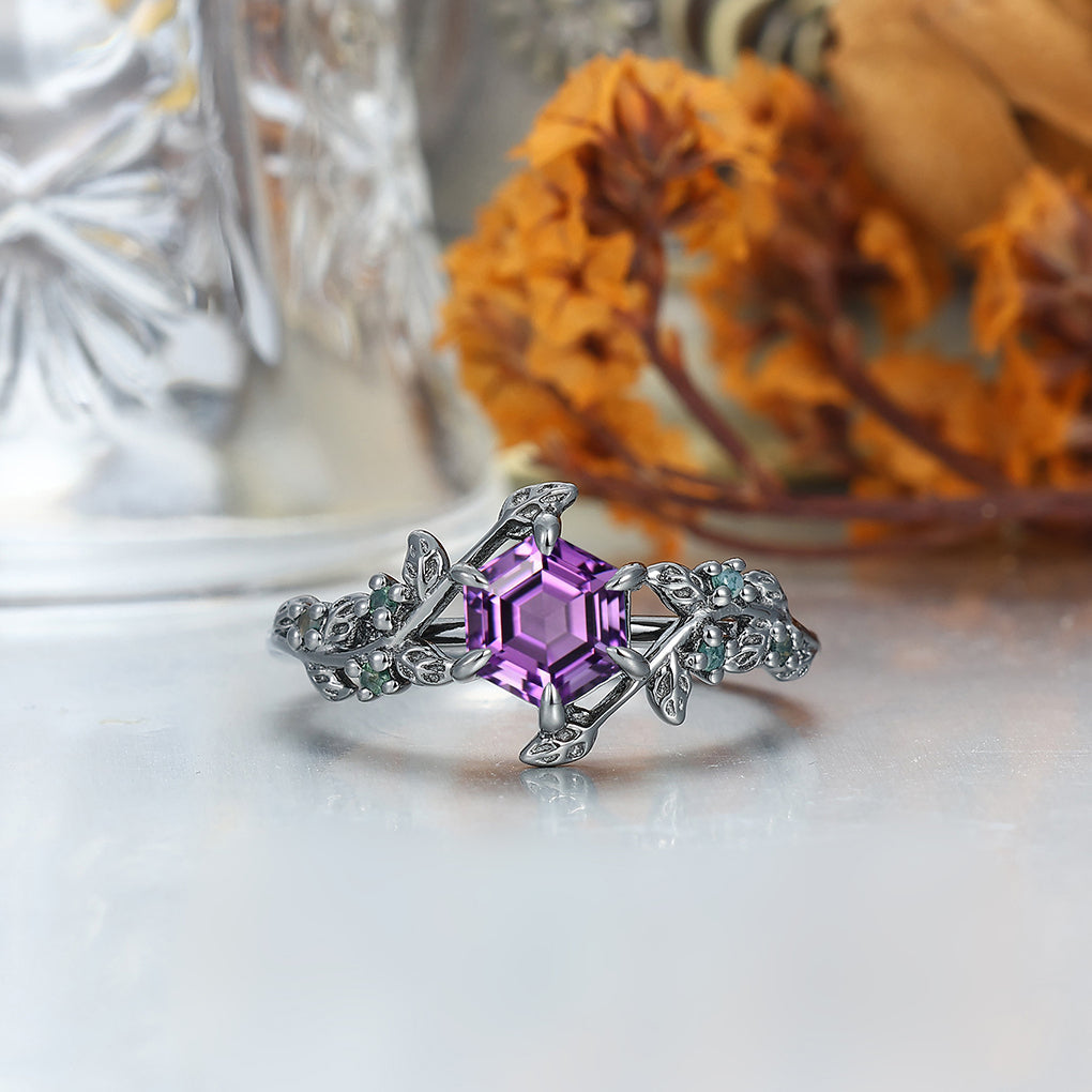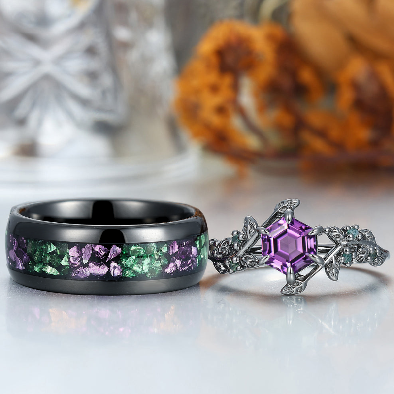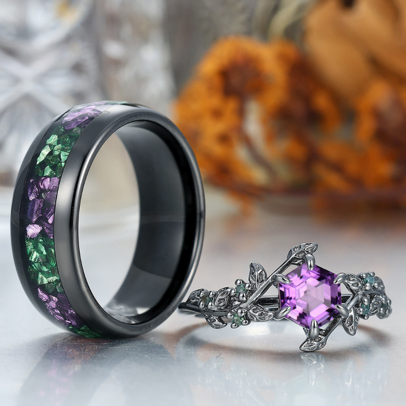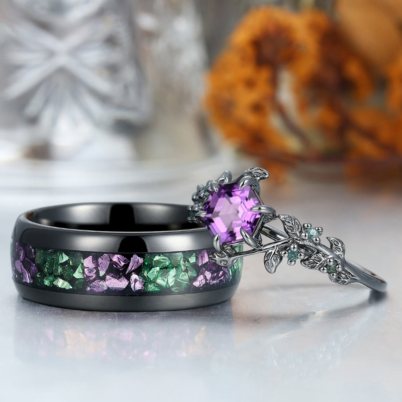 Stylish Natural Engagement Amethyst Twig Couple Rings Matching Tungsten Ring For Men And Women