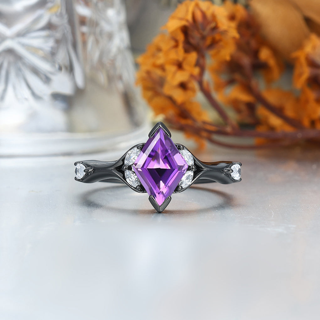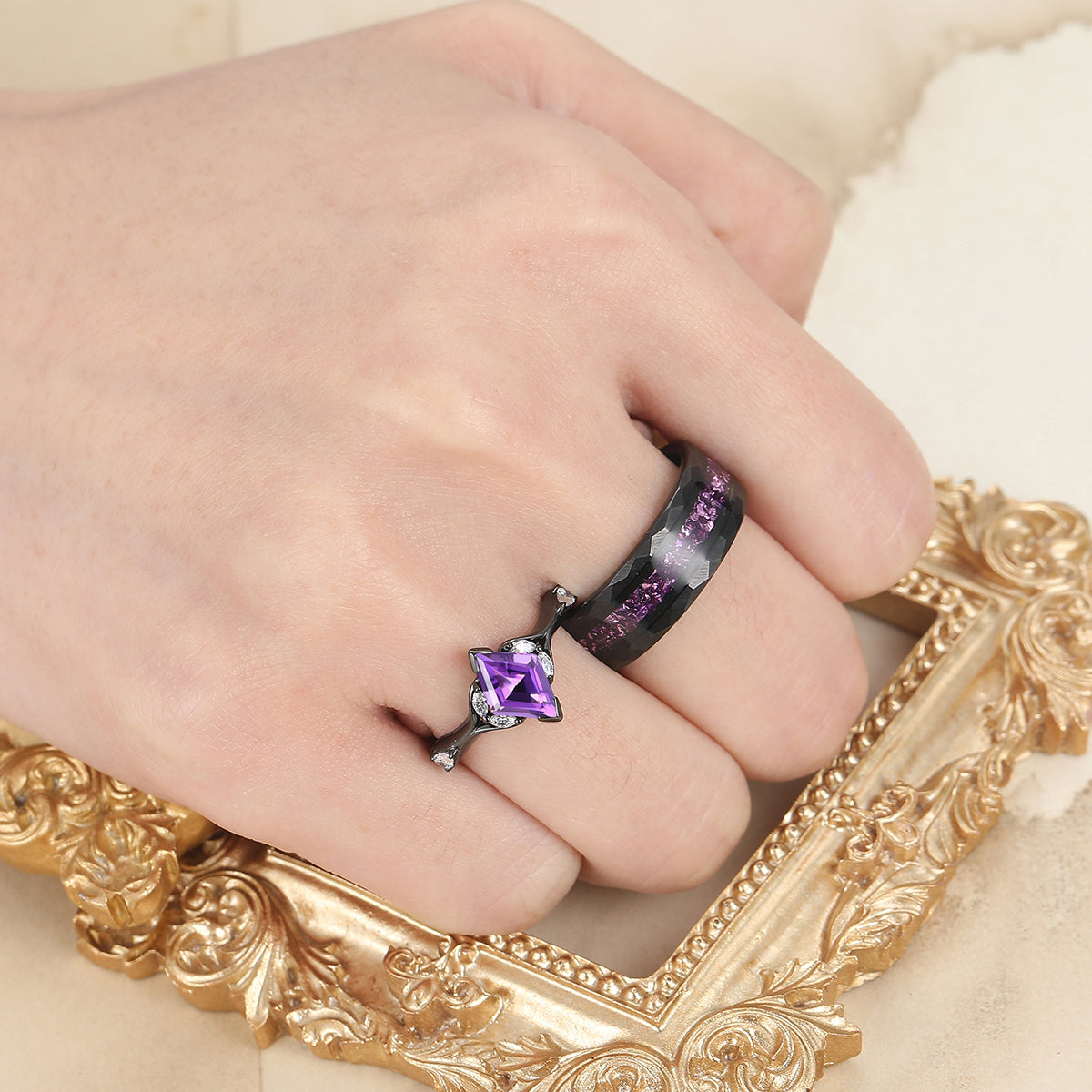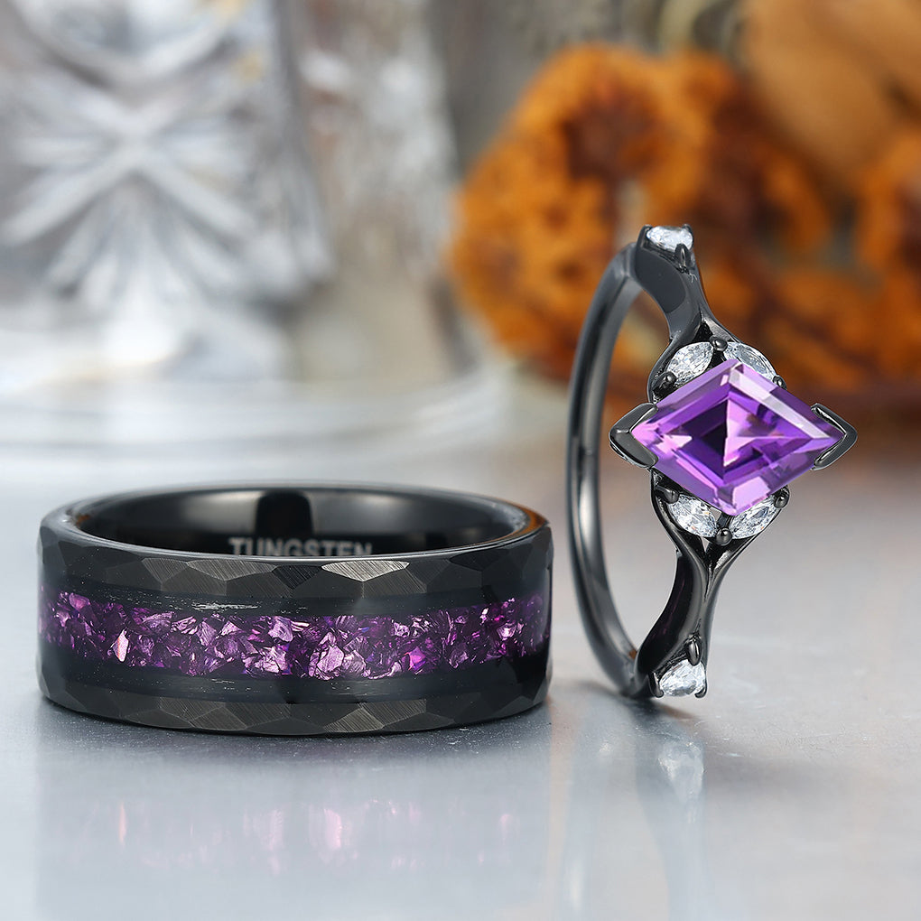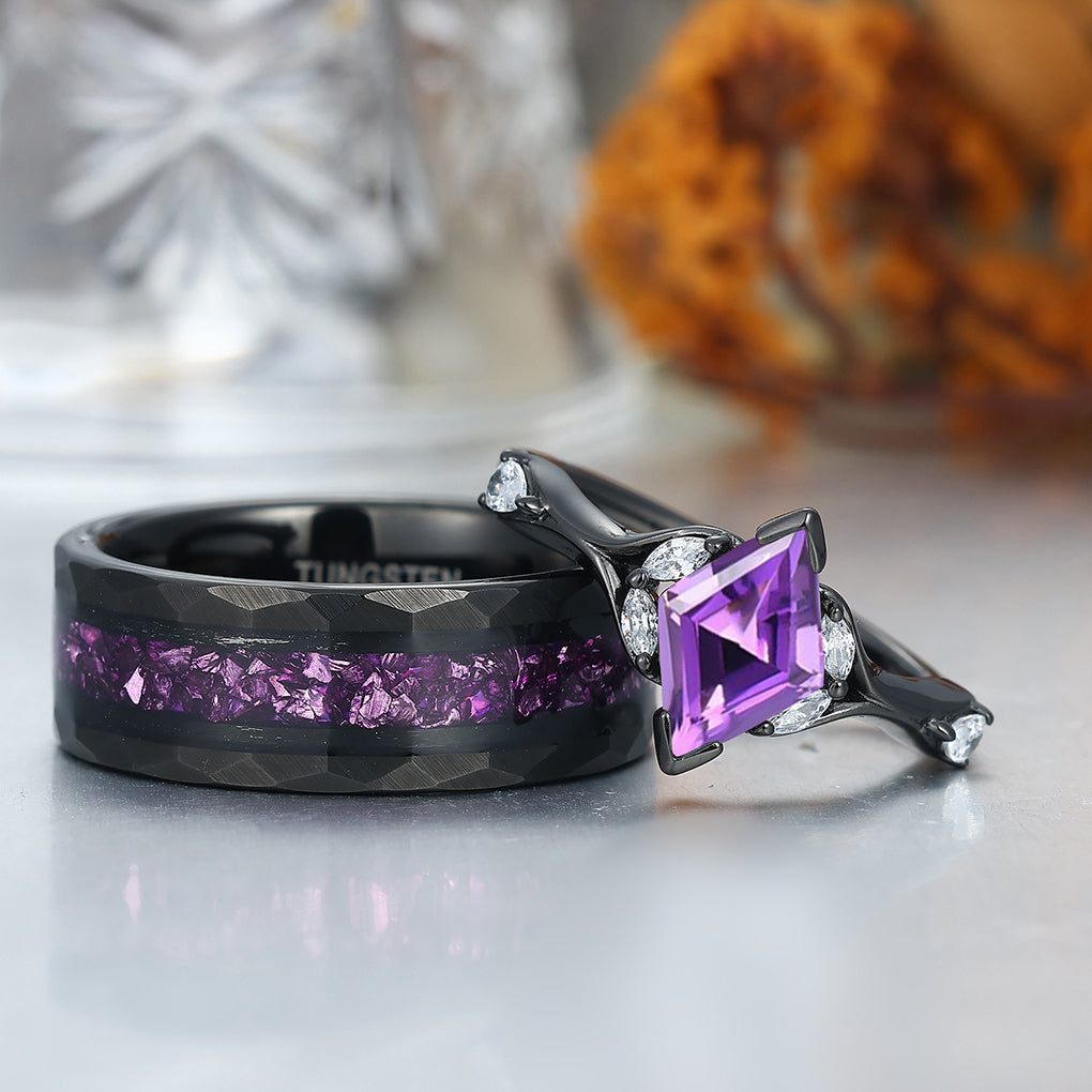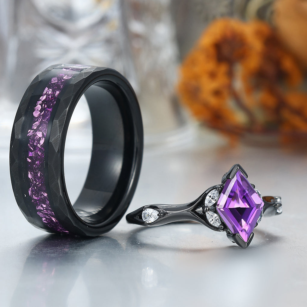 Stylish Rhombus Amethyst His And Her Wedding Bands Matching Hammered Personalized Couples' Set