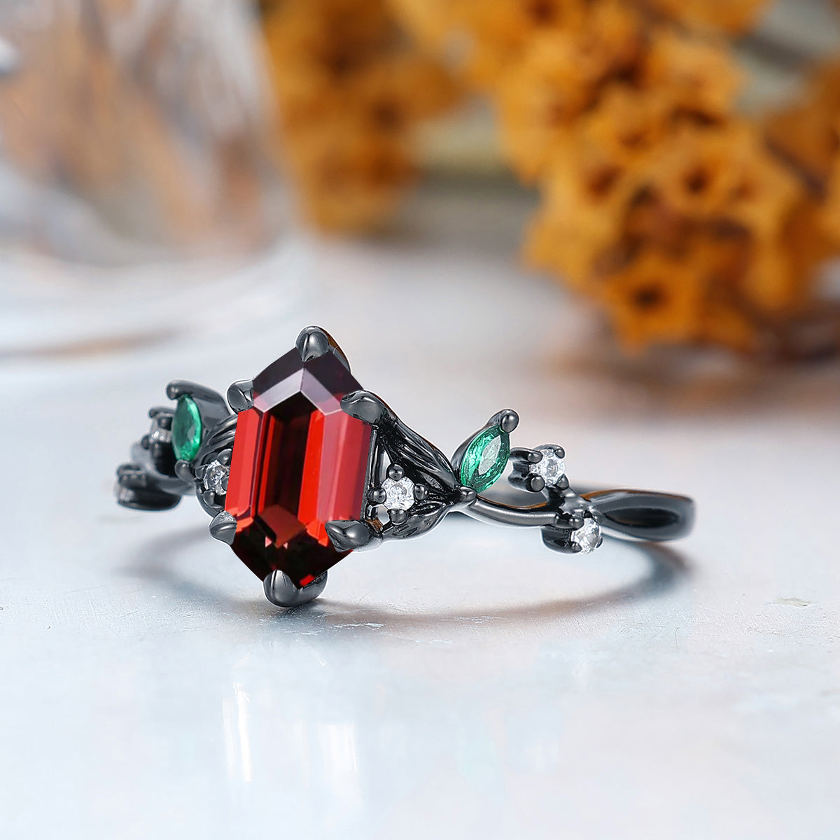 Unique 1.1 CT Long Hexagon Cut Red Garnet Art Deco Leaf Gold & 925 Sliver Engagement Ring