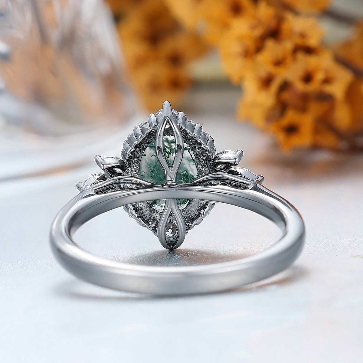 Unique 1.5ct Oval Cut Natural Moss Agate Ring All Around Moissanite Ladies Ring Women Dainty Rings