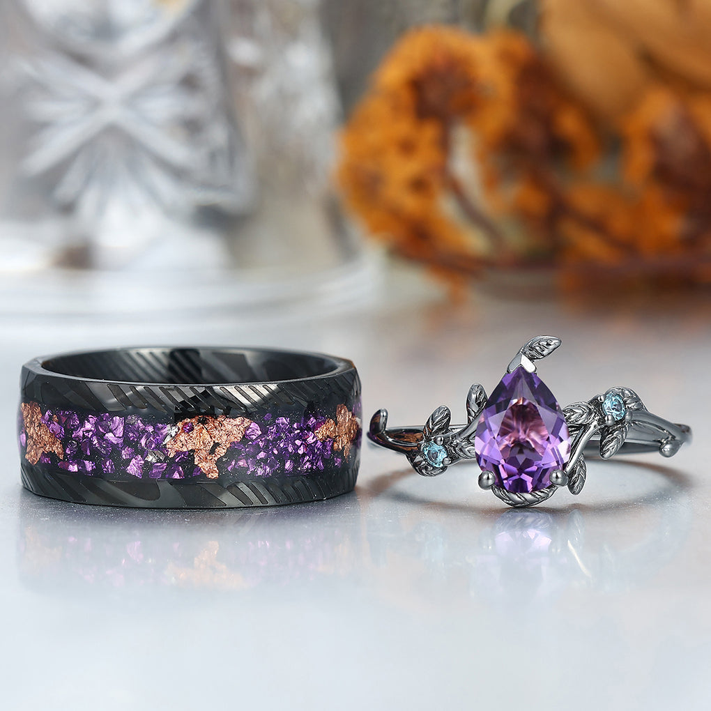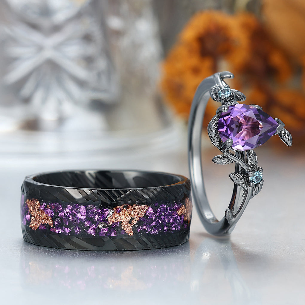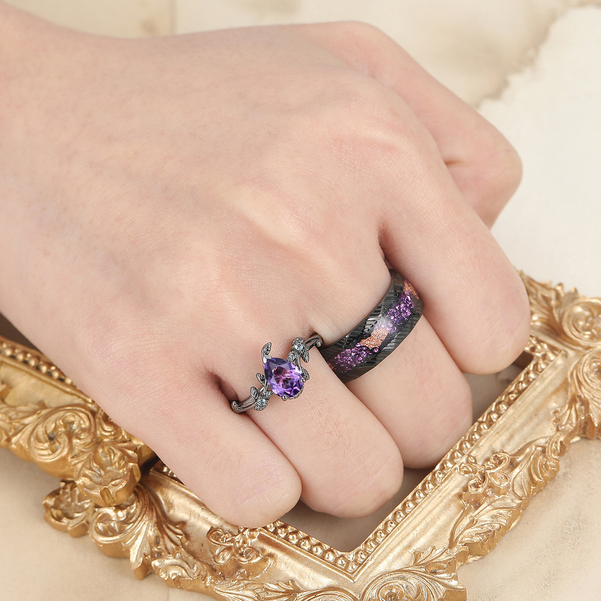 Unique Pear Cut Natural Amethyst Engagement Alexandrite Inlaid Couples Ring Set For Wedding Gift