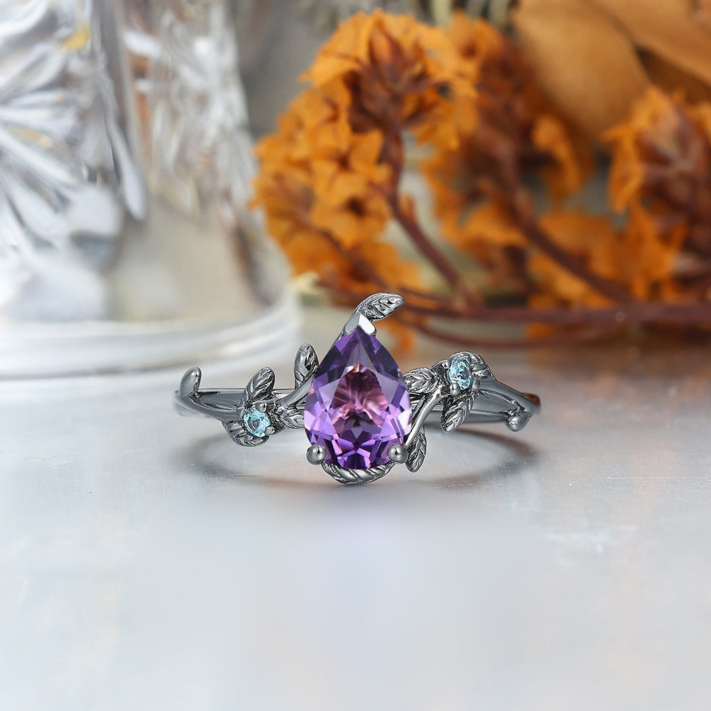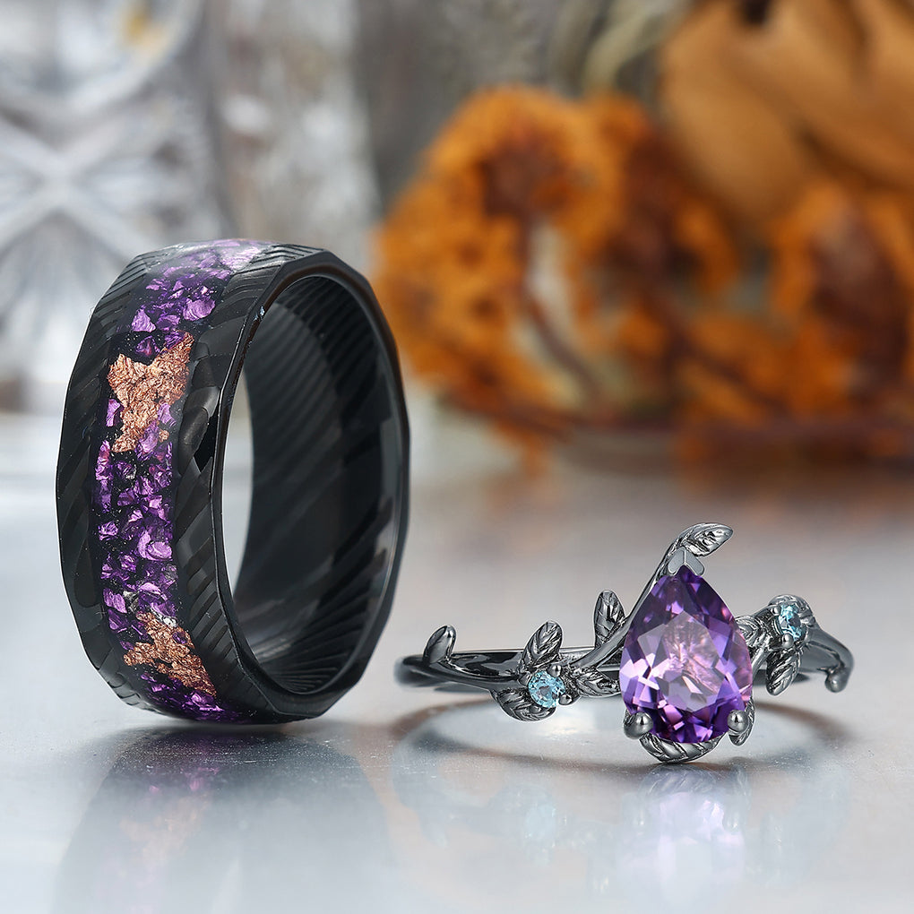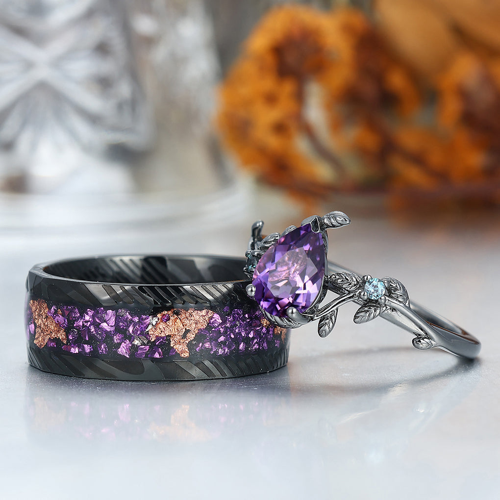Unique Pear Cut Natural Amethyst Engagement Alexandrite Inlaid Couples Ring Set For Wedding Gift