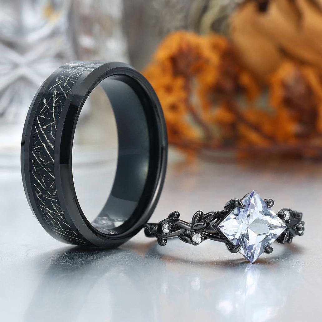 Unique Princess cut Engagement Couple Rings Tungsten Matching Promise His And Hers Wedding Band